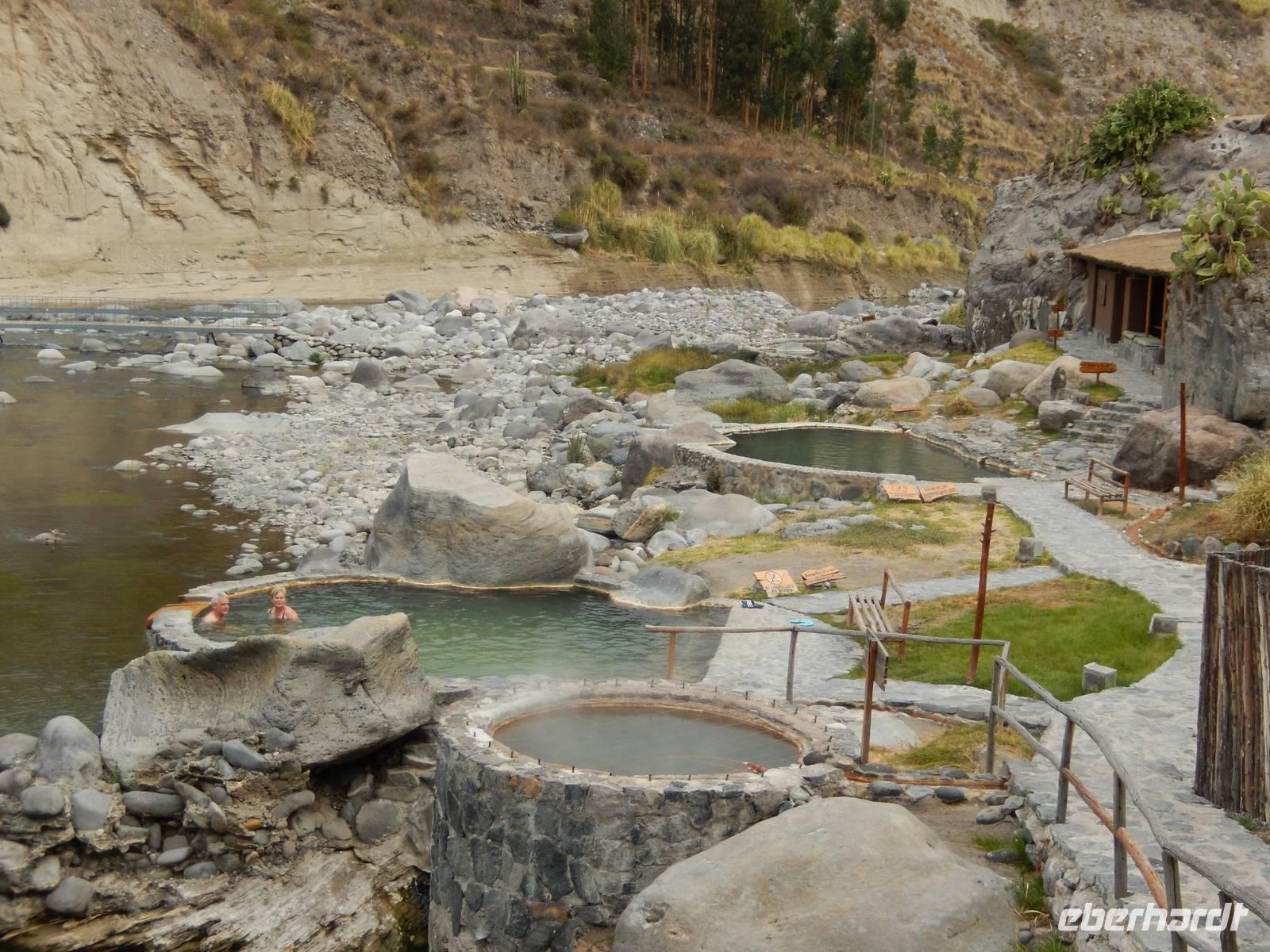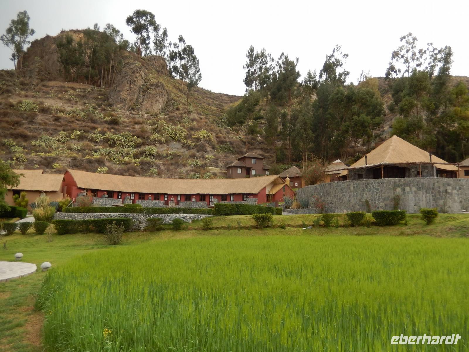Heute setzen wir unsere Reise ins Hochgebirge fort und sind gespannt, wie gut wir uns an die Höhe gewöhnen können. Von Anfang an tut Yudy wirklich alles, um uns optimal auf die Höhen vorzubereiten. Als Bergwanderführerin weiß sie, was uns erwartet, nur wir wissen es noch nicht so recht. Wir stoppen also zuerst an einem Laden, wo wir uns mit Cocabonbons und Wasser eindecken. Vor allem soll man viel trinken und bis zu einer Höhe von 3.500 Metern Zucker zu sich nehmen. Außerdem spendiert Eberhardt noch eine Tüte Cocablätter für jeden, die wir später zum Einsatz bringen werden. Wir fahren nun ins Hochland und den dazugehörigen Nationalpark ein und erleben eine faszinierende Landschaft. Das Wetter ist uns auch wohlgesonnen und so können wir scheinbar endlos über die Hochebenen zu den in der Ferne aufragenden Vulkanen schauen. Es begegnen uns die ersten Vicunas und Alpacas, die natürlich fotografiert werden müssen. In einer Höhe von 4.011 Metern rasten wir und ich spendiere zur weiteren Gewöhnung an die Höhe einen Triple-Tee, einen Kräutersud aus Coca-Blättern, Chachacoma und dem Thymian-ähnlichen Muna. So schlecht schmeckt es gar nicht stellen wir fest und allen geht es noch gut. Kurz nach der Weiterfahrt halten wir bei einer Alpaca-Herde um Fotos zu machen und Yudy kommt mit dem Hirtenjungen in Kontakt. David heißt er, hat als Lieblingsfach Mathematik und kämpft gerade mit der 5-er-Reihe der Multiplikation, will später mal Lehrer werden und ist ein ganz schüchterner Hochland-Bewohner. Sein größter Wunsch sind Turnschuhe und unsere Gruppe beweist ein großes Herz und „fördert" das Investitionsvermögen, um diesem Wunsch ein Stück näher zu kommen. Wir müssen allerdings unserem Tagesziel auch näher kommen, darum geht es weiter und nun lernen wir - wir sind jetzt auch hoch genug für die Anwendung - wie man Coca-Blätter richtig zu sich nimmt. Rollen, knicken, kauen - mit ca. 40 Blättern zeitgleich im Mund soll man der Höhenkrankheit entgehen. Wir reden uns zumindest ein, dass es wirkt und kauen (fast) alle fleißig. Da Toiletten im Hochland Mangelware sind, müssen wir auch einen Busch-Stopp einlegen („Männer links von der Straße, die Damen bitte rechts") und dann erwischt es bei gut 4.600 Metern Höhe die ersten mit Kopfschmerzen, Übelkeit und Schwindel. Die meisten müssen schwerer atmen oder laufen wie auf Watte. Yudy hat auch hier noch eine geheime Medizin mit, eine auf Kräuterbasis einem Riechsalz etwas ähnelnde und die Atemwege frei „brennende" Tinktur, die aber zumindest kurzzeitig sehr gut wirkt. Am höchsten Punkt unserer Etappe, dem Patapampa-Pass mit 4.910 Metern Höhe steigen dann auch nicht mehr alle aus, wobei gerade der Aussichtspunkt Mirador de los Vulcanos mit einem fantastisches Panorama der umliegenden sieben Vulkane lockt. Den höchsten Punkt haben wir geschafft, nun geht es wieder ca. 1.300 Meter nach unten, was die meisten sehr freut, aber dafür werden die Straßen zu unserer Colca-Lodge von Minute zu Minute schlechter und als wir endlich die Lodge erreichen, benötigen einige den angebotenen Sauerstoff wohl nicht nur wegen der Höhe... Wir checken ein in dieser wunderschönen Lodge, treffen uns dann noch zum späten Mittagessen und anschließend ist Ruhe auf ganzer Linie angesagt. Die meisten nehmen das wörtlich und geben dem Körper die Chance, sich besser an die neuen Verhältnisse zu gewöhnen, anderen geht es so gut, dass die hoteleigenen Thermalbäder ausgiebig getestet werden oder sogar im SPA-Bereich Anwendungen in Anspruch genommen werden. Die Lodge an sich ist schon ein Erlebnis, weil sich wundervoll in das Tal einpasst und traumhafte Fotomotive gewährt. Auf das Abendessen verzichten heute alle und gehen früh zu Bett. Das ist gut für die Akklimatisierung und morgen klingelt der Wecker wieder einmal sehr früh...