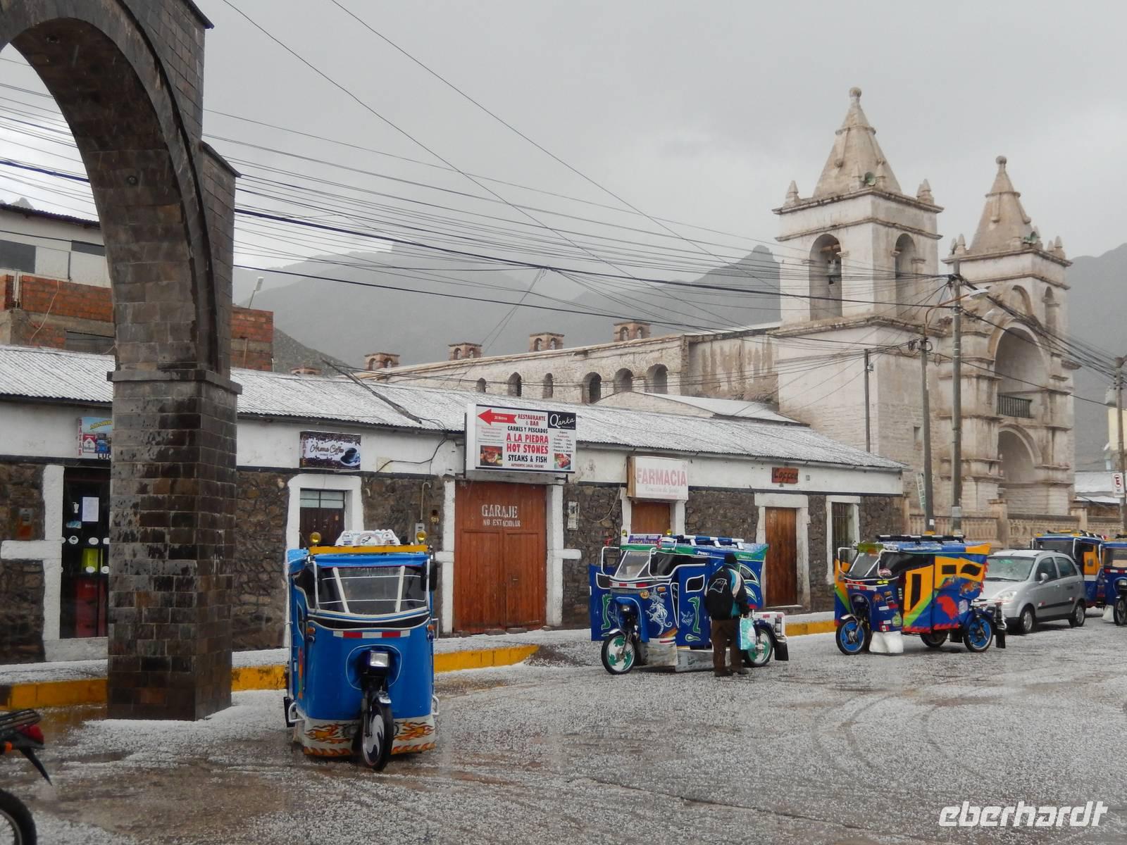 ... 05.00 Uhr ist es soweit, aber wir wollen heute DEN Vogel der Anden sehen, einen Kondor. Dafür müssen wir früh raus, denn die Kondore nutzen die Thermik am Morgen, um in ihre ungeahnten Höhen aufzusteigen. Frühstück gibt es rechtzeitig und so schaukeln wir in Richtung Aussichtspunkt Cruz del Condor. Erster Stopp wird das kleine Städtchen Yanque, wo bereits zu dieser frühen Zeit die Kirche geöffnet ist und auf dem Marktplatz reges Treiben herrscht. Zahllose Händler sind bereits unterwegs und Schulklassen tanzen in bunten Trachten traditionelle Tänze der Völker aus der Colca-Schlucht. Von hier aus haben wir auch einen fantastischen Blick auf den Vulkan Sabancaya, der tatsächlich ruhig vor sich hin raucht. Weiter geht es auf einer abenteuerlichen Straße u.a. durch den „Tunnel des Todes" in Richtung Cruz del Condor. Natürlich müssen wir zwischendurch stoppen, um die traumhaften Panoramen, die sich uns zeigen auf Bilder zu bannen und doch schaffen wir es bereits 07.30 Uhr am Aussichtspunkt zu sein. Und nun heißt es warten, denn einen „Fahrplan" haben die Kondore mit ihrer bis zu 3 Meter reichenden Flügelspanne nicht. Hier am Aussichtspunkt tummeln sich zahlreiche Schaulustige, um auf das einzigartige Erlebnis eines aufsteigenden Kondors zu warten. Und warten müssen wir, Ungeduld wird hier zur Falle. Nach zwei einzelnen Tieren in weiter Entfernung ist es dann nach über einer Stunde soweit und zeitgleich machen sich drei Tiere auf, die Thermik in der Colca-Schlucht zu nutzen und vor unseren Augen majestätisch gen Himmel zu segeln. Später können wir noch einen weiteren Vogel beobachten und dem einen oder anderen gelingt sogar ein Bild. Weil wir uns fast alle in der Höhe noch nicht ganz so topfit fühlen, entscheiden Yudy und ich, eine leichtere Wanderung entlang der Schlucht zu unternehmen, da die angedachte Wanderung zu alten Inka-Ruinen eventuell zu anstrengend wird. Wie sich später herausstellt, war die Entscheidung vollkommen richtig. Wir genießen fantastische Blicke in die Schlucht, auf kleine Bergdörfer, Yudy erklärt uns die Pflanzenwelt und wir kommen sogar an einem Platz für Tieropfer vorbei, wo zahlreiche Tierkadaver zu sehen sind. Nach dieser leicht anstrengenden Wanderung freuen sich alle wieder im Bus sitzen zu können und wir treten unsere Rückfahrt an. Zwischendurch stoppen wir in Maca, einem kleinen Dorf, wo wir dank Yudy die Möglichkeit haben, die Sancayo - die Kaktusfrucht - und das aus ihr gewonnene Erfrischungsgetränk zu probieren. Weiter führt uns die Fahrt dann nach Chivay, den größten Ort der Region, wo wir den Markt besuchen - immer ein spannendes Erlebnis, auch wenn wir nicht an jedem Stand kaufen würden... Bisher war uns der Wettergott sehr hold, doch was wir jetzt erleben, hat keiner erwartet. Plötzlich gibt es einen Gewitterguss mit Hagel, der die Straßen Chivays in wenigen Minuten weiß einfärbt... Wir „retten" uns zum Bus und fahren in unsere Lodge auf der Gegenseite des Tals. Wegen der Wetterkapriolen kann die fakultative Wanderung zu den Ruinen von Uyu Uyu jetzt nicht stattfinden - zu gefährlich - aber wir haben ja glücklicherweise unsere Wanderung schon bei schönstem Wetter erledigt. Wir sind am frühen Nachmittag im Hotel und sobald es aufgehört hat mit regnen, verbringt jeder die Freizeit wieder nach Lust und Laune: Spa-Besuch, Thermalbäder, Spazieren, Besuch auf der hoteleigenen Alpaca-Farm, Ruhen... Da heute keine Mahlzeit inkludiert war, treffen wir uns fast vollzählig zur Abendzeit im Restaurant und jeder darf heute mal ganz nach eigenem Geschmack bestellen.