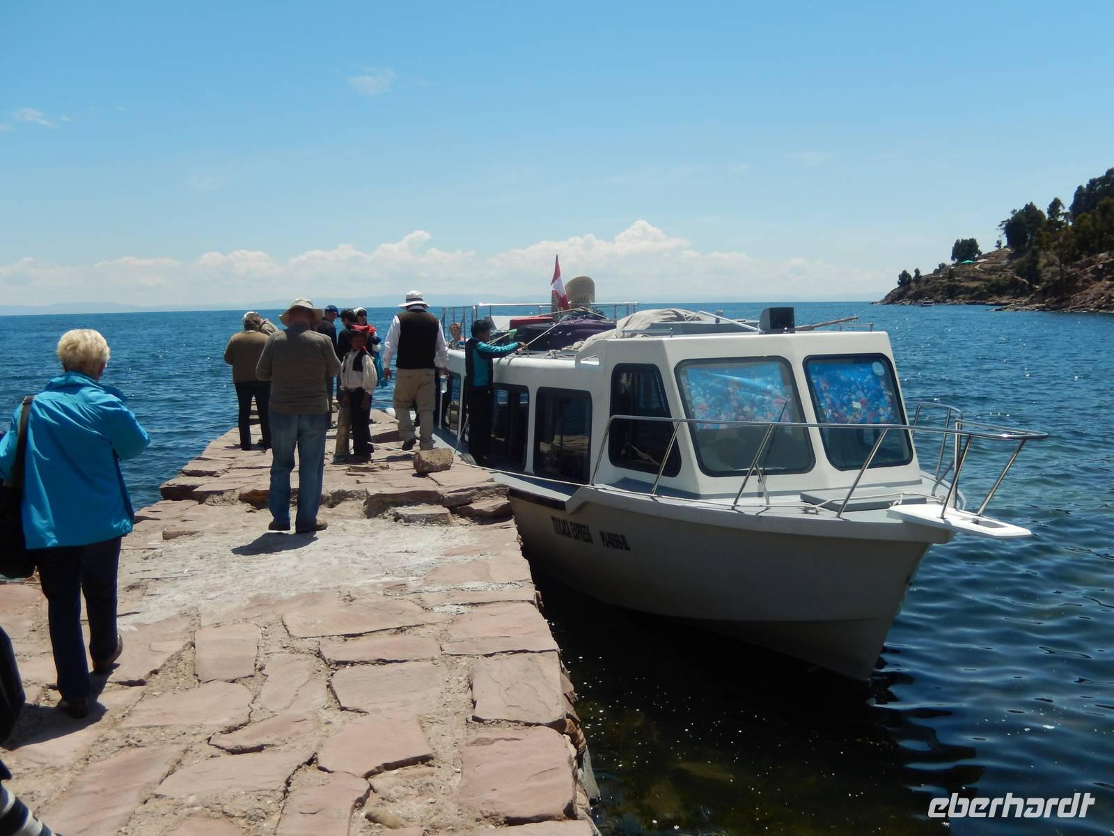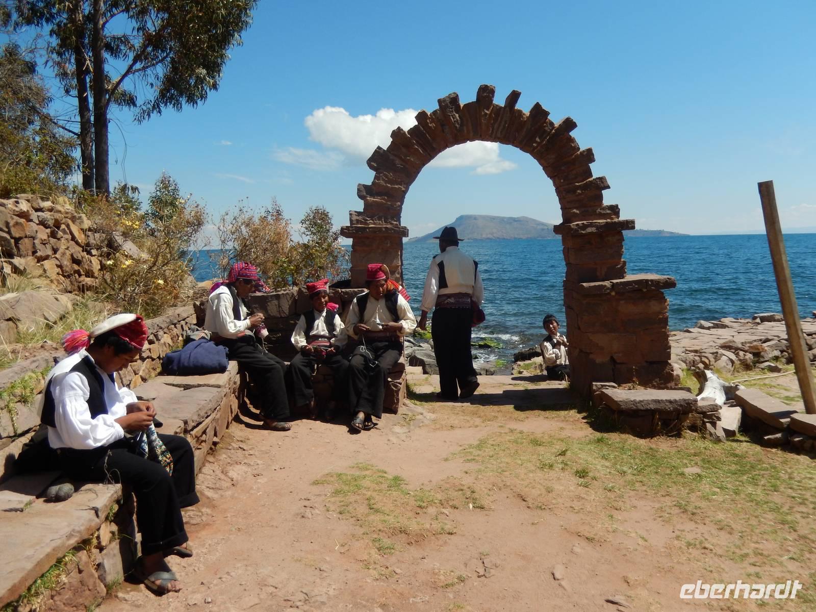... heute finden die kommunalen Bürgermeisterwahlen in der Region Puno statt. Um allem Trubel aus dem Weg zu gehen, heißt das für uns Start ab Hotel um 06.15 Uhr. Wir werden in zwei Kleinbussen zur privaten Anlegestelle der Hotelkette Casa Andina gebracht und starten mit unserem Gepäck in ein Boot auf den Titicaca-See. Unser Guide Gilvert erzählt uns alles Wichtige über den höchstgelegenen schiffbaren See der Welt, der mit 8.500 km² fast 16 x so groß wie der Bodensee ist. Nach einer guten halben Stunde legen wir an einer der faszinierenden schwimmenden Inseln an, für die das Volk der Uros so bekannt ist. Schon die ersten Schritte sind seltsam, denn die bewohnten Inseln bestehen aus Schilf. Wir erhalten einen ausführlichen Eindruck von der Lebensweise, dem Bau der Inseln und den Traditionen dieses Naturvolks. Der Chef der Insel, auf der 35 Personen von 10 Familien gemeinsam wohnen, Juancarlos erklärt uns persönlich alles und beantwortet unsere Fragen. Anschließend dürfen wir die Häuser, die alle 17 Wochen mit neuem Schilf ausgelegt werden müssen, besuchen und natürlich zeigen uns die Frauen der Kommune ihre Handarbeiten. Die meisten von uns trauen sich anschließend auch noch zu einer Bootsfahrt auf den klassischen Schilfbooten über die Lagune und fühlen sich dabei ein wenig wir Thor Heyerdahl. Nach diesem ersten Stopp geht es weiter nach Taquile, einer weiteren Insel, mitten im Titicaca-See. Hier werden wir ebenfalls mit den Traditionen vertraut gemacht und einer der Inselführenden erklärt uns die einzelnen Handarbeiten für die die Insel berühmt ist. Hier stricken die Männer, während die Frauen weben. Eine kleine Folklorevorstellung und dann müssen wir weiter, denn es werden verstärkte Winde angesagt und da unser Gepäck nur auf dem Dach des Schiffes festgezurrt ist, wäre es uns lieb, wenn wir auch nicht in den Regen kommen. Nach gut einer Stunde Fahrt erreichen wir dann endlich Suasi, eine Privatinsel mit einer schönen Hotelanlage, die für die nächsten beiden Nächte unser zu Hause sein wird. Nachdem alle Zimmer verteilt sind, stärken wir uns erstmal bei einem BBQ im Freien bevor jeder die Freizeit genießt. Einige gehen Spazieren und schießen Fotos, einige erholen sich einfach. Am Nachmittag unternehmen wir dann noch mit Raul, unserem englischsprachigen Guide, eine Wanderung, die uns allen trotz Höhe gut bekommt. Wir wandern auf den höchsten Punkt der Insel, Itapilluni, und genießen auf knapp 4.000 Meter Höhe einen traumhaften Sonnenuntergang über dem Titicaca-See, Noch ein Abendessen vom Buffet und dann verschwinden die meisten Gäste auf dem Zimmer, schließlich wir gegen 22 Uhr der Strom abgestellt. Steckdosen findet man übrigens auch nur im Bereich der Rezeption, wo diverse Kameras, Smartphones und sonstige Akkus einträchtig nebeneinander laden.