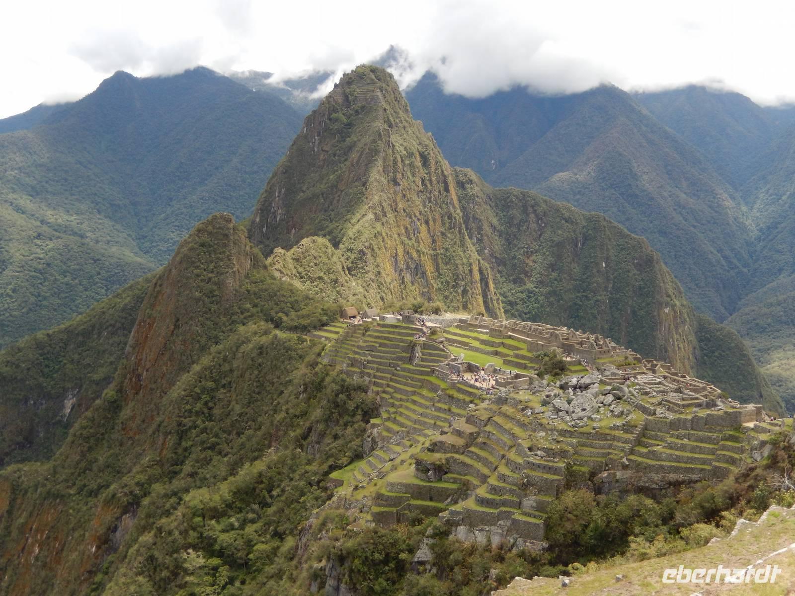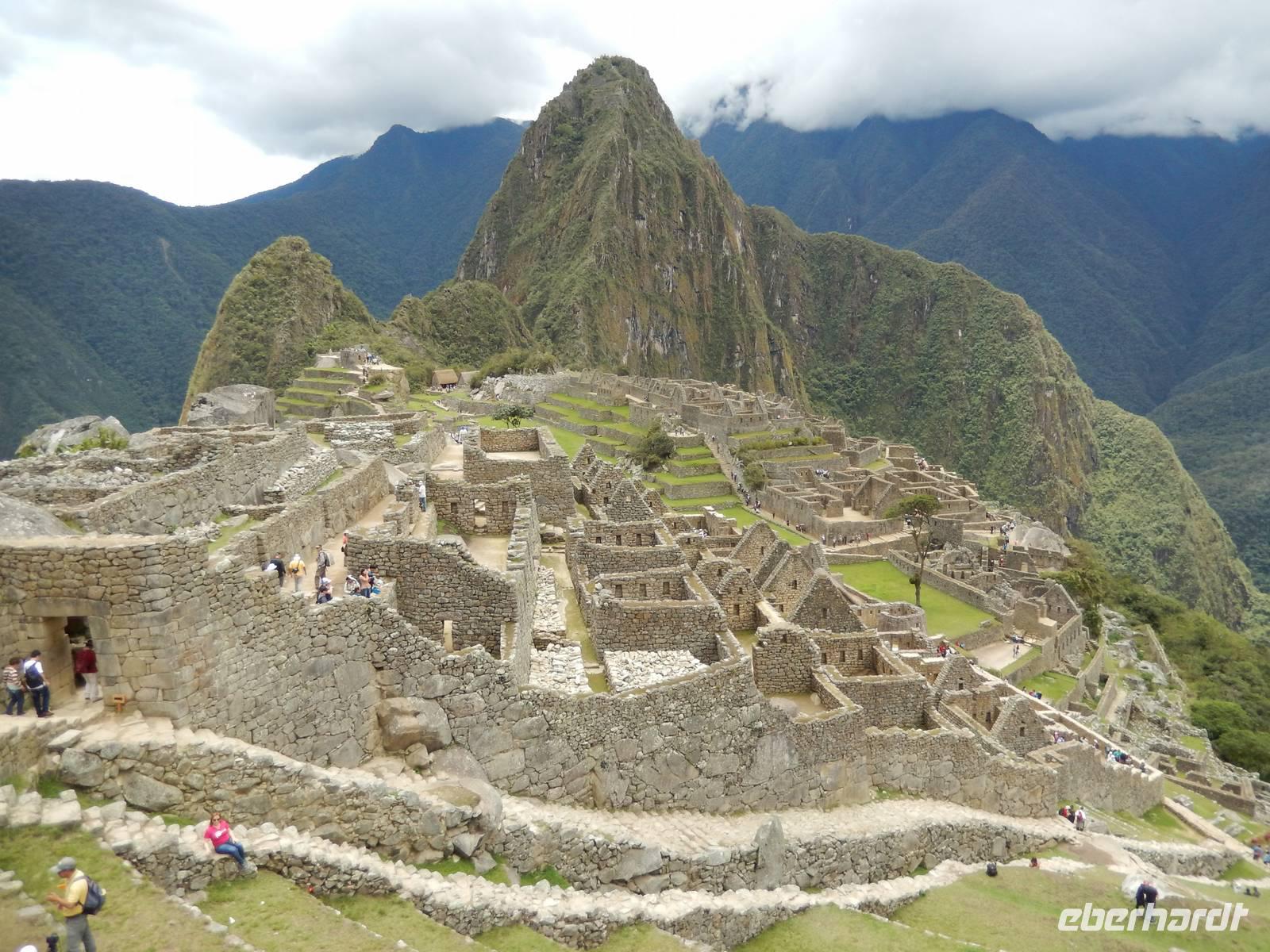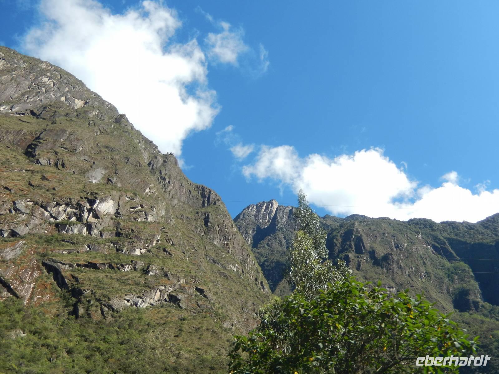Heute erwartet uns einer der absoluten Höhepunkte der Reise und so sind wir hochmotiviert noch vor 7 Uhr bereit, dem Mythos Machu Picchu näher zu kommen. Mit unserem Handgepäck geht es zuerst mit dem Bus zurück nach Ollantaytambo, wo wir dann in den Zug nach Aguas Calientes umsteigen. In der Hochsaison verkehren täglich 22 Verbindungen von/nach Aguas Calientes. Wir sitzen im Waggon A, direkt hinter der Lokomotive und nachdem die Pässe und Fahrscheine kontrolliert wurden, können wir starten. Mit Hintergrundmusik aus den Anden gleiten wir vorbei an schneebedeckten Gipfeln, Stromschnellen und später durch urwüchsigen Wald. Zwischendurch wird ein kleiner Snack serviert. Durch die Panoramafenster im Dach des Waggons können wir tolle Ausblicke erhaschen und während wir immer entlang des Rio Urubamba gen Aguas Calientes fahren, bietet sich das eine oder andere Fotomotiv. Pünktlich nach 90 Minuten sind wir da und spazieren mit unserem Handgepäck zum Hotel für die kommende Nacht, wo wir dies unterstellen können, bis wir zurück sind. Und nun geht es los: Fahrt zur legendären Stadt Machu Picchu - wobei Stadt hier schon wieder falsch wäre, denn überliefert ist nur, dass der massive Berg im Hintergrund der Inkastätte Machu Picchu = alter Berg so genannt wurde. Ab Aguas Calientes verkehren permanent Shuttle-Busse zur Weltkulturerbestätte der UNESCO. Etwas waghalsig winden sich die Busse die Serpentinen hinauf bzw. hinab. Schon hier bieten sich uns spektakuläre Blicke auf die bewaldeten Hänge und endlosen Täler des Urwaldes. Nach gut 20 Minuten Fahrt erreichen wir dann endlich Machu Picchu und auch an diesem Tag spielt das Wetter mit: nicht zu heiß, aber doch sonnig, ideal für Entdeckungen.