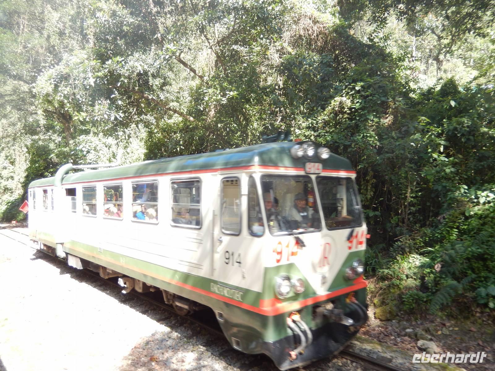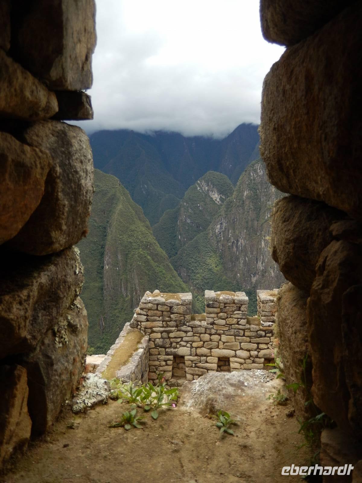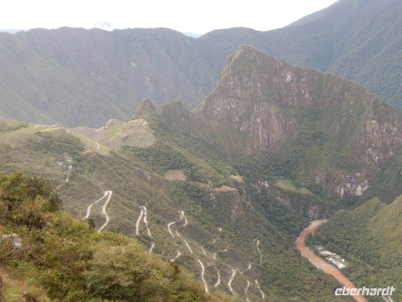 Heute erwartet uns einer der absoluten Höhepunkte der Reise und so sind wir hochmotiviert noch vor 7 Uhr bereit, dem Mythos Machu Picchu näher zu kommen. Mit unserem Handgepäck geht es zuerst mit dem Bus zurück nach Ollantaytambo, wo wir dann in den Zug nach Aguas Calientes umsteigen. In der Hochsaison verkehren täglich 22 Verbindungen von/nach Aguas Calientes. Wir sitzen im Waggon A, direkt hinter der Lokomotive und nachdem die Pässe und Fahrscheine kontrolliert wurden, können wir starten. Mit Hintergrundmusik aus den Anden gleiten wir vorbei an schneebedeckten Gipfeln, Stromschnellen und später durch urwüchsigen Wald. Zwischendurch wird ein kleiner Snack serviert. Durch die Panoramafenster im Dach des Waggons können wir tolle Ausblicke erhaschen und während wir immer entlang des Rio Urubamba gen Aguas Calientes fahren, bietet sich das eine oder andere Fotomotiv. Pünktlich nach 90 Minuten sind wir da und spazieren mit unserem Handgepäck zum Hotel für die kommende Nacht, wo wir dies unterstellen können, bis wir zurück sind. Und nun geht es los: Fahrt zur legendären Stadt Machu Picchu - wobei Stadt hier schon wieder falsch wäre, denn überliefert ist nur, dass der massive Berg im Hintergrund der Inkastätte Machu Picchu = alter Berg so genannt wurde. Ab Aguas Calientes verkehren permanent Shuttle-Busse zur Weltkulturerbestätte der UNESCO. Etwas waghalsig winden sich die Busse die Serpentinen hinauf bzw. hinab. Schon hier bieten sich uns spektakuläre Blicke auf die bewaldeten Hänge und endlosen Täler des Urwaldes. Nach gut 20 Minuten Fahrt erreichen wir dann endlich Machu Picchu und auch an diesem Tag spielt das Wetter mit: nicht zu heiß, aber doch sonnig, ideal für Entdeckungen.
