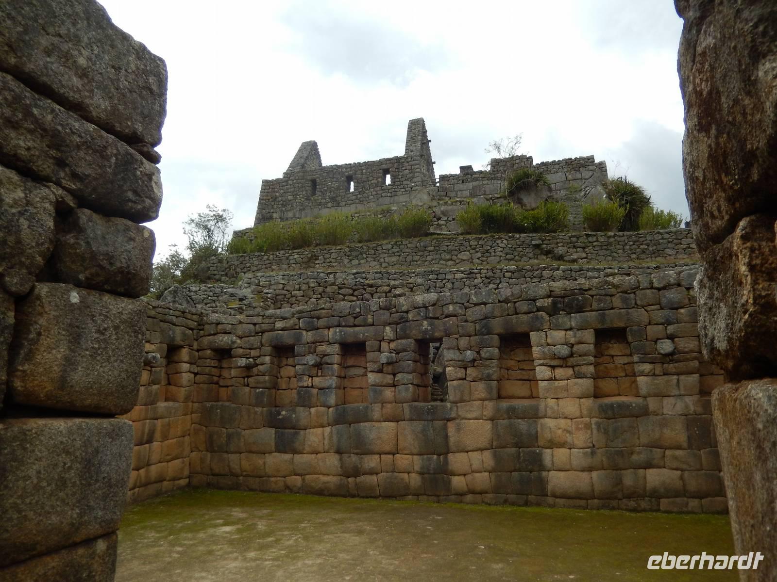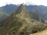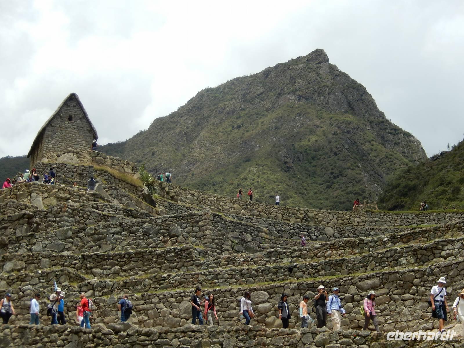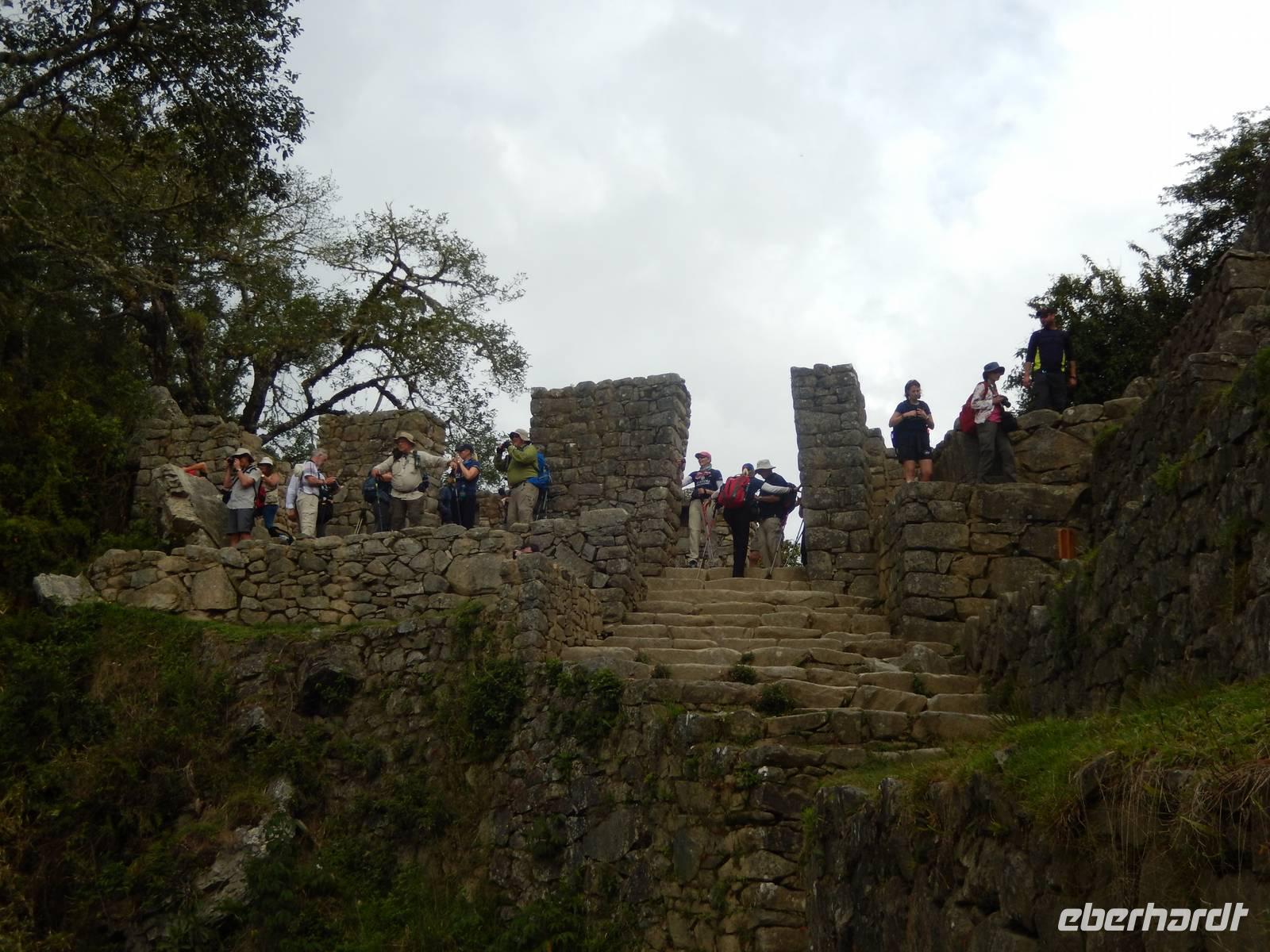 Und dann geht es endlich los. Zuerst heißt das Passkontrolle, Ticketkontrolle und auf geht's mit Treppensteigen. Steil im Hang und unterschiedlich groß, rauben sie uns gleich von Beginn an den Atem. Aber dann ist das alles vergessen und unser Atem wird nur noch vom klassischen Anblick eines der „neuen Sieben Weltwunder" geraubt. Fasziniert schauen wir auf die damals für bis zu 900 Leute gebaute Stadt, die nie von den Spaniern und auch für die Öffentlichkeit erst 1911 entdeckt wurde. Es ist etwas schwer zu beschreiben, aber man steht einfach da und staunt - ok die Fotoapparate laufen heiß, aber ansonsten genießt man einfach diesen Anblick. Jorge treibt uns aber weiter an und weiter hinauf bis wir eine ganz ruhige Terrasse erreichen, die wir für eine Verschnaufpause, ein Gruppenbild und vielfältige Erläuterungen unseres Reiseleiters nutzen. Anschließend geht es treppab und treppauf und wir lernen die ehemalige Stadt der Inka und deren Überreste ausführlich kennen. Wir besuchen die verschiedenen Tempel, die man vermutet, Wohn- und Lagerhäuser, Grabstätten, Werkstätten, Ritualplätze, Ackerflächen, Wachhäuschen und noch vieles mehr. Überall kann Jorge uns Erklärungen geben und am Ende dürfte keine Frage unbeantwortet geblieben sein. Begleitet von einigen Gewittern in den umliegenden Tälern, die der Besichtigung erst recht einen mystischen Touch geben, sind wir so 4 (!!!) Stunden gemeinsam unterwegs. Dann muss Jorge los, da er die Gruppe heute verlässt und mit dem Zug zurückkehrt, einige begleiten ihn zum Hotel zurück, um die Strapazen der Führung etwas zu lindern. Übrig bleiben 7 Gäste - darunter mit Eva und Petra auch zwei Damen - die scheinbar noch nicht genug haben und am Nachmittag den Aufstieg zum Sonnentor auf 2.720 Meter wagen wollen, Nach der Führung nochmal 1 Stunde ordentlich bergauf auf nicht unbedingt optimalen Wanderwegen... ich weiß nicht, was mich geritten hat, hier dabei sein zu wollen. Aber wer weiß, ob man jemals nach Machu Picchu zurückkehrt. Also machen wir uns auf und kämpfen uns dem Sonnentor entgegen. Ich gebe zu, es war eine harte Wanderung und ich musste den ehemaligen Leistungsportler und dessen Kampfgeist in mir ganz schön bemühen, um nicht zwischendurch aufzugeben. In jedem Fall haben sich am Sonnentor acht glückliche Bezwinger des Weges getroffen, die mit einem trauhaften Blick auf 90 % der Gesamtanlage von Machu Picchu belohnt wurden. Leider setzte sich nun doch einer leichter Regen durch und wir traten den Rückweg an, aber über 6 Stunden im Gelände von Machu Picchu sind dann auch ausreichend. Noch schnell ein - teures - Bier aus medizinisch-isotonischen Gründen versteht sich und per Shuttlebus ging es zurück in die Stadt. Nach einer ausgiebigen Dusche und einem Abendessen oberster Güte - leider ist der Geräuschpegel im Restaurant ähnlich einer Bahnhofshalle - verschwinden wir dann schnell auf den Zimmern, um die müden Knochen zu schonen. Es bleibt aber festzuhalten: Machu Picchu ist ein absoluter Höhepunkt, sehendswert und unbedingt weiter zu empfehlen.