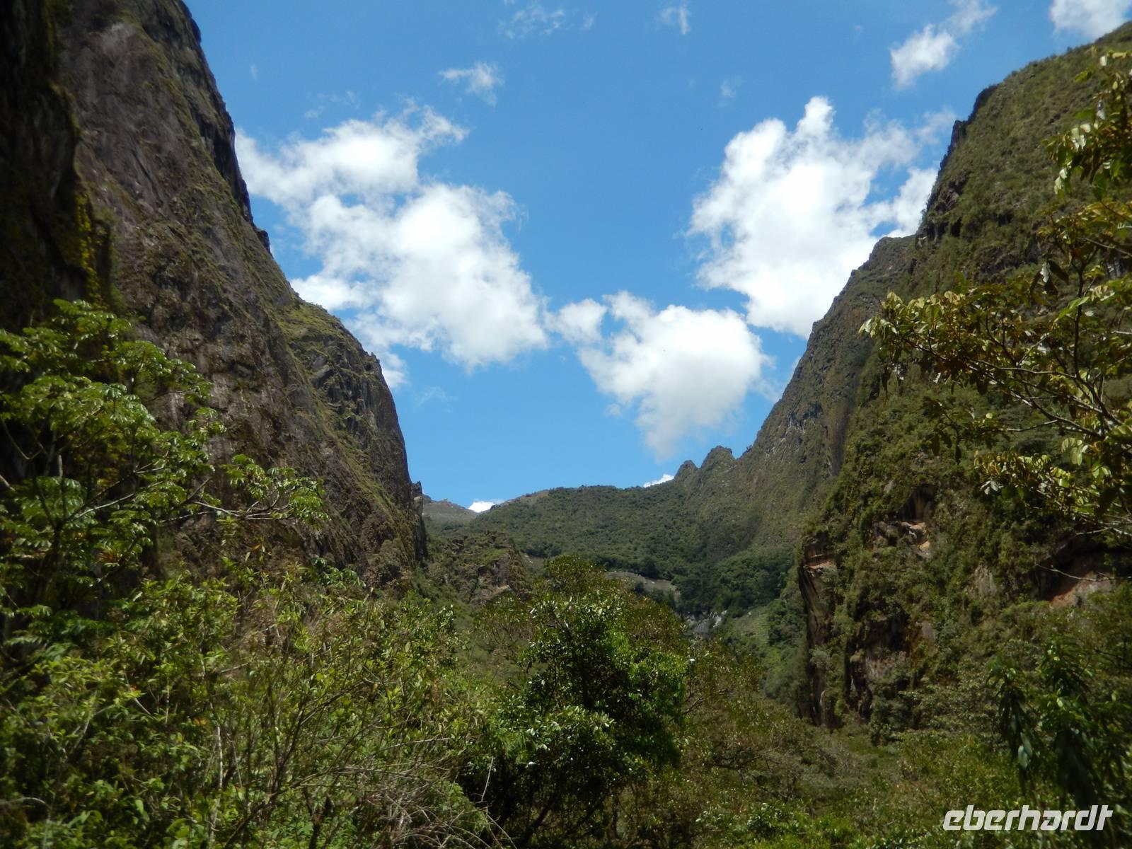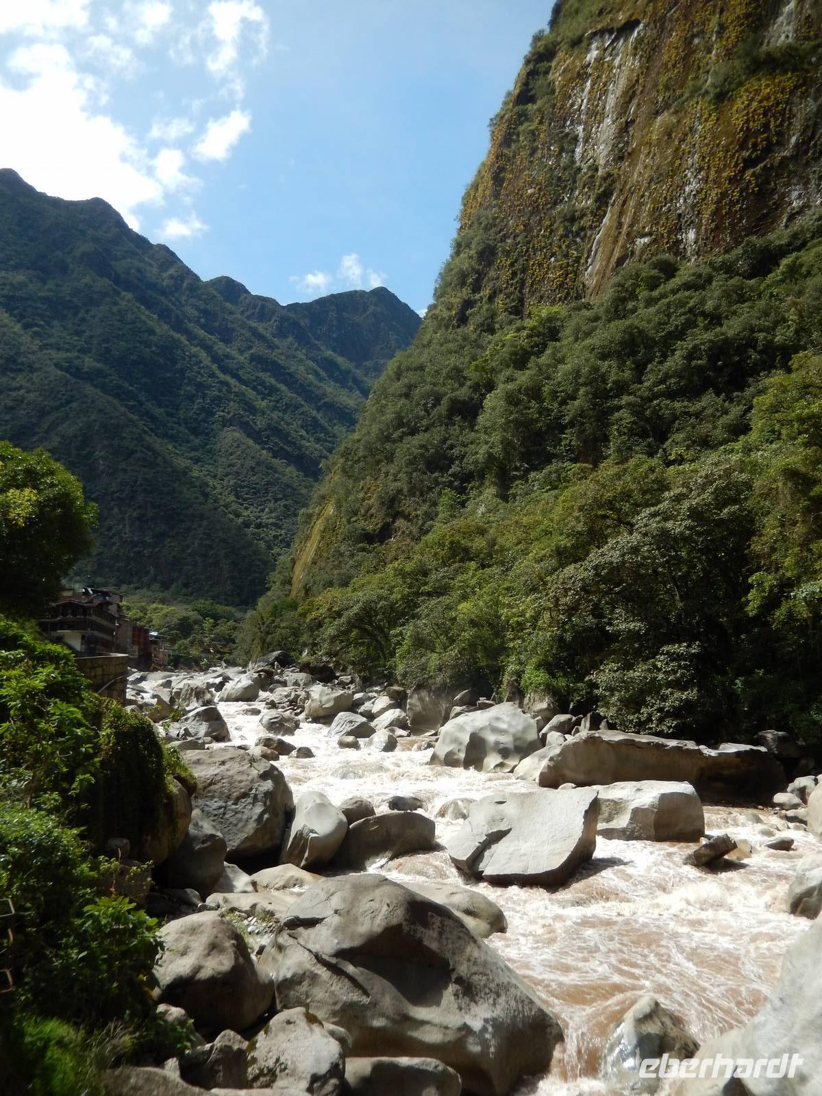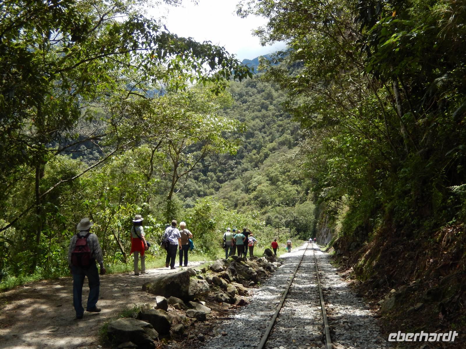 Den heutigen Tag lassen wir ganz geruhsam angehen, denn wir müssen unsere Kräfte nach dem gestrigen Tag erst wieder auftanken. Eigentlich wollte Familie Keiger heute den zweiten Beuch in Machu Picchu inklusive dem Aufstieg auf den Huayna Picchu, den „neuen Berg" wagen, doch leider verhindert der Gesundheitszustand dies. Der markante Felsen im Gebiet von Machu Picchu wäre mit einem Aufstieg von knapp 300 Metern verbunden, nur 400 Gäste pro Tag dürfen den Berg überhaupt besteigen. Die Gesundheit geht aber vor, auch wenn das verlorene Geld, welches man nicht ersetzt bekommt, schmerzt. So gehen wir alle gemeinsam auf eine reichlich vierstündige Wanderung... Diesmal allerdings entlang des Flusses Urubamba und somit auf relativ flachem Terrain. Zum einen vertreibt das den Muskelkater, zum anderen lernen wir so den Urwald noch etwas kennen. Allerdings brennt die Sonne heute teilweise unerbittlich, so dass wir auch auf dem flachen Weg zu kämpfen haben. Außerdem führt der Weg nachdem wir die Stadt verlassen haben entlang der Bahnschienen und somit auf Terrain, was nicht so schön zu laufen ist. Entlang des Flusses können wir trotzdem die wunderschöne Natur genießen und nochmals Blicke gen Machu Picchu richten, nicht ohne Stolz, was wir gestern geleistet haben. Je näher wir unserem Ziel kommen, dem Wald von Mandor mit dem gleichnamigen Wasserfall, desto (sub)tropischer wird die Luft. Dies strengt uns alle etwas an, aber wir sind ja inzwischen lauferprobt. Am Eingang zu den letzten Metern zahlen wir 10 Sol Eintritt ins Naturreservat und dann kämpfen wir uns durch tropische Pflanzen, über eine kleine Hängebrücke und entlang von Kaskaden nochmal 20 Minuten den Berg hinauf. Zum Glück lassen wir uns von einem Rinnsal nicht täuschen und gehen auch noch die letzten Meter zum Wasserfall. Eine schöne, wenn auch anstrengende Wanderung und allemal besser als im Hotel zu sitzen. Nach einer kleinen Rast starten wir dann den Rückweg nach Aguas Calientes, natürlich warten wir aber eines der üblichen kleinen Gewitter erst noch ab. Zwischendurch fahren tatsächlich Züge auf den Bahngleisen, denen wir ausweichen müssen. Erschöpft kommen wir im Hotel an wo dann jeder noch etwas Zeit hat, bevor es zum Bahnhof geht und wir die Strecke zurück nach Ollantaytambo in Angriff nehmen. Mit etwas Verspätung erwartet uns dort Elvis unser Busfahrer. Ollantaytambo wird uns als verkehrschaotischste Stadt in Erinnerung bleiben, denn wir brauchen allein 15 Minuten, um vom Parkplatz aufbrechen zu können. Anschließend geht es dann geradewegs nach Cusco, doch kurz vor der Stadt verlässt uns unser Glück und wir geraten in einen einstündigen Stau. Geschuldet ist dies in Peru vor allem der chaotischen Fahrweise der meisten, denn eine erkennbare Störung gibt es nicht. Ziemlich genervt kommen wir verspätet in Nähe des Hauptplatzes an, wo uns Alex von der Agentur schon erwartet. Einen kleinen Aufreger vorm Abendessen gibt es dann noch, als eine gemischte Gruppe von Franzosen und Niederländern unseren Bus besteigen will, in der Meinung, es wäre ihr Transfer. Nach kurzen, teils hitzigen Diskussionen gehen wir dann aber endlich vollkommen erschöpft zum Abendessen. So richtig können wir um die Zeit unser letztes Abendessen in Peru auch nicht genießen, zumal in überdimensionierter Lautstärke Musik und Tanz dargeboten wird. Nach kurzem, intensivem Essen fahren wir dann also endlich zurück in unser Hotel, wo wir schon 3 Tage zuvor gewohnt haben. Die Koffer stehen schon auf den Zimmern und so verschwinden alle ziemlich schnell.