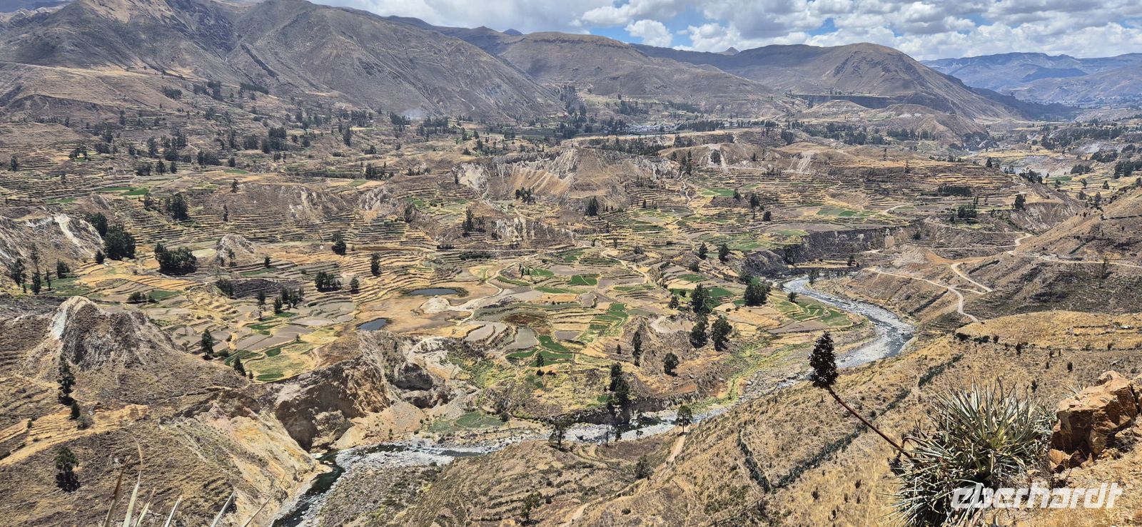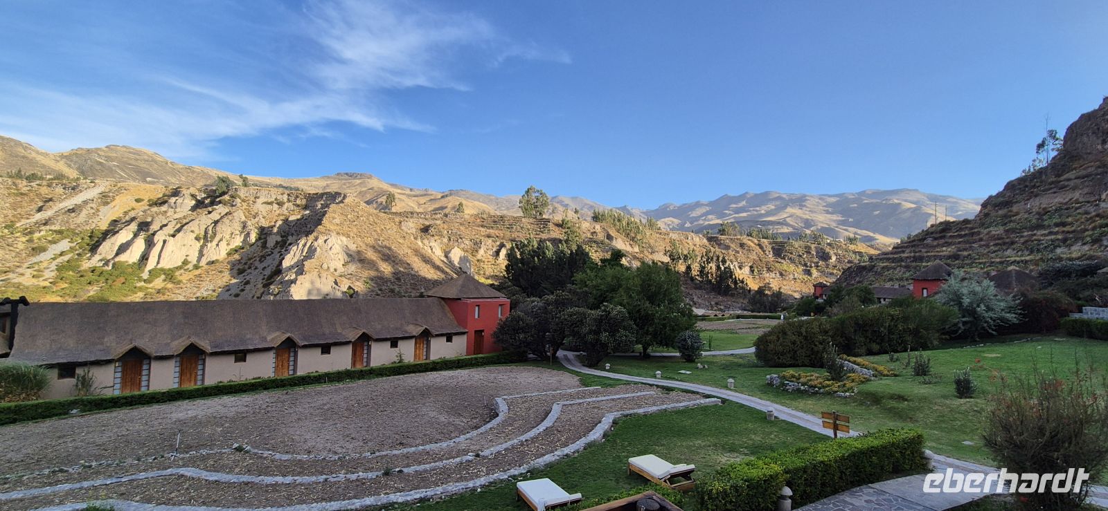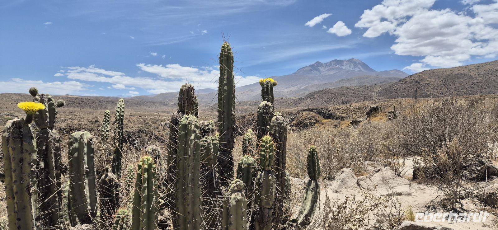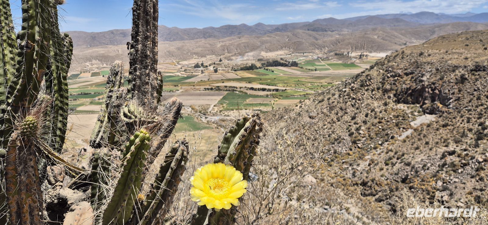 Heute brechen wir auf ins legendäre Colca-Tal – eine der beeindruckendsten Regionen der peruanischen Anden. Schon kurz nach der Abfahrt zeigt sich die Landschaft von ihrer schönsten Seite: sanft geschwungene Hochebenen, steinige Hügel und immer wieder leuchtende Tupfer von Kakteen, einige davon in voller Blüte. Während wir langsam an Höhe gewinnen, begegnen wir den eleganten Vicunas – den zartgliedrigen Wildkamelen der Anden, deren Wolle zu den feinsten der Welt zählt. Neben ihnen sehen wir auch Guanakos und Alpakas, die friedlich auf den weiten Flächen grasen. Die Strecke führt uns bis auf rund 4000 Meter Höhe, wo sich das Panorama noch einmal verändert: Das Licht wird klarer, die Luft kühler, und die Vegetation karger. Dennoch entdecken wir zwischen Felsen und Geröll immer wieder überraschend kräftig blühende Kakteen – kleine Farbtupfer in der weiten Hochgebirgslandschaft. Zum Mittagessen kehren wir in Chivay auf etwa 3600 Metern ein. Wir genießen das reichhaltige Buffet mit regionalen Spezialitäten und setzten gestärkt unsere Fahrt fort . Kurz danach erreichen wir das Colca-Tal, das mit seinen grünen Terrassenfeldern, tief eingeschnittenen Schluchten und dampfenden Thermalquellen sofort begeistert. Am Horizont noch dazu der aktive Vulkan Sabancaya mit 5900 m Höhe, der Rauch in die Höhe bläst-ein sehr imposanter Anblick. Nun erreichen wir unsere Colca Loge, die idyllisch inmitten der Natur liegt, umgeben von den majestätischen Anden. Wir genießen die Ruhe, die klare Luft und den Blick auf die umliegenden Berge – ein perfekter Ort, um den Tag ausklingen zu lassen.
