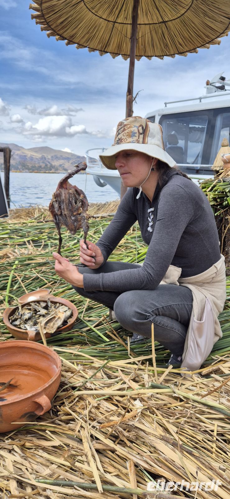 Heute erwartet uns ein unvergesslicher Tag auf dem Titikakasee, dem höchstgelegenen schiffbaren See der Welt. Unsere neue Reiseleiterin Inka begleitet uns nun die nächsten beiden Tage und mit ihr geht es auf zum Hafen von Puno. Ein Boot nur für unsere Gruppe wartet bereits – wir haben jede Menge Platz, Sonne, Wind und das glitzernde Blau des Sees um uns herum. Schon bald tauchen vor uns kleine, schwimmende Inseln auf – die berühmten Uros-Inseln, ganz aus Schilf erbaut. Es ist faszinierend, wie die Bewohner diese künstlichen Inseln auf dem Wasser erschaffen und am Leben halten. Während uns ein Uro erklärt, übersetzt Inka uns , wie das Totora-Schilf nicht nur als Baumaterial dient, sondern auch gegessen und für Boote verwendet wird. Wir dürfen selbst Hand anlegen und spüren, wie weich und federnd der Boden unter unseren Füßen ist. Einige von uns begeben sich auf eine kurze Fahrt auf einem traditionellen Schilfboot – ein ganz besonderes Erlebnis, begleitet vom leisen Plätschern der Wellen und dem Lächeln unserer rudernden Gastgeber. Weiter geht es zur Insel Taquile, die für ihre jahrhundertealten Traditionen bekannt ist. Die Männer, die hier im Übrigen auch stricken, tragen stolz ihre handgestrickten Mützen – jede Farbe und Form erzählt eine Geschichte über Familienstand und Herkunft. Man zeigt uns, wie aus Pflanzen natürliche Seifen hergestellt wird und wie farbenfrohe Textilien entstehen. Ein folkloristischer Tanz mit schönen Kostümen darf natürlich nicht fehlen. Wir genießen ein köstliches Mittagessen mit fangfrischer Forelle und blicken dabei über die terrassierten Hänge hinunter auf den schimmernden See – ein Panorama, das man so schnell nicht vergisst. Am Nachmittag erreichen wir Luquina Chico, eine kleine Gemeinde der Quechua. Herzlich und mit strahlenden Gesichtern begrüßen uns unsere Gastfamilien. Jeder von uns wird in einem einfachen, aber liebevoll eingerichteten Haus untergebracht. Wir haben Zeit, das Dorf zu erkunden oder einfach die Ruhe zu genießen, bevor wir in der Küche mithelfen dürfen. Es wird geschnippelt und gelacht – Sprache ist hier keine Barriere, mit Händen und Füßen kommen wir gut klar. Beim gemeinsamen einheimischen Abendessen im Gemeinschaftsraum – Gemüsesuppe, Reis mit frischem Gemüse und duftender Kräutertee – ein tolles Erlebnis für uns alle.