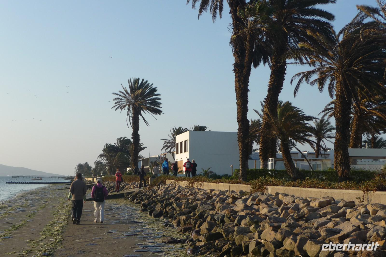 Anschließend fahren wir zu unserem Hotel „La Hacienda" und machen einen kurzen Spaziergang durch die Hotelanlage, genießen etwas die Sonne bevor wir die Zimmer beziehen können.Am Nachmittag fahren wir in das Nationalreservat von Paracas. Wir bestaunen die Wüstenlandschaft direkt an der Küste und besuchen das Museum. Nach einer kurzen Strecke mit dem Bus steigen wir aus und laufen bei langsam untergehender Sonne am Meer entlang zu einem Restaurant wo wir erst einmal die peruanische Speisekarte studieren. Hier gibt es die erste Möglichkeit das Nationalgetränk Pisco Sour zu probieren.