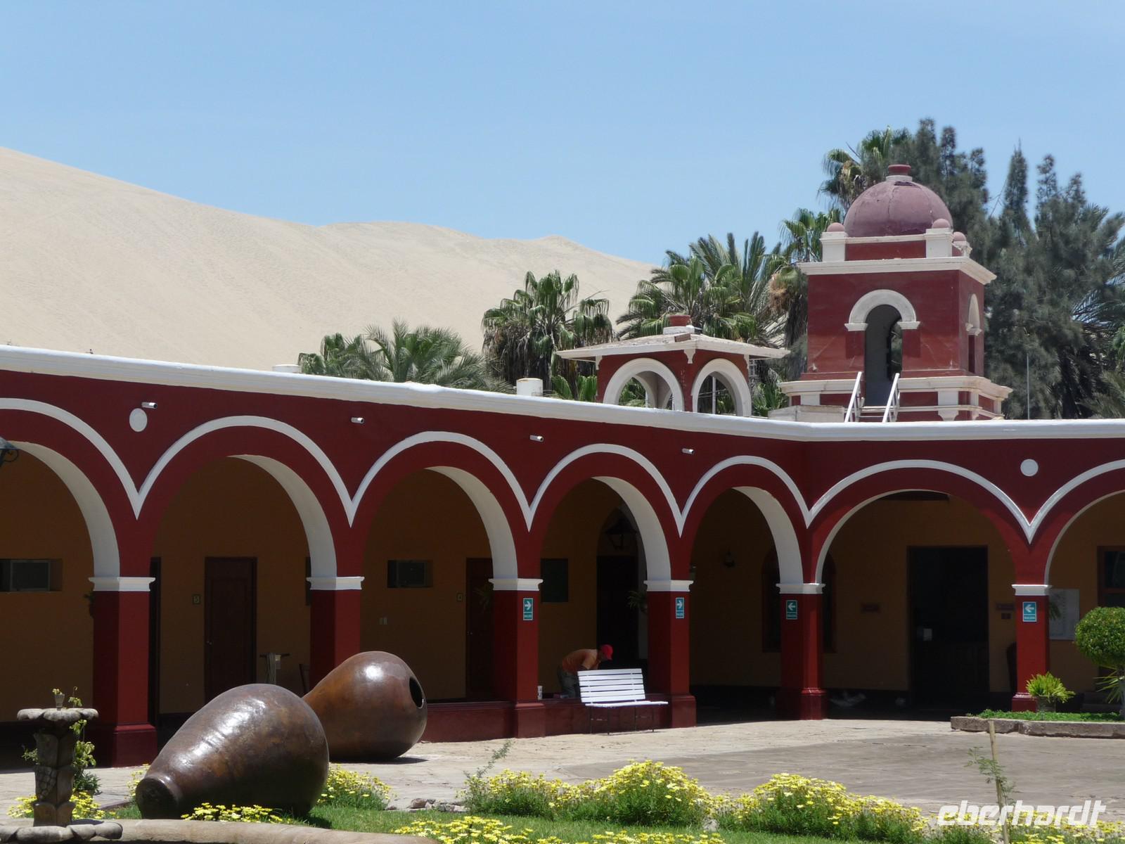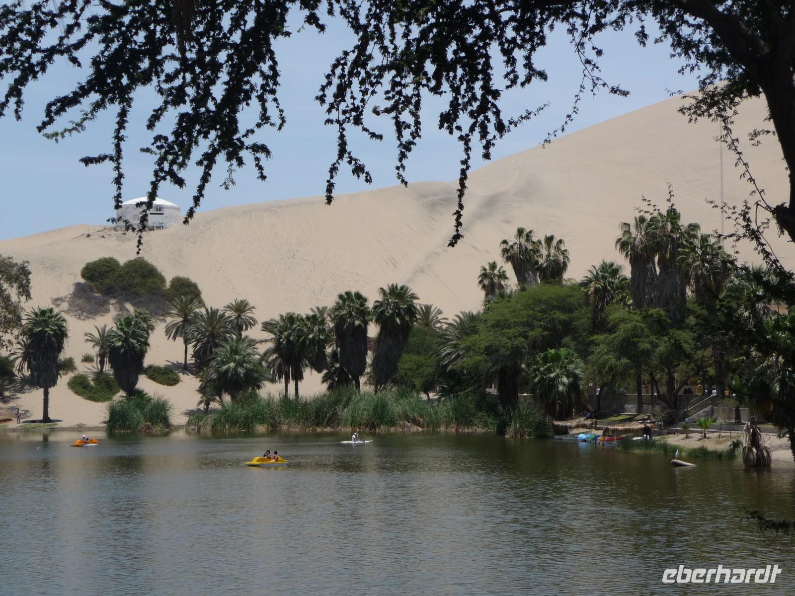 In der Oase Huacachina, die umgeben von Palmen und riesigen Sanddünen ist, bekommen wir einige Erklärungen von unserer Reiseleiterin Margarita und dann lassen wir uns kurz durch den Ort treiben. Viel Zeit bleibt uns nicht, da wir in Nazca auf dem Flughafen erwartet werden. Das Wetter soll umschwenken und es wird Wind vorhergesagt.
