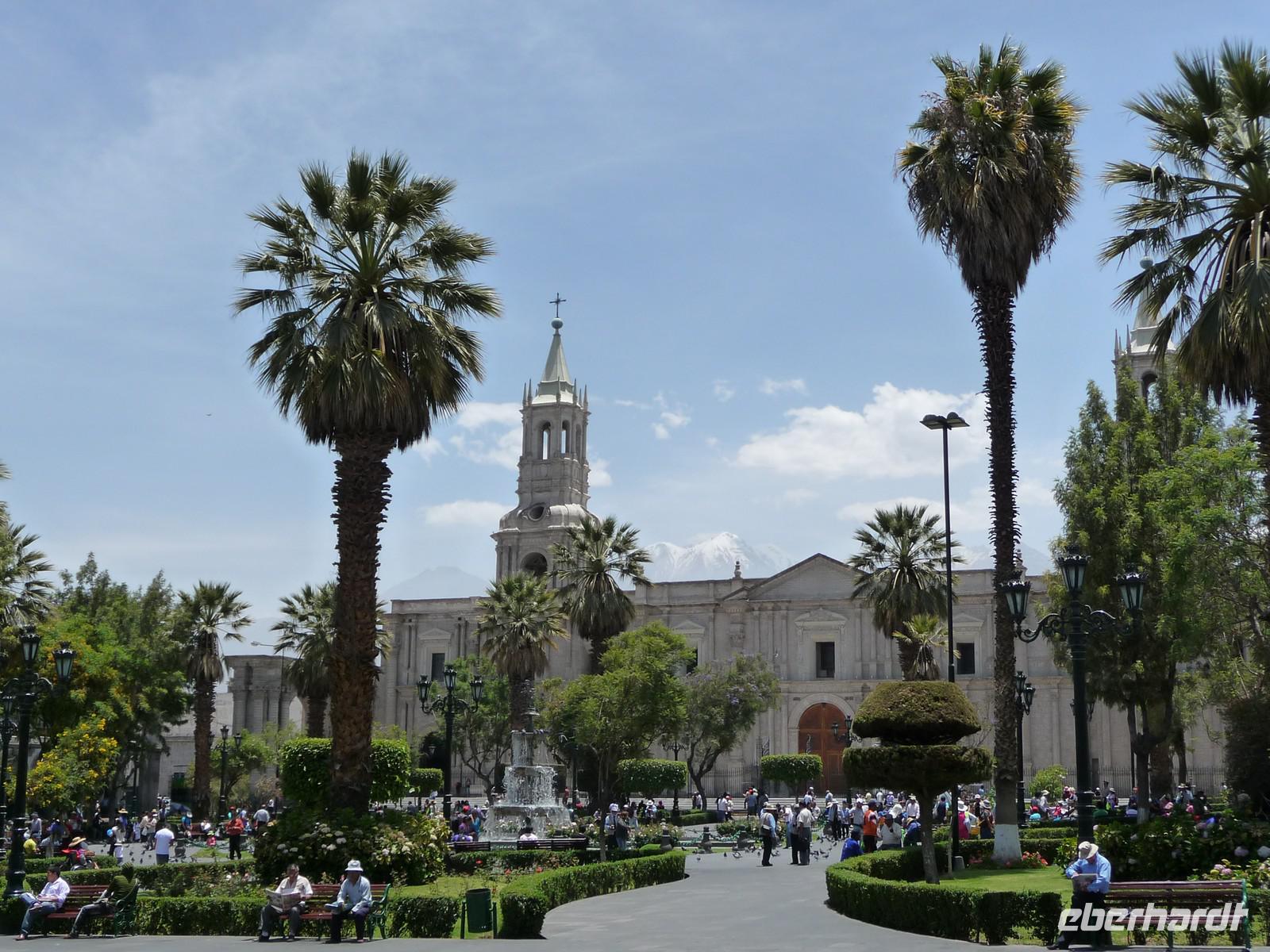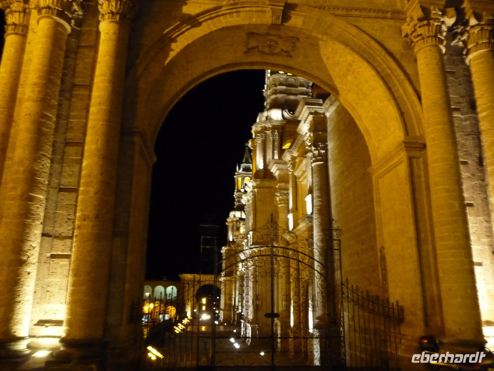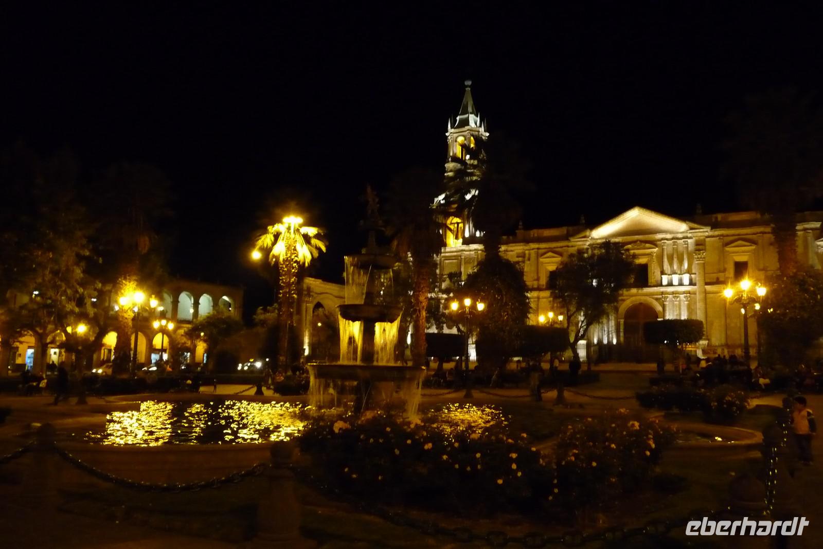 Einige schließen sich dem Abendspaziergang von Margarita und mir an und staunen über den toll beleuchteten Hauptplatz „Plaza de Armas" in Arequipa.