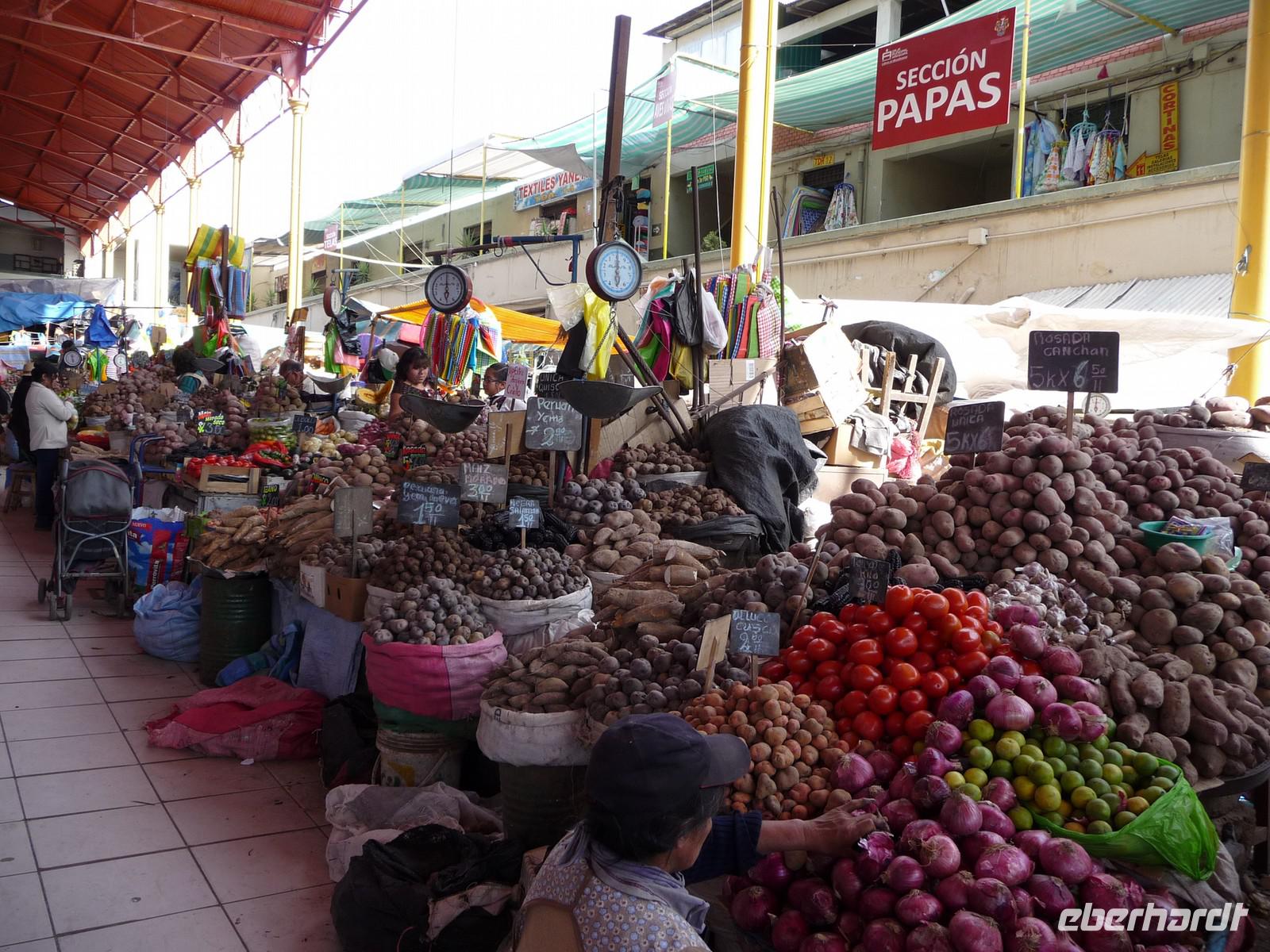 Nach einer kurzen Mittagspause laufe ich mit einigen Gästen zum Markt San Camillo am anderen Ende der Stadt. Dort herrscht reges Treiben und ganz besonders fallen uns die vielen Kartoffelsorten auf. Es soll mehr als 50 Sorten davon geben.