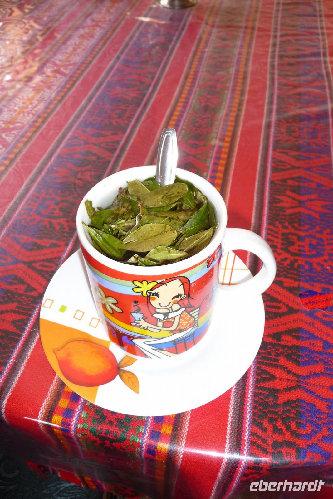 In Patahuasi probieren wir einen Muna-Coca Tee. Durch den leichten Pfefferminzgeschmack schmeckt dieser uns besser als der reine Cocablättertee und natürlich hoffen wir, dass der Tee uns bei der Bewältigung der Höhenmeter hilft. Schließlich fahren wir fast bis 5000m Höhe.