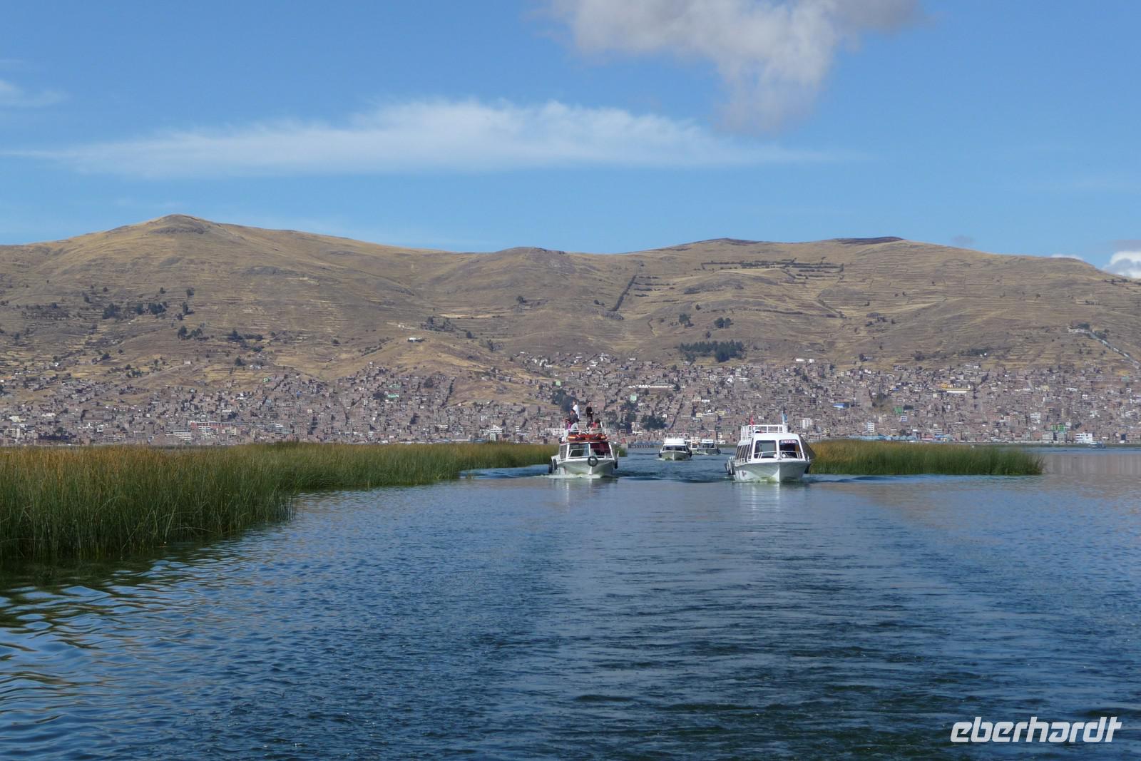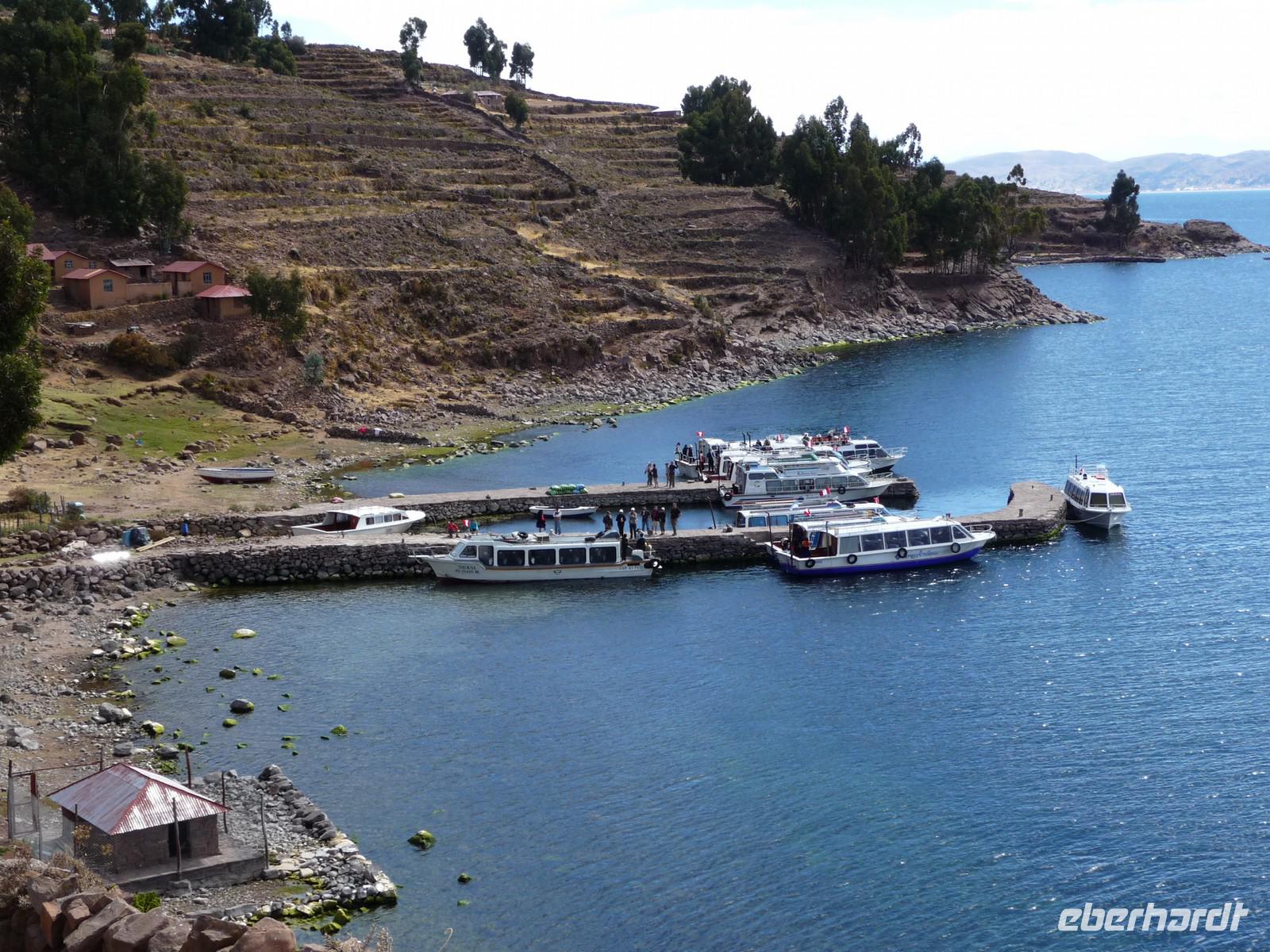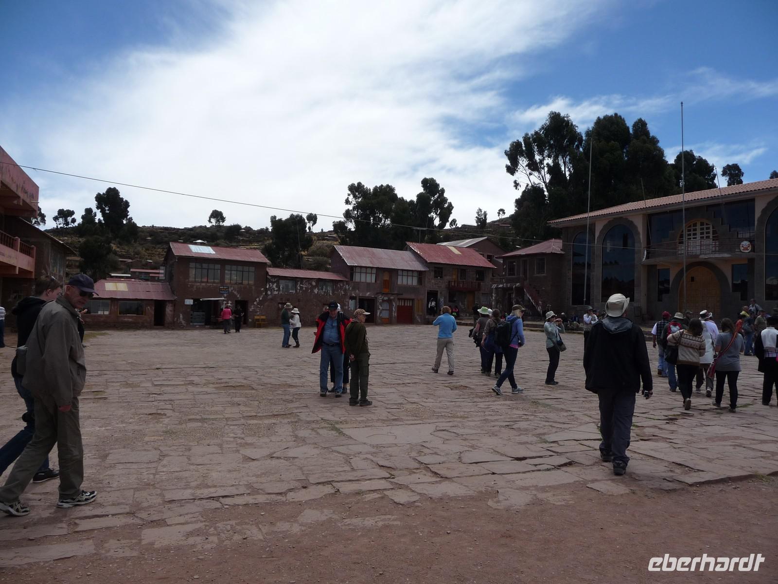 Vom Hauptplatz spazieren wir über die Insel zum Hafen Puerto Alsuno, wo Willi bereits mit dem Boot auf uns wartet um uns wieder auf dem höchst beschiffbaren See der Welt nach Puno zu fahren.