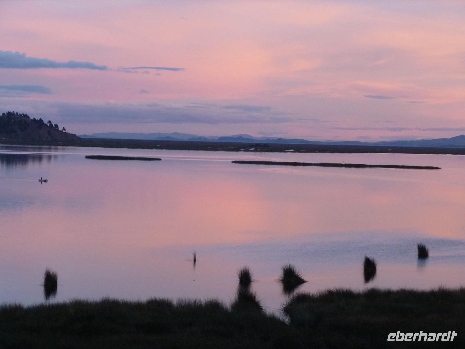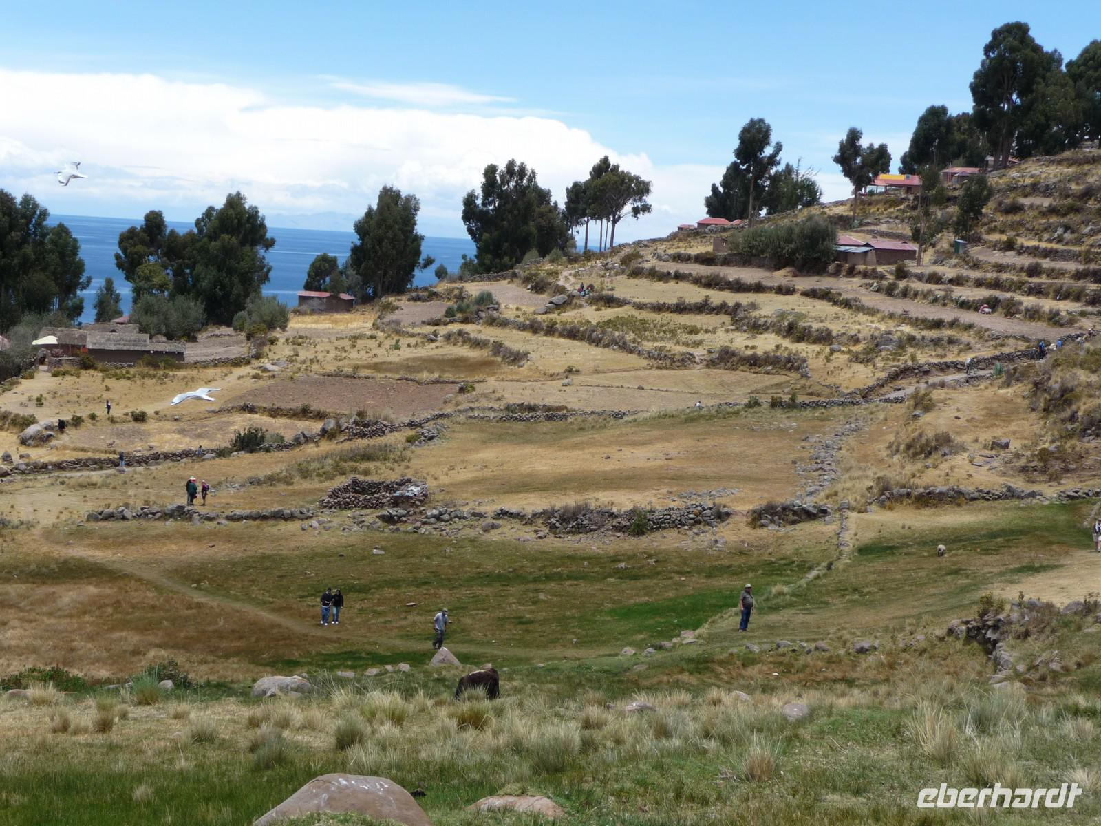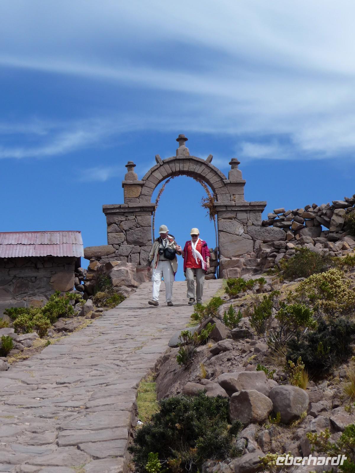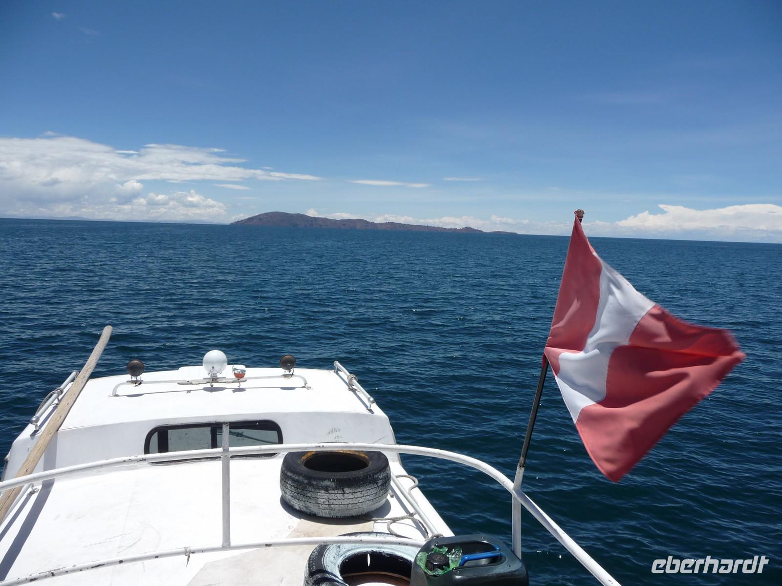 Vom Hauptplatz spazieren wir über die Insel zum Hafen Puerto Alsuno, wo Willi bereits mit dem Boot auf uns wartet um uns wieder auf dem höchst beschiffbaren See der Welt nach Puno zu fahren.