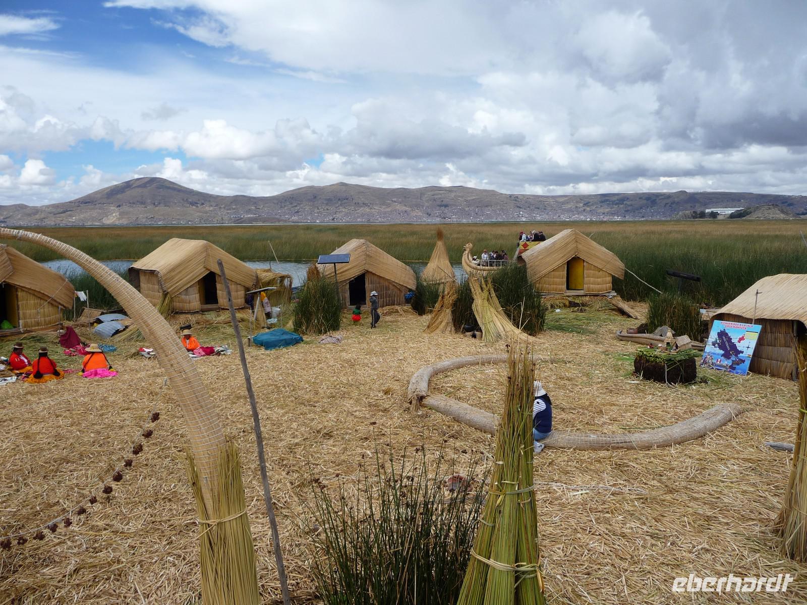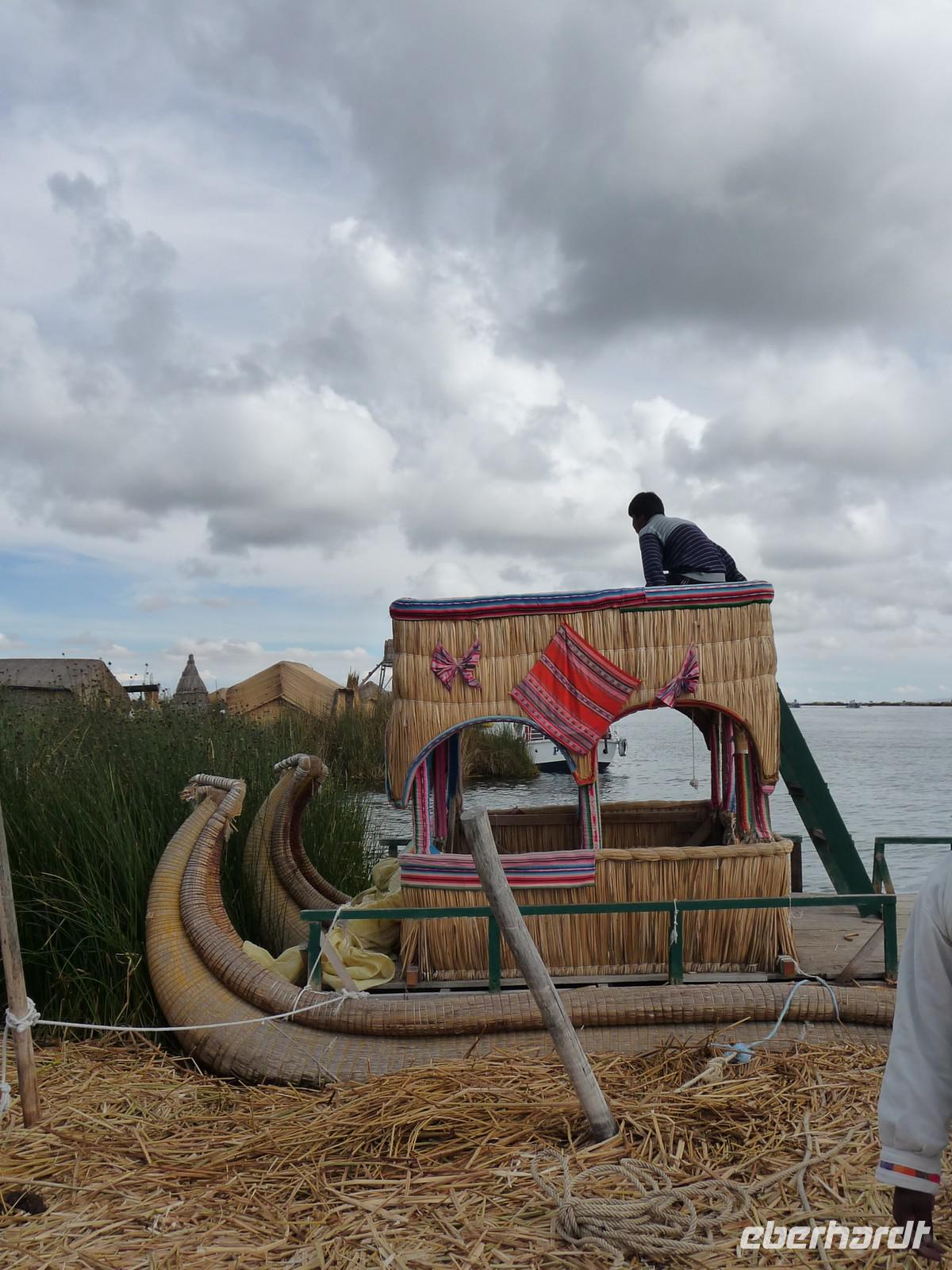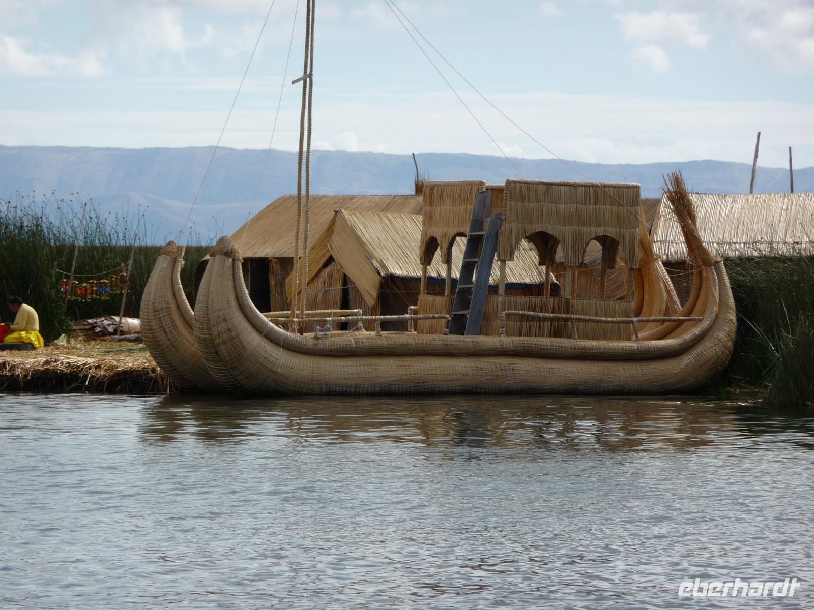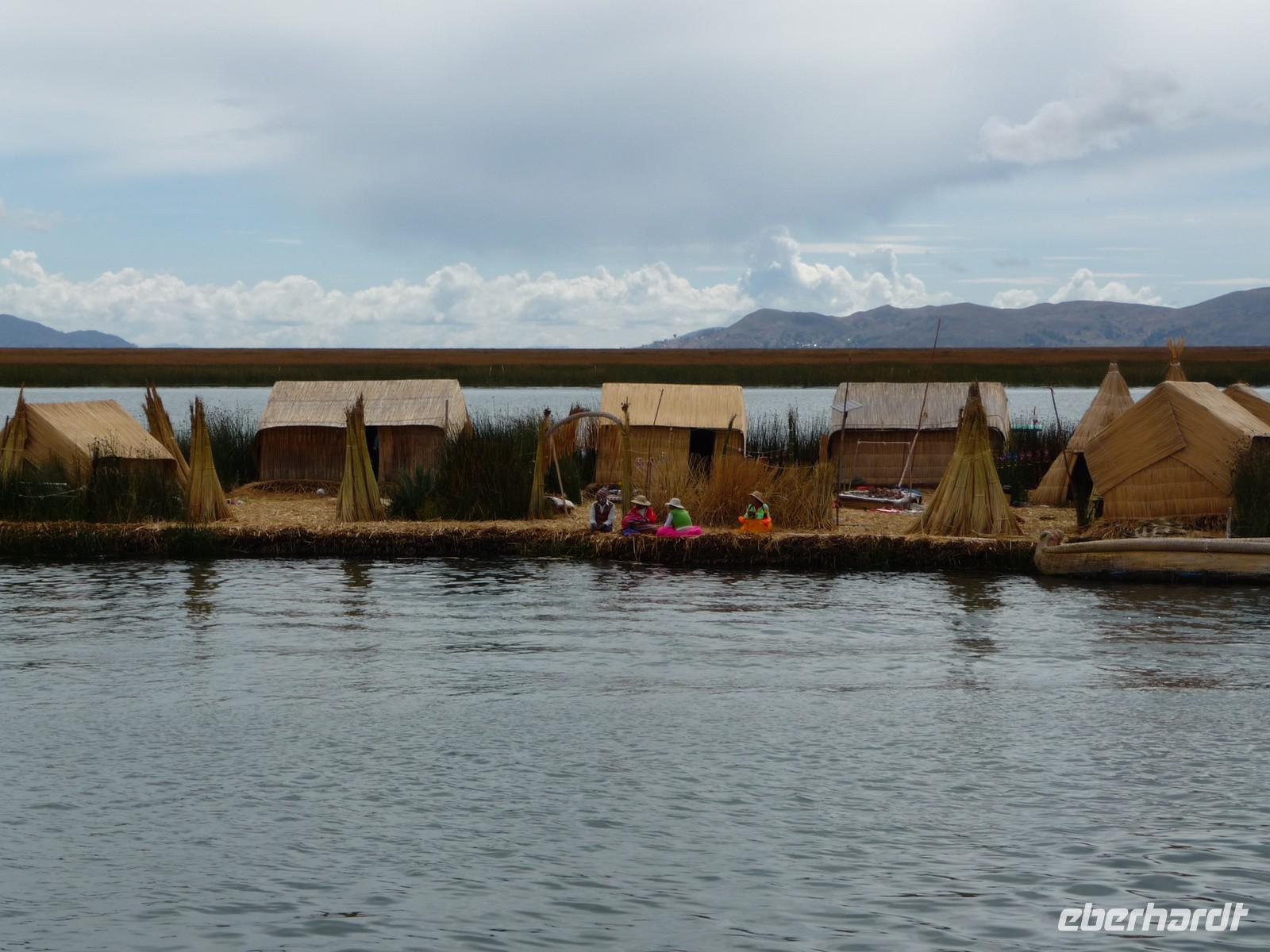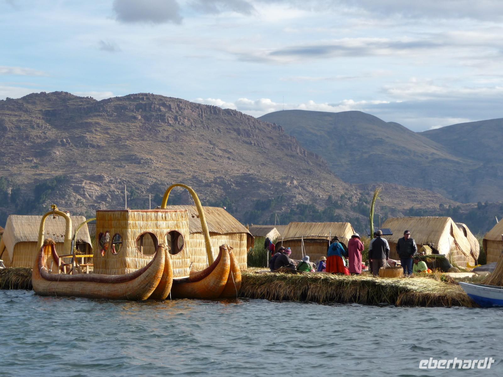 Unser heutiges Ziel sind die Uros-Inseln und die Insel Taquile. Mit unserem Bootsführer Willi und der Reiseleiterin Miriam fahren wir zuerst auf eine kleine Schilfinsel der Uros und werden von den Inselbewohnern herzlich begrüßt. Sehr interessiert verfolgen wir die Vorführung über den Bau einer Schilfinsel. Die Damen mit ihren einheimischen Trachten zeigen uns ihre Häuser und wie sie untereinander Handeln und Tausch betrieben haben. Zum Abschied singen sie uns noch ein paar Lieder...