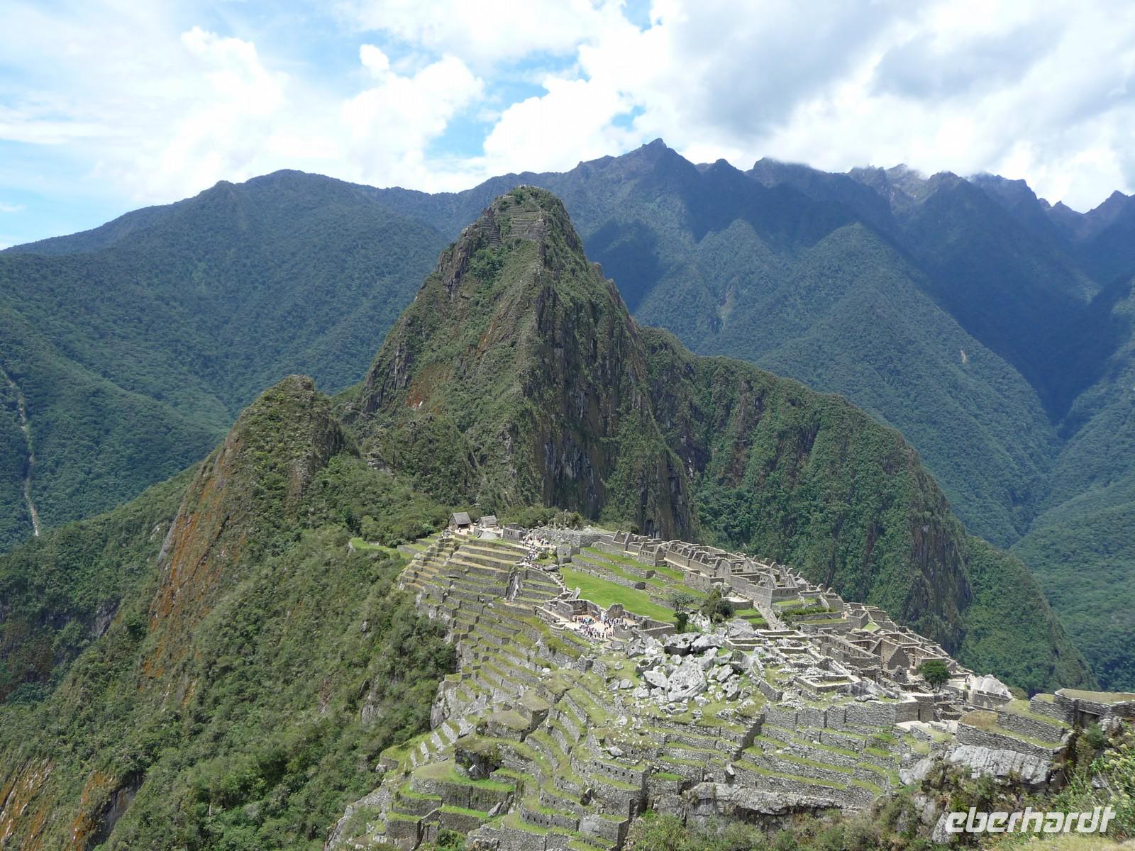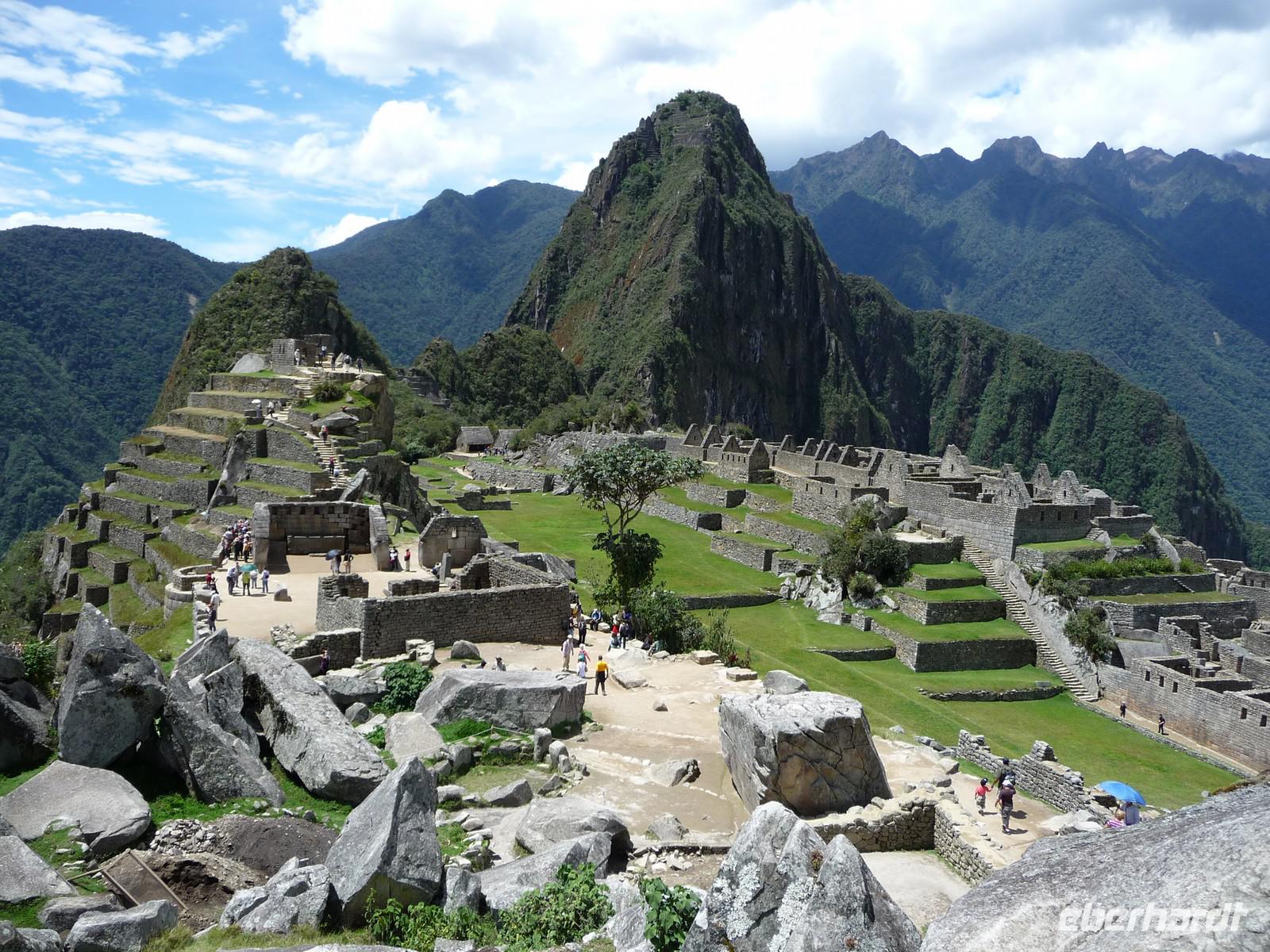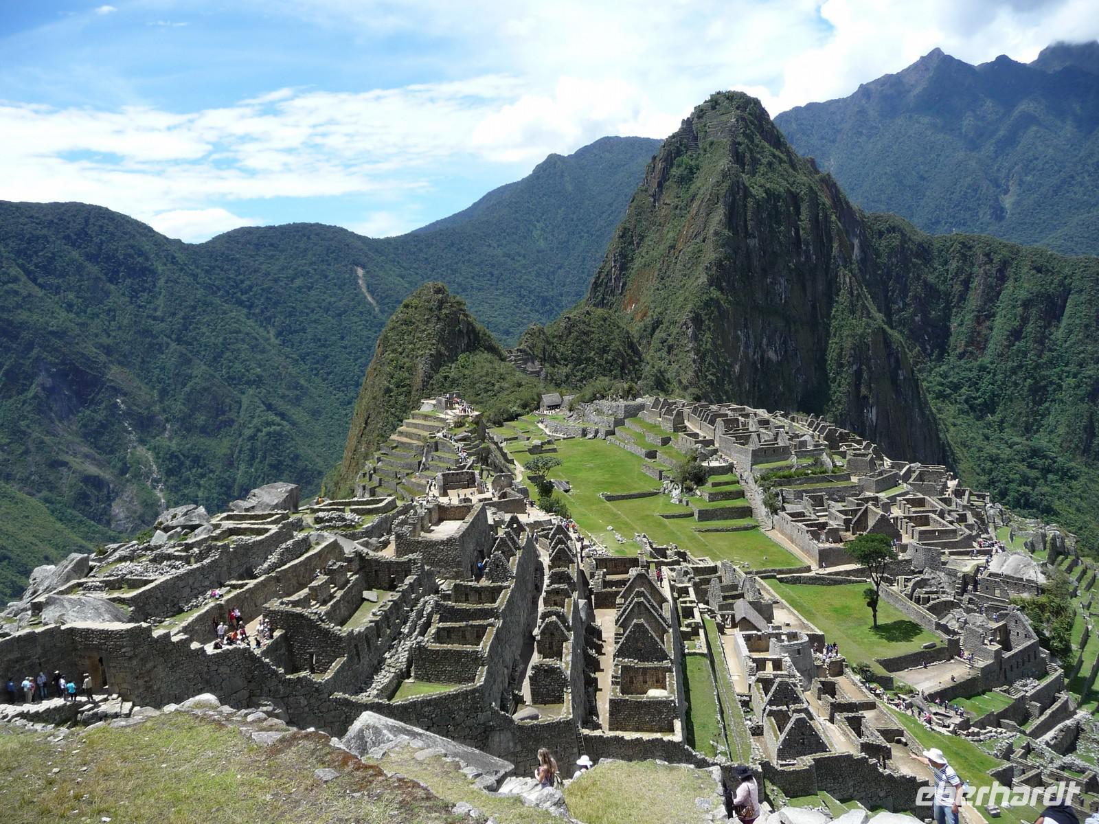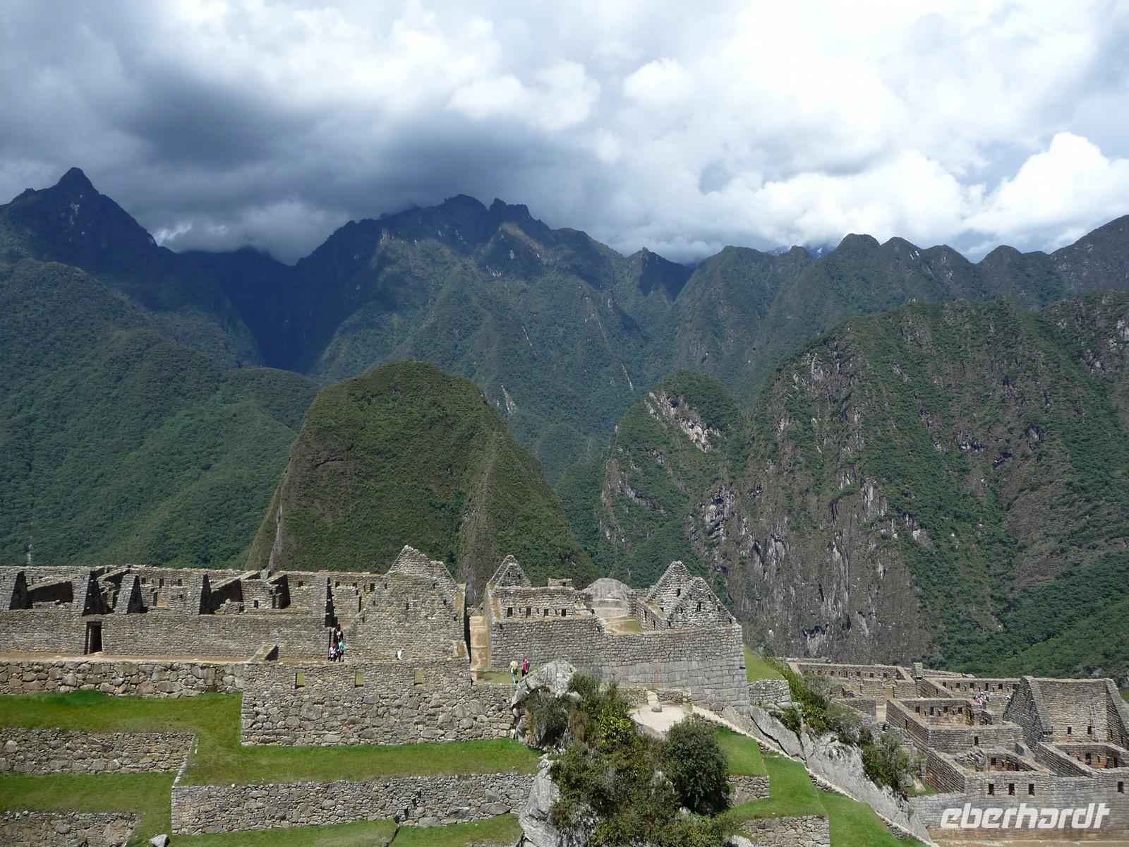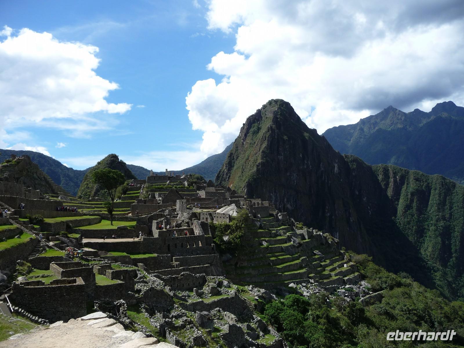 Endlich betreten wir den magischen Ort Machu Picchu. Wir erklimmen einige Stufen und laufen ein Stück bergauf, bis wir schließlich den Blick haben, der auf jeder Postkarte von Machu Picchu abgedruckt ist. Wir lassen uns nieder und Marco Antonio erzählt uns die Entdeckungsgeschichte dieses Ortes und führt uns anschließend durch das Gelände. Beeindruckt von dem Bauwerk spazieren wir bei strahlendem Sonnenschein durch die alten Mauern der Stadt.
