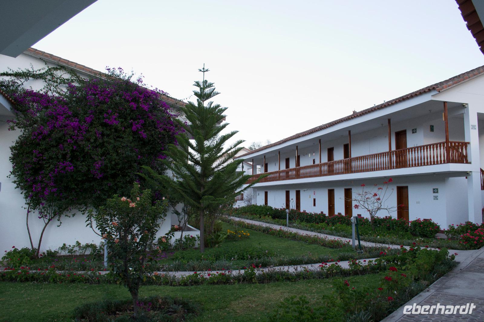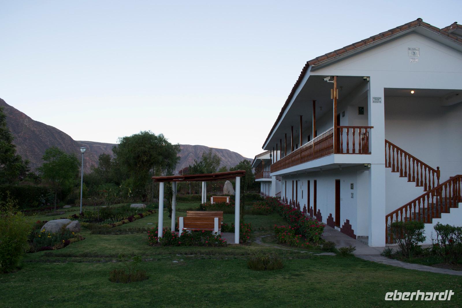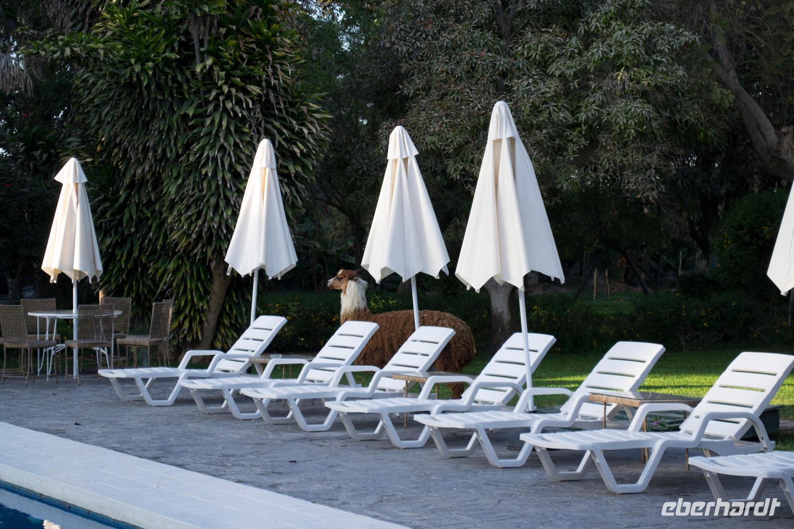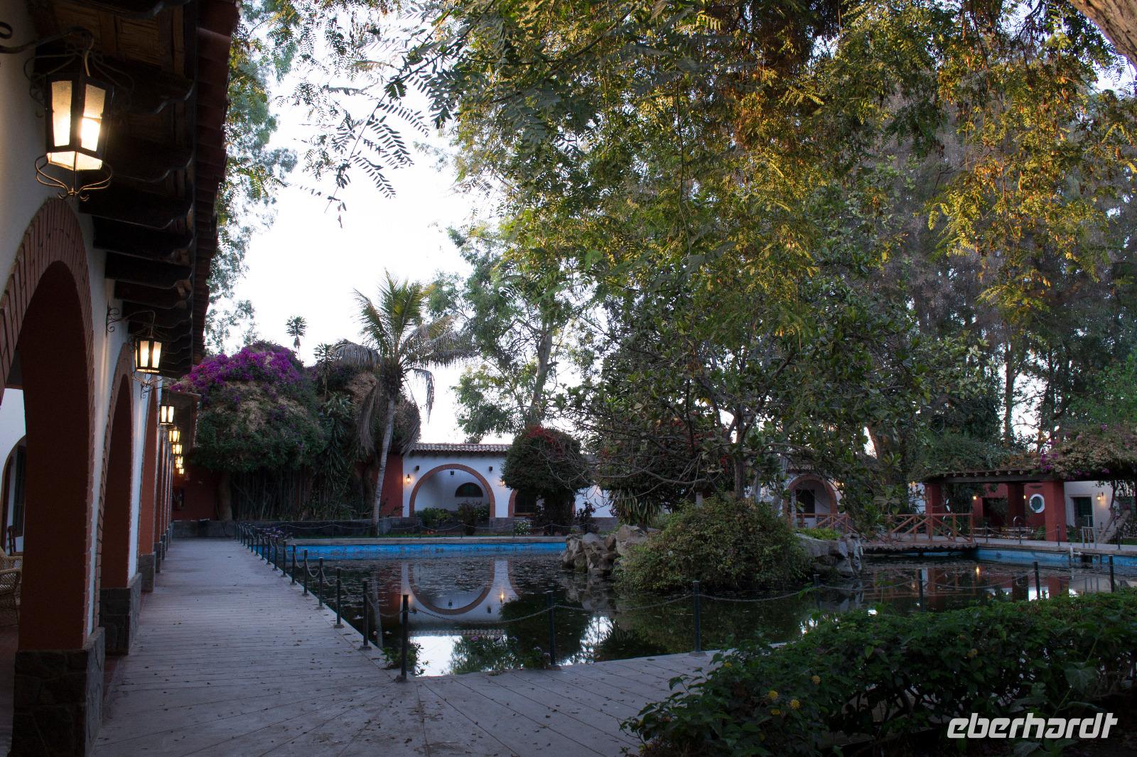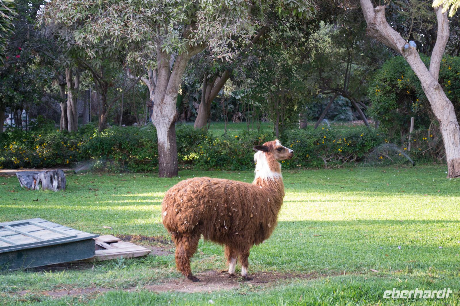 Als erstes stand heute ein Stopp an der Oase "Huacachina" an. Der Name hat seinen Ursprung aus dem Quechua, wobei "huaca" mit "Heiliger Ort" und "china" mit "Frau" übersetzt werden kann. Weiter ging es in den nur sechs Kilometer entfernten Ort Ica. Dieser liegt rund 406 Meter hoch und gehört zur gleichnamigen Provinz. Wir besuchten das "Museo Regional de Ica", wo wir peruanische Überreste bestaunen und teilweise vor gut erhaltenen Mumien und bizarren Menschenschädeln erschrocken. Bevor wir die Nazca Linien erreichten deckten wir uns bei einem großen Supermarkt mit Lebensmitteln und Getränken für die Fahrt ein. Wir sollten eigentlich 14 Uhr die Flugstation der Nazca Linien erreichen, doch der Transport von Windmühlteilen kam uns in die Quere. Wir konnten also mit an sehen wie die LKWs sich die Serpentinen entlang nach unten Richtung Tal quälten. Dadurch verloren wir sehr viel kostbare Zeit, denn die Flüge für die ankommenden Reisegruppen werden nach Ankunftszeit sofort verteilt. Doch durch die Hilfe unseres Reiseleiter Ernesto und der guten Vorarbeit im Bus und Einteilung in zwei Gruppen kamen alle Reisegäste noch an demselben Tag in den Genuss des Rundfluges über die berühmten Linien. Sie sind riesige Geoglyphen in der Wüste bei Nazca und Palpa. Die Nazca-Ebene zeigt auf einer Fläche von 500 km² schnurgerade, bis zu 20 km lange Linien, Dreiecke und trapezförmige Flächen sowie Figuren mit einer Größe von zehn bis mehreren hundert Metern. Diese können nur bei einem 30 minütigen Rundflug in Kleinflugzeugen erlebt werden. Nach diesem Höhepunkt waren wir alle überglücklich und freuten uns zunächst auf ein tolles Abendessen in dem lokalen Restaurant „El Porton" mit tollem Flair und einem köstlichen Pisco Sour. Die Nacht verbrachten wir auf dem Gut „Majoro" mit einer romantischen Hotelanlage und den ersten Lamas zwischen den Sonnenliegen und der Poolbar.