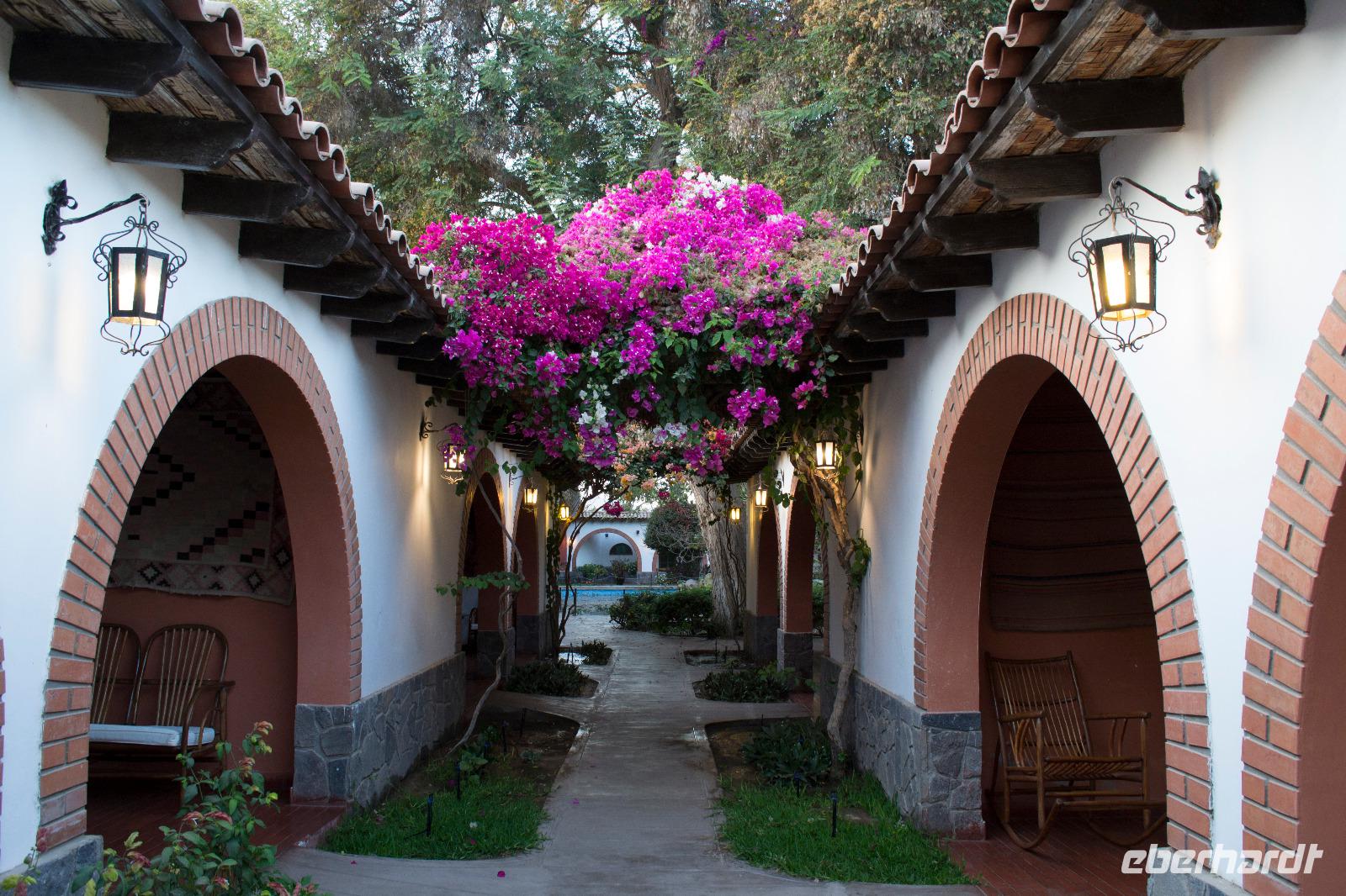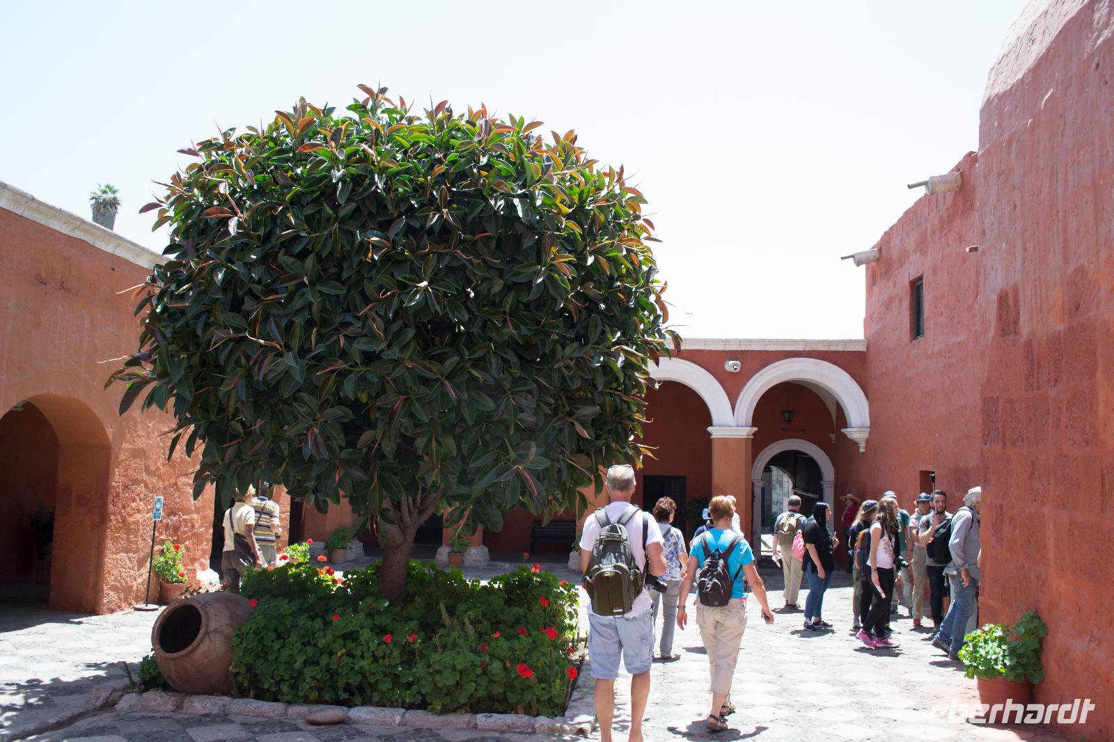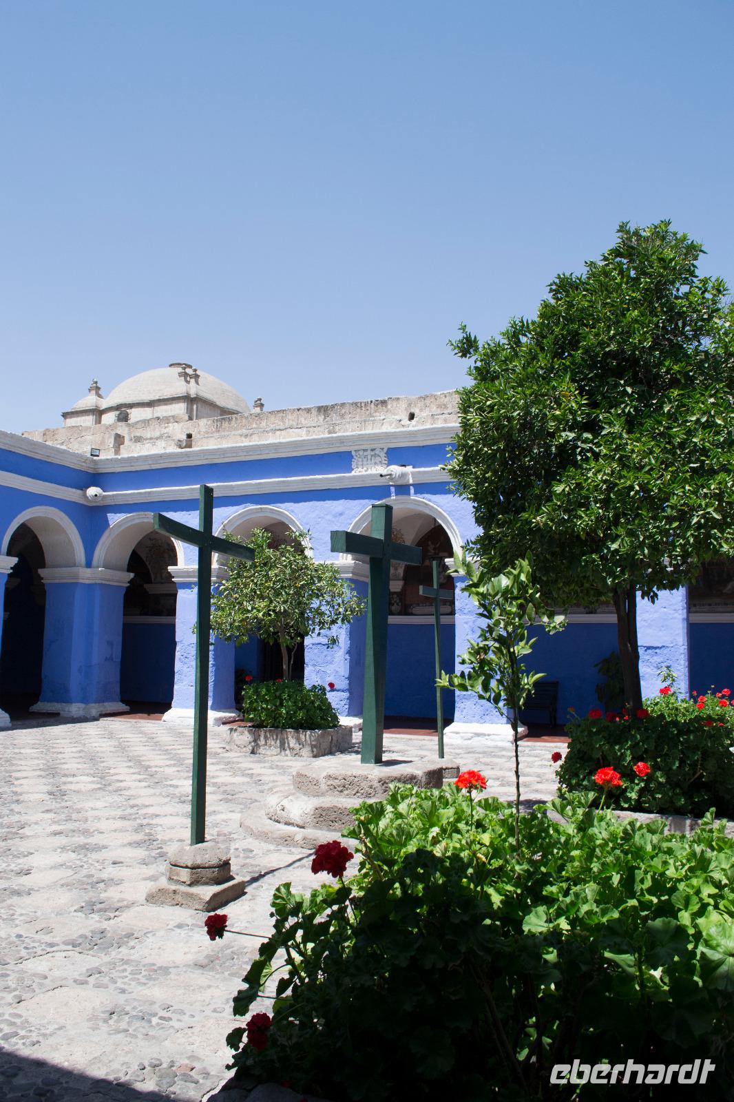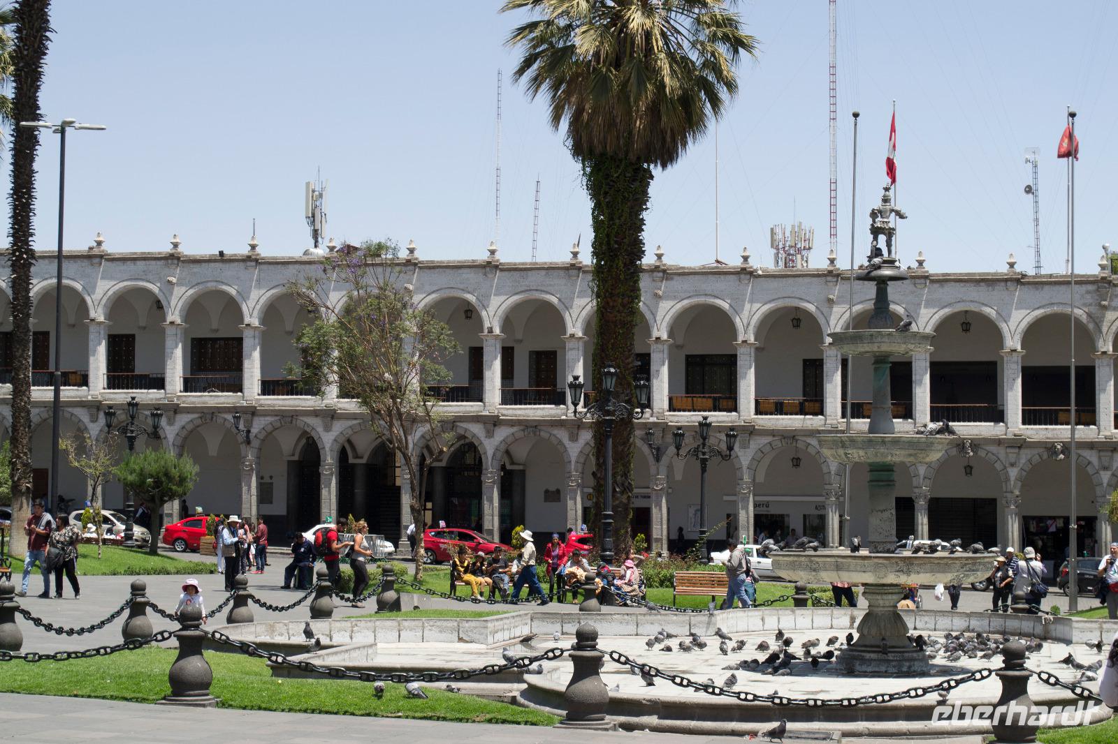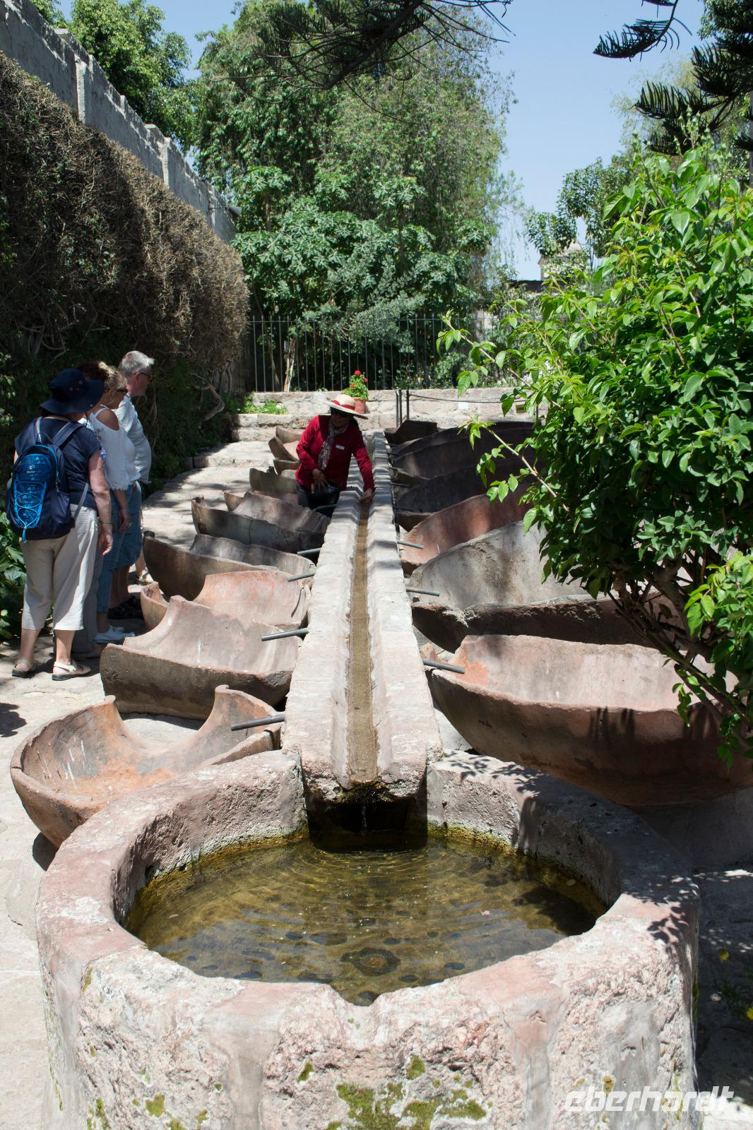 Bei strahlendem Sonnenschein begrüßten wir am Morgen unsere Reiseleiterin Paola für den heutigen Tag durch die „weiße Stadt" Arequipa. Unsere heutige Stadtrundfahrt beginnt mit einem fantastischen Ausblick auf die Vulkane "El Misti" /5.822 Meter, "Chachani" /6.075 Meter und "Pichu Pichu" /5.571 Meter vom Aussichtspunkt im Stadtteil Yanahuara. Paola erklärte uns von dort die zahlreichen Anbauten. Zum Abschluss servierte Sie uns eine Kostprobe des leckeren „Maca Schnaps" und erläuterte uns die verschiedene Kräuter und Coca Sorten in Form von Blättern, Bonbons und Pulver. Danach ging es mit dem Bus weiter zu einem niedriger gelegenen Aussichtspunkt, wo wir noch eine Kostprobe von dem typisch peruanischen Vanille Eis nehmen konnten. Im Anschluss daran setzte uns der Bus in der Nähe unseres Hotels an der „San Franzisco" Kirche ab und wir liefen zu Fuß zu dem nur 5 Minuten entfernten Plaza de Armas. Paola erklärte uns die Kirche "La Compania" aus fast weißem Vulkanstein von außen und später auch kurz von innen, bis wir diese auf Grund eines anstehenden Gottesdienstes verlassen sollten. Ein Stück oberhalb der Kirche besuchten wir einen kleinen ruhigen Innenhof mir vielen Alpaca Geschäften. Zu Fuß über den Hauptplatz entlang der Kolonialgebäude ging es weiter zu dem Kloster Santa Catalina. Der im 16. Jahrhundert erschaffenen Gebäudekomplex erstrahlte in den Farben blau und orange. Dort wurde uns durch eine lokale Reiseleitung das Leben der Nonnen und Anwohner spürbar gezeigt und nahe gebracht. Von den Schlafräumen, über das Krankenhaus bis hin zu dem Wäscheplatz. Wir verabschiedeten unsere äußerst lustige Reiseleitung Paola und genossen den freien Nachmittag in der wunschschönen Stadt. Am Abend reservierte Reisebegleitung Laura für uns in einem nur wenige Gehminuten entfernten Restaurant „Zingaro" einen Tisch, wo wir Essen der gehobenen Klasse serviert bekamen.