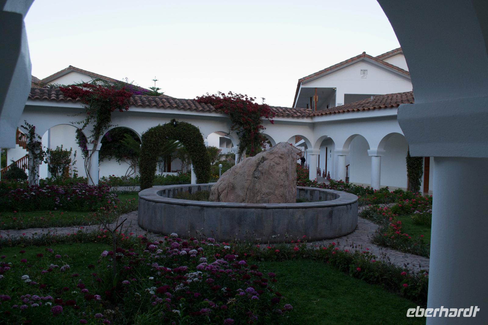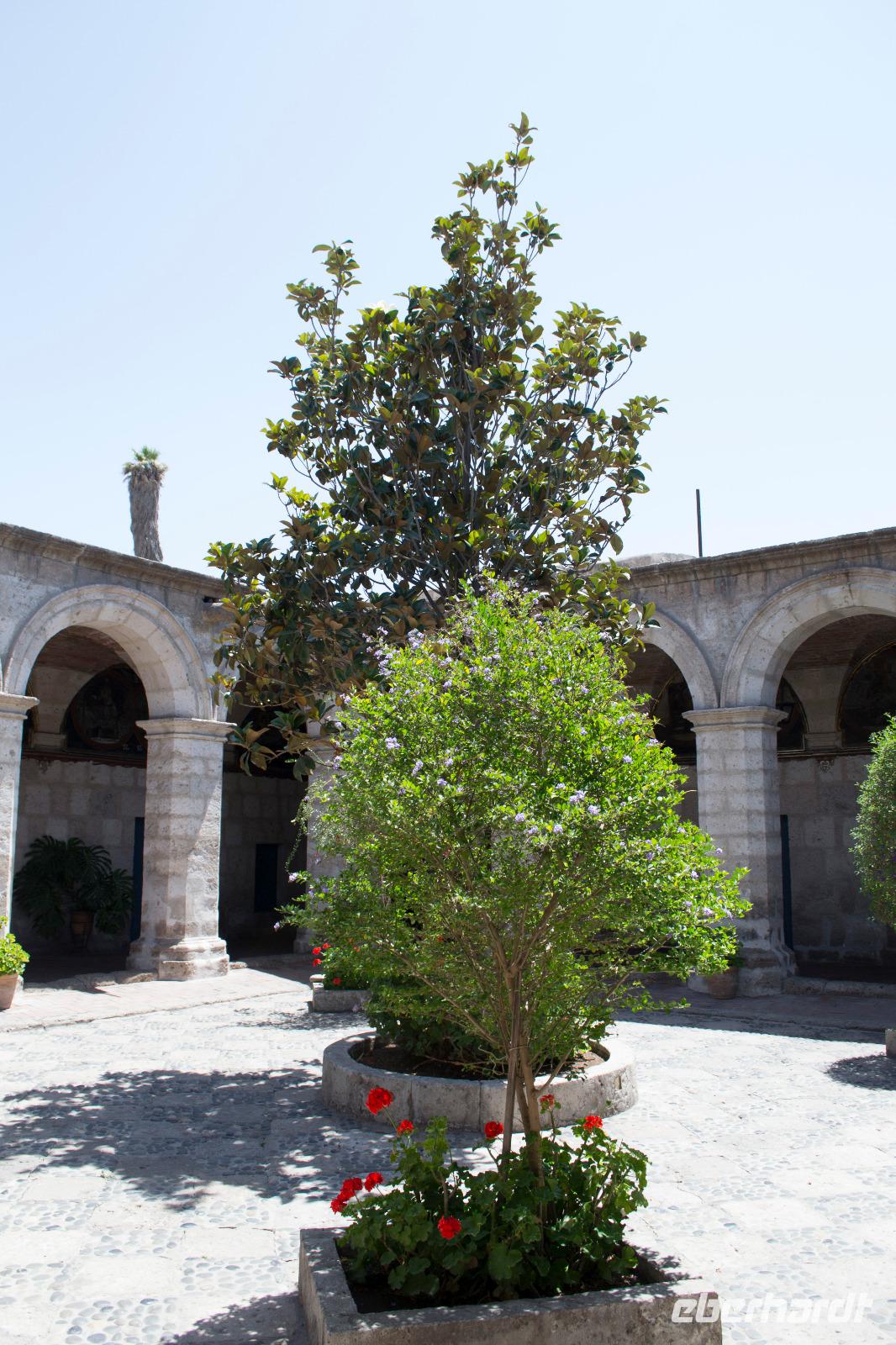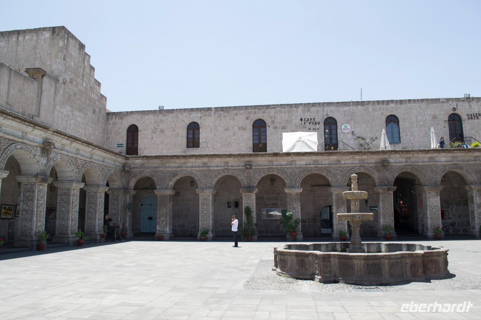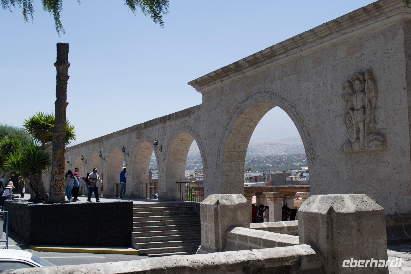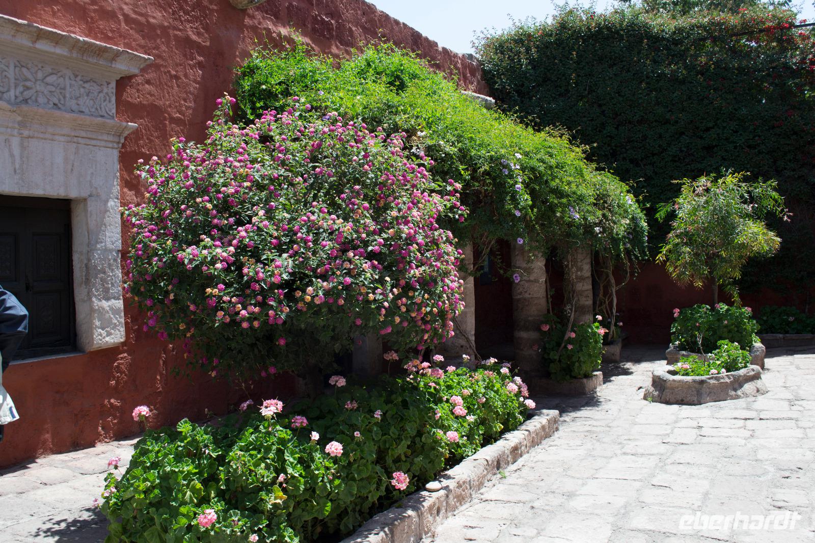 Bei strahlendem Sonnenschein begrüßten wir am Morgen unsere Reiseleiterin Paola für den heutigen Tag durch die „weiße Stadt" Arequipa. Unsere heutige Stadtrundfahrt beginnt mit einem fantastischen Ausblick auf die Vulkane "El Misti" /5.822 Meter, "Chachani" /6.075 Meter und "Pichu Pichu" /5.571 Meter vom Aussichtspunkt im Stadtteil Yanahuara. Paola erklärte uns von dort die zahlreichen Anbauten. Zum Abschluss servierte Sie uns eine Kostprobe des leckeren „Maca Schnaps" und erläuterte uns die verschiedene Kräuter und Coca Sorten in Form von Blättern, Bonbons und Pulver. Danach ging es mit dem Bus weiter zu einem niedriger gelegenen Aussichtspunkt, wo wir noch eine Kostprobe von dem typisch peruanischen Vanille Eis nehmen konnten. Im Anschluss daran setzte uns der Bus in der Nähe unseres Hotels an der „San Franzisco" Kirche ab und wir liefen zu Fuß zu dem nur 5 Minuten entfernten Plaza de Armas. Paola erklärte uns die Kirche "La Compania" aus fast weißem Vulkanstein von außen und später auch kurz von innen, bis wir diese auf Grund eines anstehenden Gottesdienstes verlassen sollten. Ein Stück oberhalb der Kirche besuchten wir einen kleinen ruhigen Innenhof mir vielen Alpaca Geschäften. Zu Fuß über den Hauptplatz entlang der Kolonialgebäude ging es weiter zu dem Kloster Santa Catalina. Der im 16. Jahrhundert erschaffenen Gebäudekomplex erstrahlte in den Farben blau und orange. Dort wurde uns durch eine lokale Reiseleitung das Leben der Nonnen und Anwohner spürbar gezeigt und nahe gebracht. Von den Schlafräumen, über das Krankenhaus bis hin zu dem Wäscheplatz. Wir verabschiedeten unsere äußerst lustige Reiseleitung Paola und genossen den freien Nachmittag in der wunschschönen Stadt. Am Abend reservierte Reisebegleitung Laura für uns in einem nur wenige Gehminuten entfernten Restaurant „Zingaro" einen Tisch, wo wir Essen der gehobenen Klasse serviert bekamen.