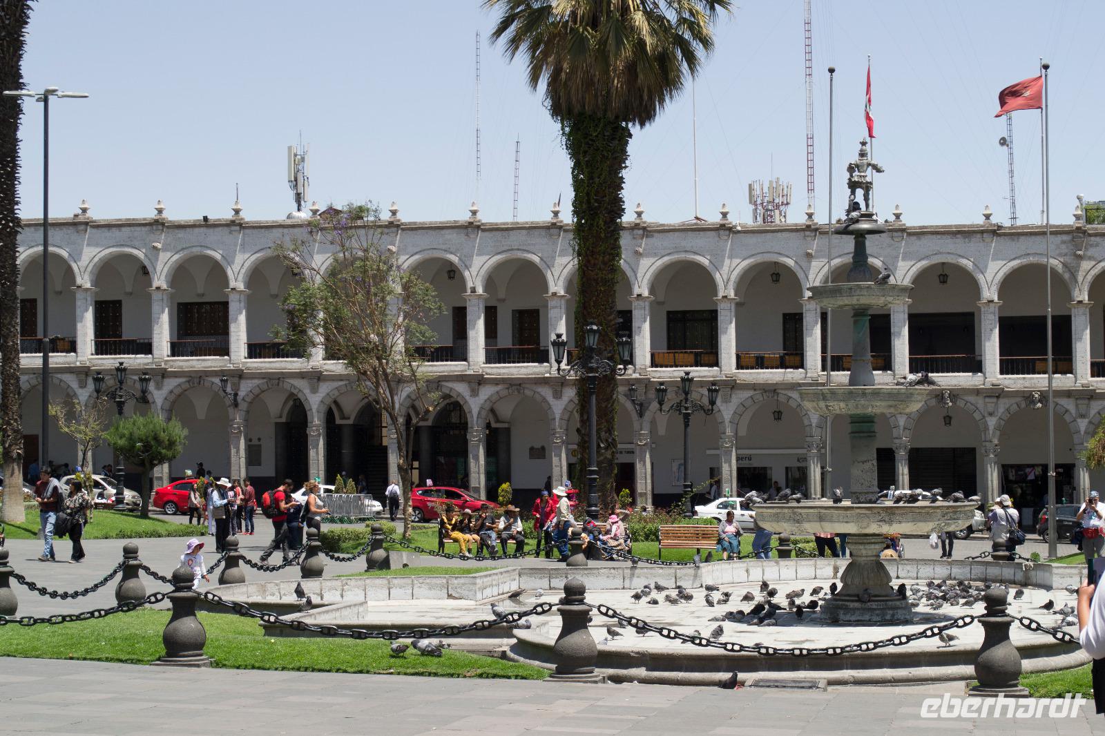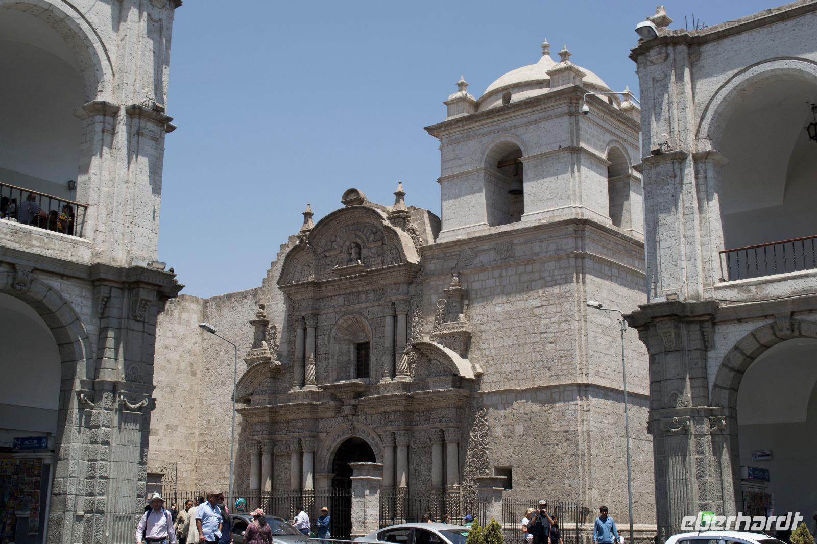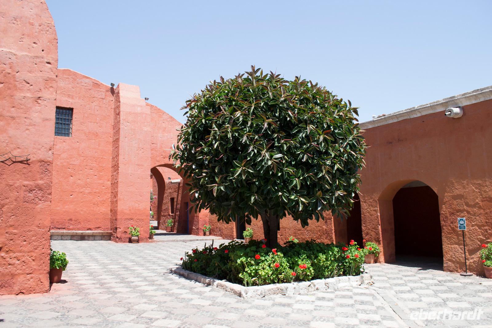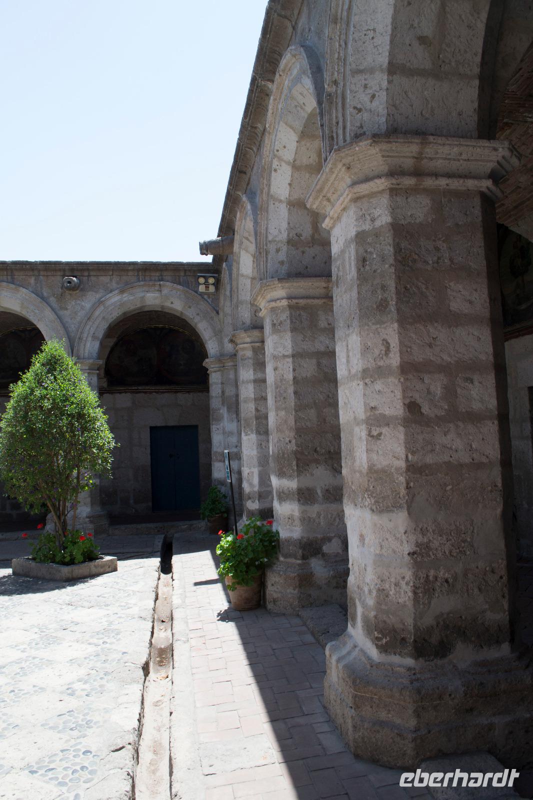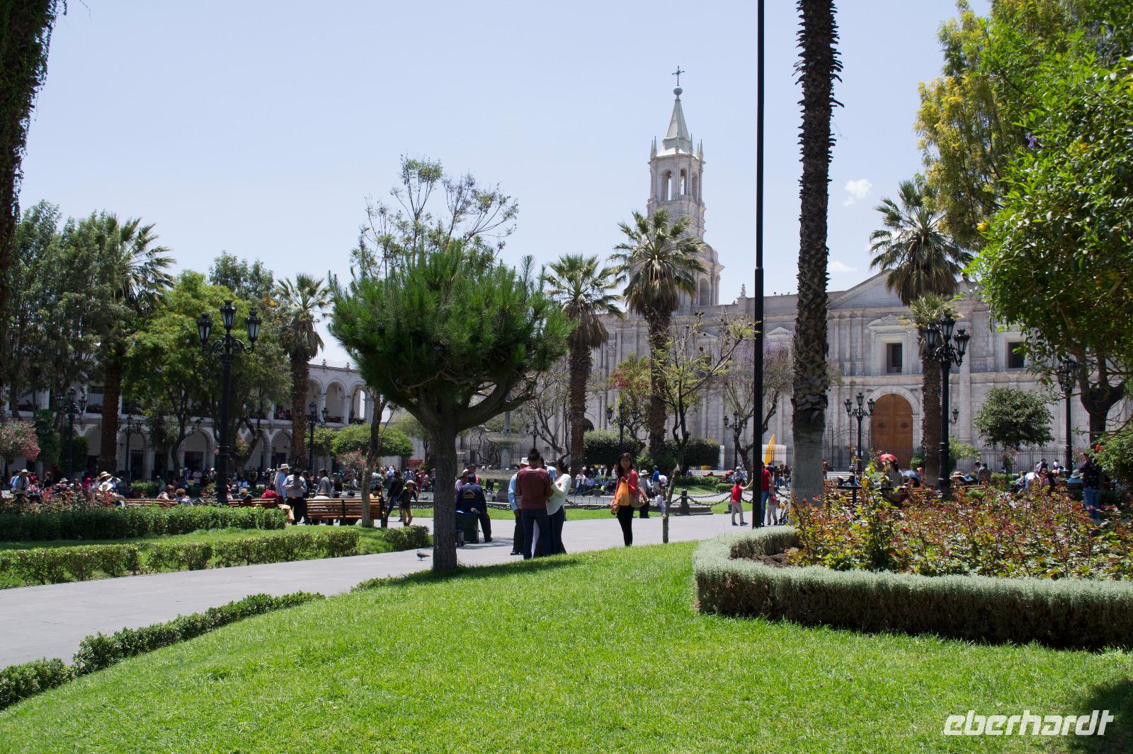 Bei strahlendem Sonnenschein begrüßten wir am Morgen unsere Reiseleiterin Paola für den heutigen Tag durch die „weiße Stadt" Arequipa. Unsere heutige Stadtrundfahrt beginnt mit einem fantastischen Ausblick auf die Vulkane "El Misti" /5.822 Meter, "Chachani" /6.075 Meter und "Pichu Pichu" /5.571 Meter vom Aussichtspunkt im Stadtteil Yanahuara. Paola erklärte uns von dort die zahlreichen Anbauten. Zum Abschluss servierte Sie uns eine Kostprobe des leckeren „Maca Schnaps" und erläuterte uns die verschiedene Kräuter und Coca Sorten in Form von Blättern, Bonbons und Pulver. Danach ging es mit dem Bus weiter zu einem niedriger gelegenen Aussichtspunkt, wo wir noch eine Kostprobe von dem typisch peruanischen Vanille Eis nehmen konnten. Im Anschluss daran setzte uns der Bus in der Nähe unseres Hotels an der „San Franzisco" Kirche ab und wir liefen zu Fuß zu dem nur 5 Minuten entfernten Plaza de Armas. Paola erklärte uns die Kirche "La Compania" aus fast weißem Vulkanstein von außen und später auch kurz von innen, bis wir diese auf Grund eines anstehenden Gottesdienstes verlassen sollten. Ein Stück oberhalb der Kirche besuchten wir einen kleinen ruhigen Innenhof mir vielen Alpaca Geschäften. Zu Fuß über den Hauptplatz entlang der Kolonialgebäude ging es weiter zu dem Kloster Santa Catalina. Der im 16. Jahrhundert erschaffenen Gebäudekomplex erstrahlte in den Farben blau und orange. Dort wurde uns durch eine lokale Reiseleitung das Leben der Nonnen und Anwohner spürbar gezeigt und nahe gebracht. Von den Schlafräumen, über das Krankenhaus bis hin zu dem Wäscheplatz. Wir verabschiedeten unsere äußerst lustige Reiseleitung Paola und genossen den freien Nachmittag in der wunschschönen Stadt. Am Abend reservierte Reisebegleitung Laura für uns in einem nur wenige Gehminuten entfernten Restaurant „Zingaro" einen Tisch, wo wir Essen der gehobenen Klasse serviert bekamen.