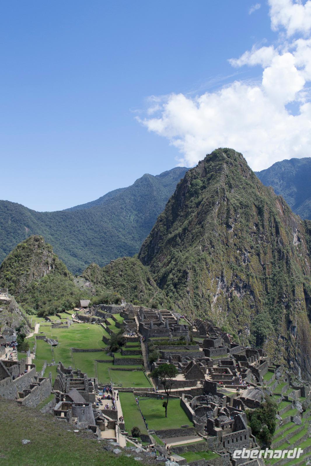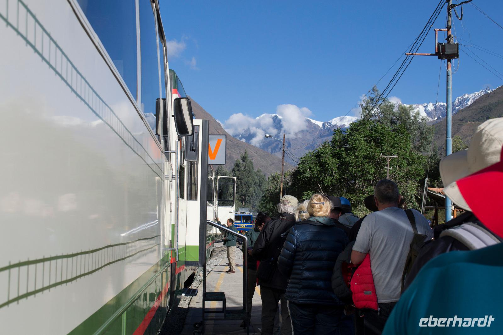 Auf den heutigen Tag fieberten viele Reisegäste besonders hin, wenn Sie nicht fast nur wegen dem Machu Picchu die tolle Rundreise durch Peru gebucht hatten? Also ging es für uns heute schon in den frühen Morgenstunden los, denn wie sagt man so schön? „Der frühe Vogel fängt den Wurm". Also starten wir mit einer 30 minütigen Busfahrt von unserem Hotel in Urubamba nach Ollanta, wo wir in unseren bereits gebuchten Zug einstiegen. In Peru Zug zu fahren ist ein ganz besonderes Erlebnis. Nicht nur die Landschaft entlang den Gleisen, sondern auch der Gute Bordservice in Form eines Wunschgetränkes und einem kleinen Snack stimmte von vorn bis hinten. In dem beschaulichen Ort angekommen trödelten wir nicht, denn wir waren noch nicht an unserem heutigen Tagesziel angekommen. Vom Bahnhof aus ging es durch eine kleine Markthalle direkt zu den Pendelbussen, welche im 10-Minuten-Takt Touristen zu eines der 7 Weltwunder brachte. Wir warteten nicht lange und befanden uns nach 25 Warteminuten schon in dem Bus entlang der Serpentinen auf den Machu Picchu. Schnell noch mit Mücken- und Sonnenschutz angesprüht und los ging der kleine Spaziergang. Als wir bereits erste Teile der Inkaanlage sahen trauten wir unseren Augen nicht. Wir haben es geschafft! In einer 3 Stündigen Führung zeigte und erklärte uns Maria beinahe jedes kleine Detail der Inka Hinterlassenschaft. Die Anlage ist eine der gut erhaltenen Ruinenstadt in Peru. Die Inkas erbauten die Stadt im 15. Jahrhundert in 2430 Metern Höhe auf einem Bergrücken zwischen den Gipfeln des Huayna Picchu und des Berges gleichen Namens Machu Picchu, welcher durch die Bebauung fast verloren ging. Wir konnten unsere Eindrücke gar nicht genug in Bildern darstellen. Dennoch mussten auch wir wieder zurück kehren und uns der langen Warteschlange für die Pendelbuse ins Tal stellen. Wir nahmen es mit Humor und begannen nach einzigartigen Blumen und Kolibris zu suchen. Nach einer dreiviertel Stunde war es dann endlich geschafft. In Mapi angekommen nahmen wir den direkten Weg zu unserem Restaurant „El Mapi by Inkatera", denn es war mittlerweil schon früher Nachmittag und der Hunger machte sich in unseren Bäuchen breit. Nach der willkommenen Nahrungsaufnahme und einem kleinen Bummel über den Markt zurück zu dem Bahnhofsgebäude ging die Fahrt zurück nach Ollanta, wo bereits Busfahrer Nelson auf uns wartete. Unser letzter Tag nahte viel zu schnell zu enden und wir fuhren zurück nach Cusco in das selbige Hotel wie vor einer Nacht. Unterwegs überraschte uns Reisebegleitung Laura noch mit einem leckeren peruanischen Wein und überreichte uns als Abschied ein Inka- oder auch Andenkreuz genannt als Andenken an Peru. Da wir leider immer wieder aufs Neue die drei Bedeutungen aus unserem Gedächtnis verloren, hier noch einmal schriftlich festgehalten. Kondor - Götterwelt, Puma - Menschen, Schlange - Unterwelt; Gerechtigkeit, Stärke und Weisheit; Liebe, Leben, Weisheit.