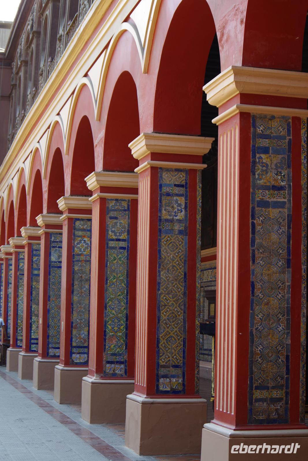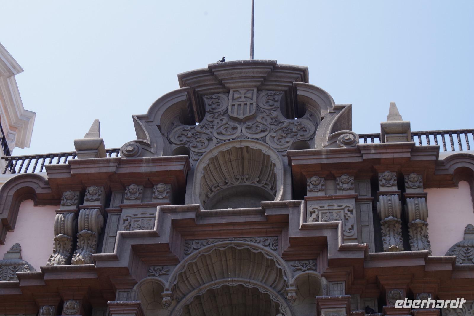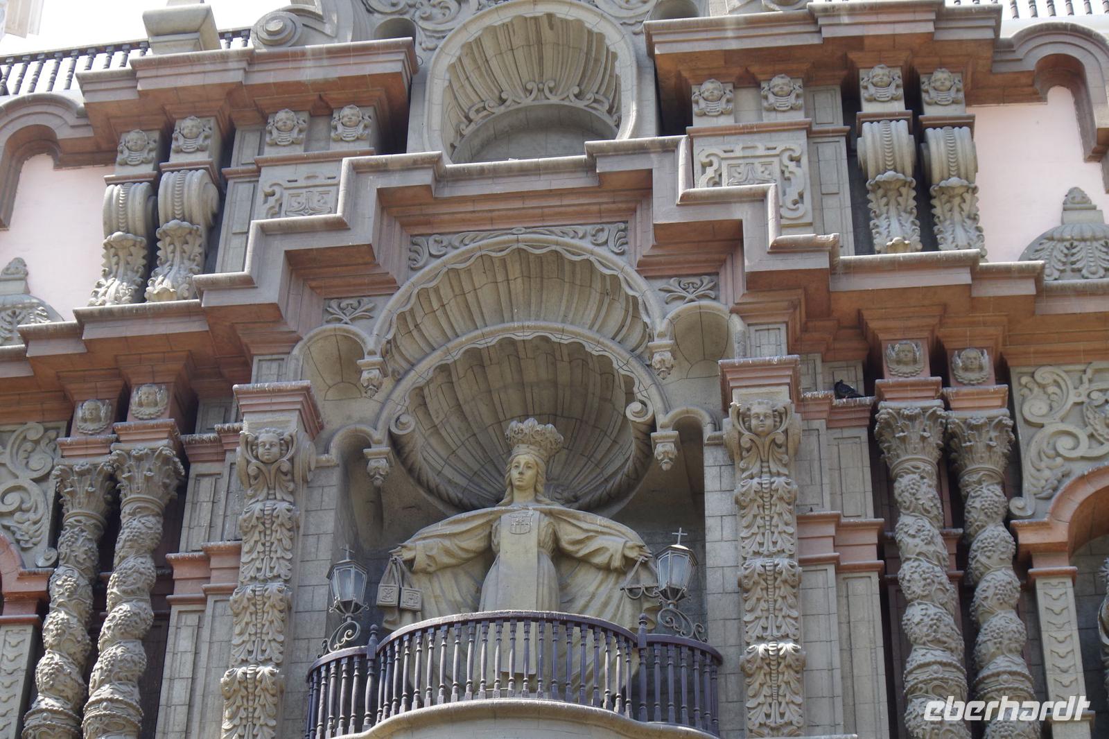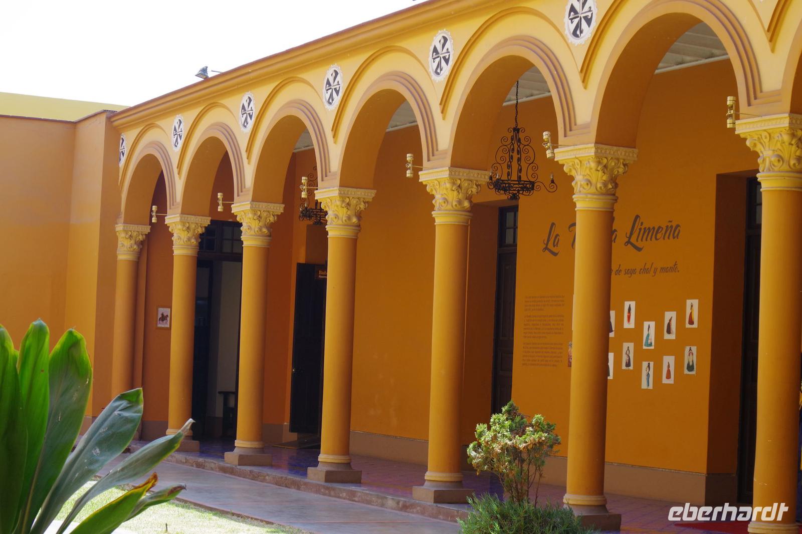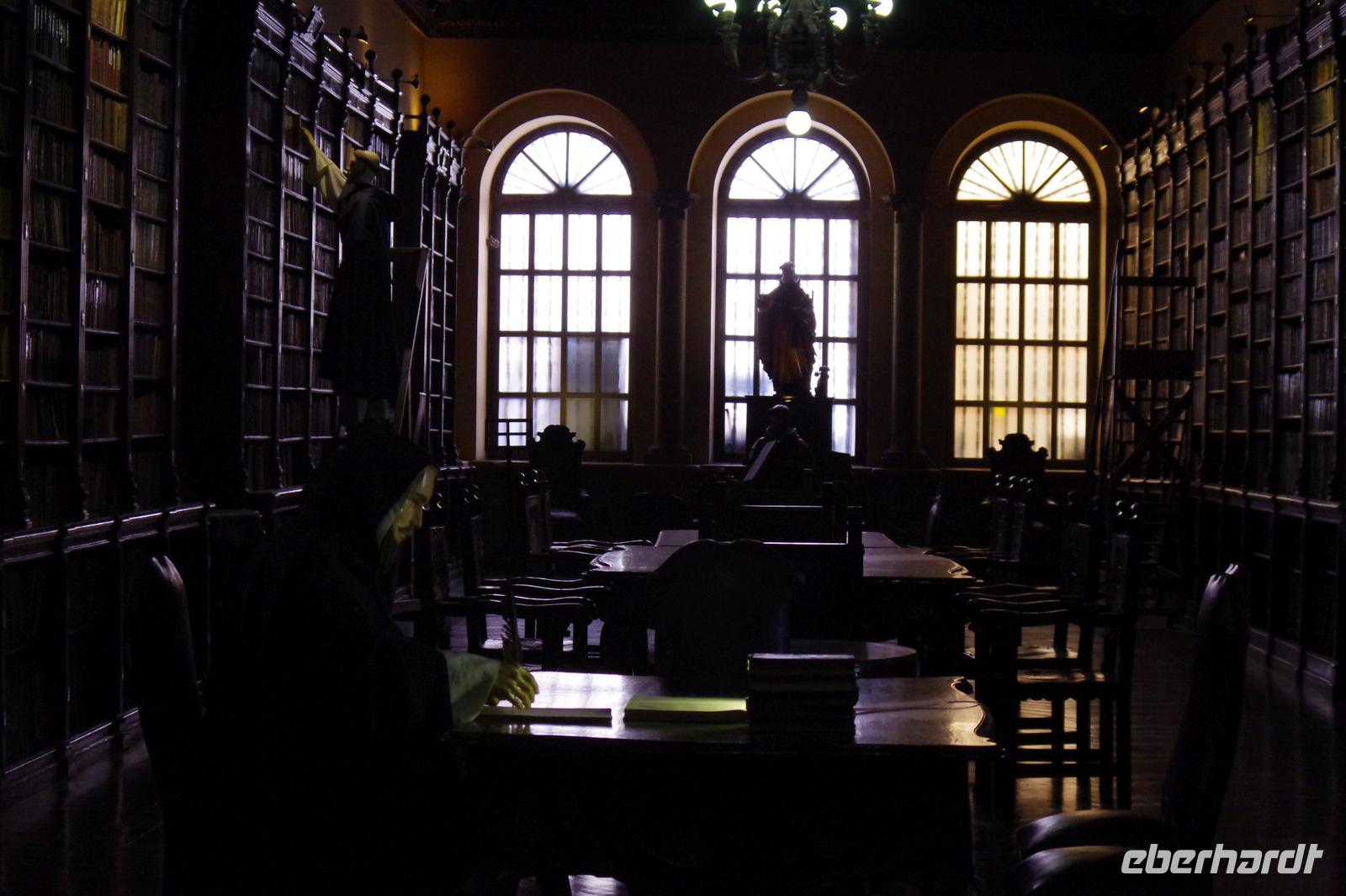 Wir fuhren dann weiter Richtung Plaza de Armas, dem eindrucksvollen und bekannten Platz der peruanischen Hauptstadt. Die Kathedrale Limas konnte man auch kurz vom innen betrachten, in der beispielsweise der mumifizierte Leichnam Pizarros zu sehen ist. Anschließend besuchten wir das Kloster Santo Domingo, eine wirklich schöne Anlage. Besonders bekannt ist es wegen des ersten peruanischen Heiligen, der dort einen Großteil seines Lebens verbrachte, San Martin de Porres. Wir erhielten von Franz viele Informationen über ihn, aber auch über Santa Rosa de Lima, deren Schädel im Kloster zu sehen war.