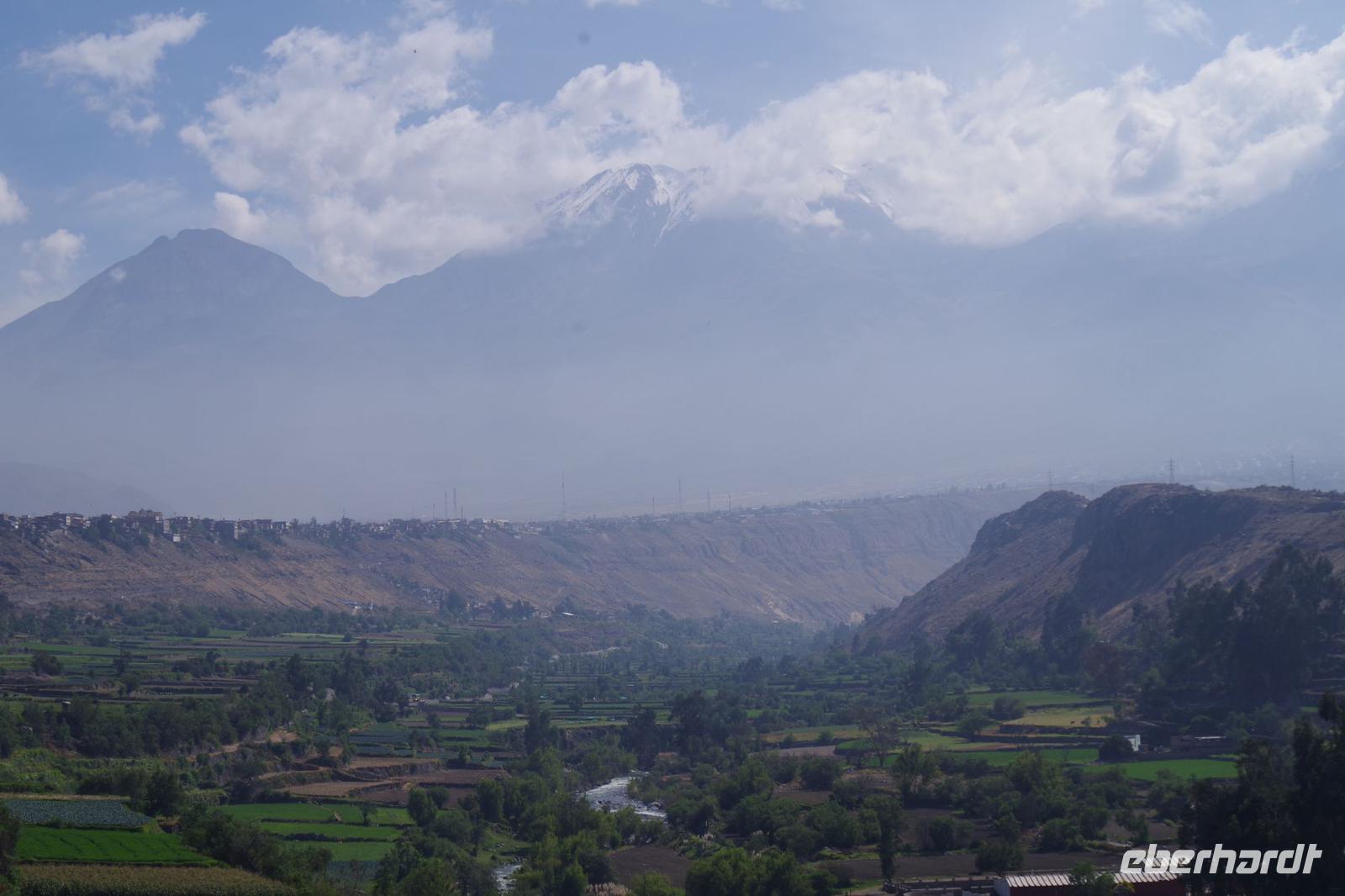 Nach dem Frühstück trafen wir auf unsere heutige Reiseleiterin, Paula. Wir fuhren mit dem Bus zu einem Aussichtspunkt,, wo wir einen tollen Ausblick auf die Vulkane El Misti (5.822 m) , Chachani (6.057 m) und Pichu Pichu (5.664 m) hatten.