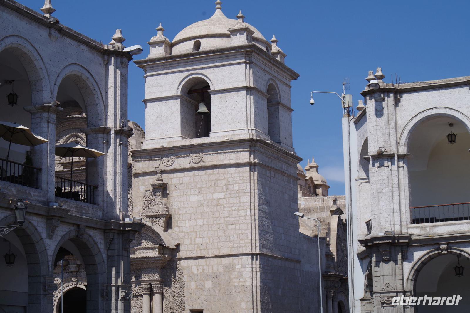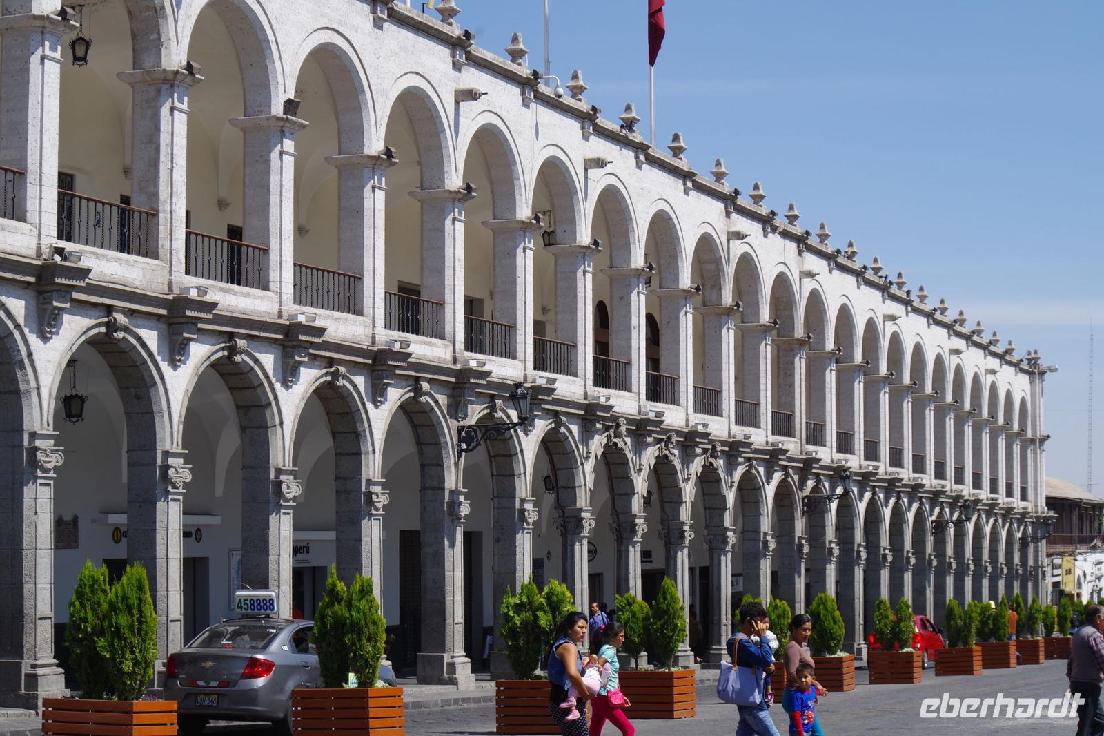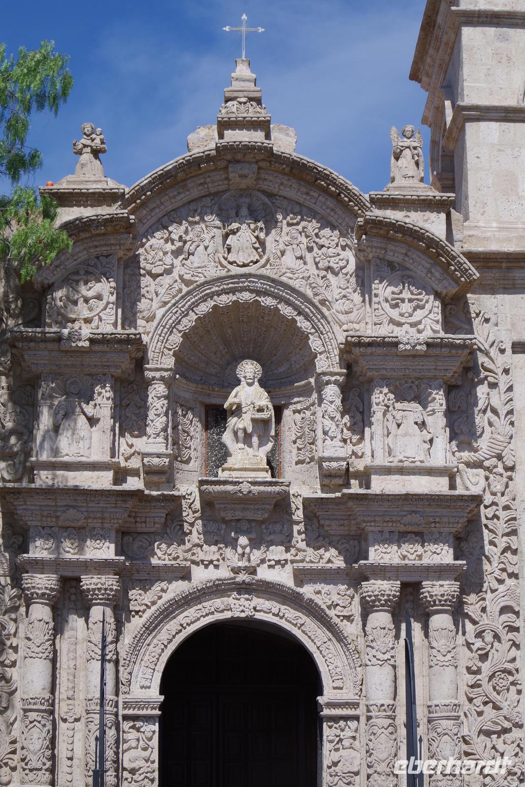 Von dort aus war es nicht weit bis das Stadtzentrum. Wir sahen uns dann die Kathedrale am Plaza de Armas an, welche durch Erdbeben schon mehrmals eingestürzt war, jedoch immer wieder aufgebaut wurde. Sie erstreckt sich über die gesamte Länge des Plaza de Armas und besteht aus weißem Gestein, welches vulkanischen Ursprung hat. Des Weiteren ist die Kathedrale der Sitz des Erzbischofs.