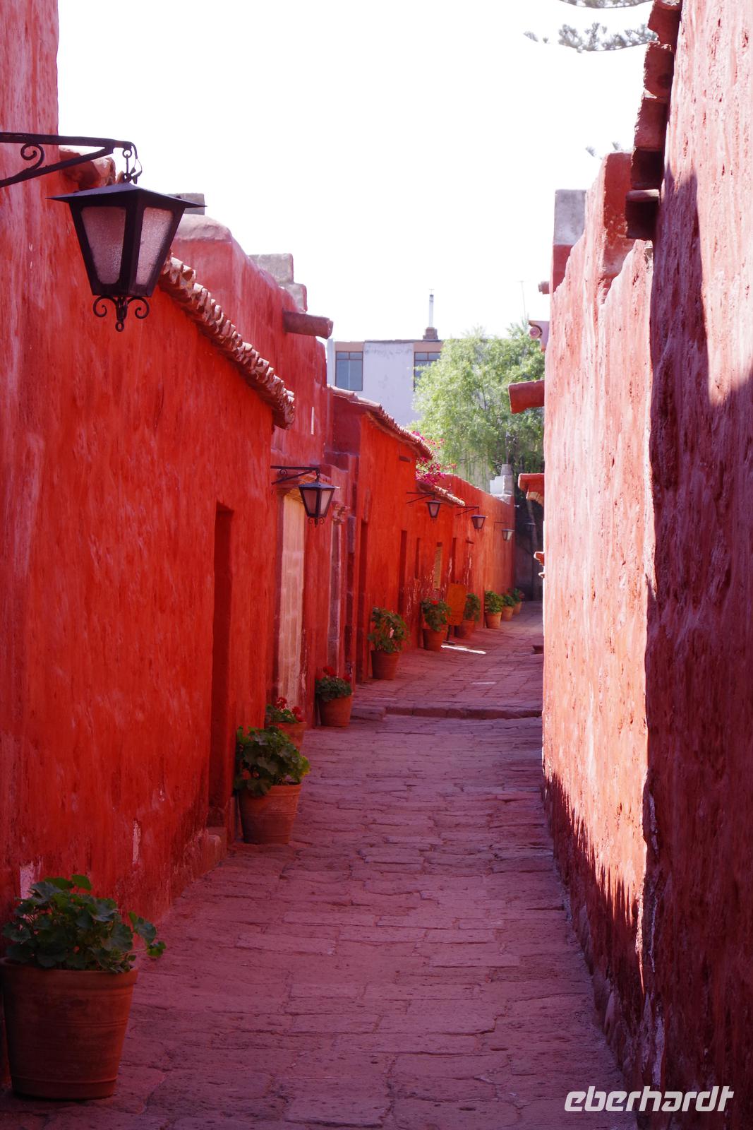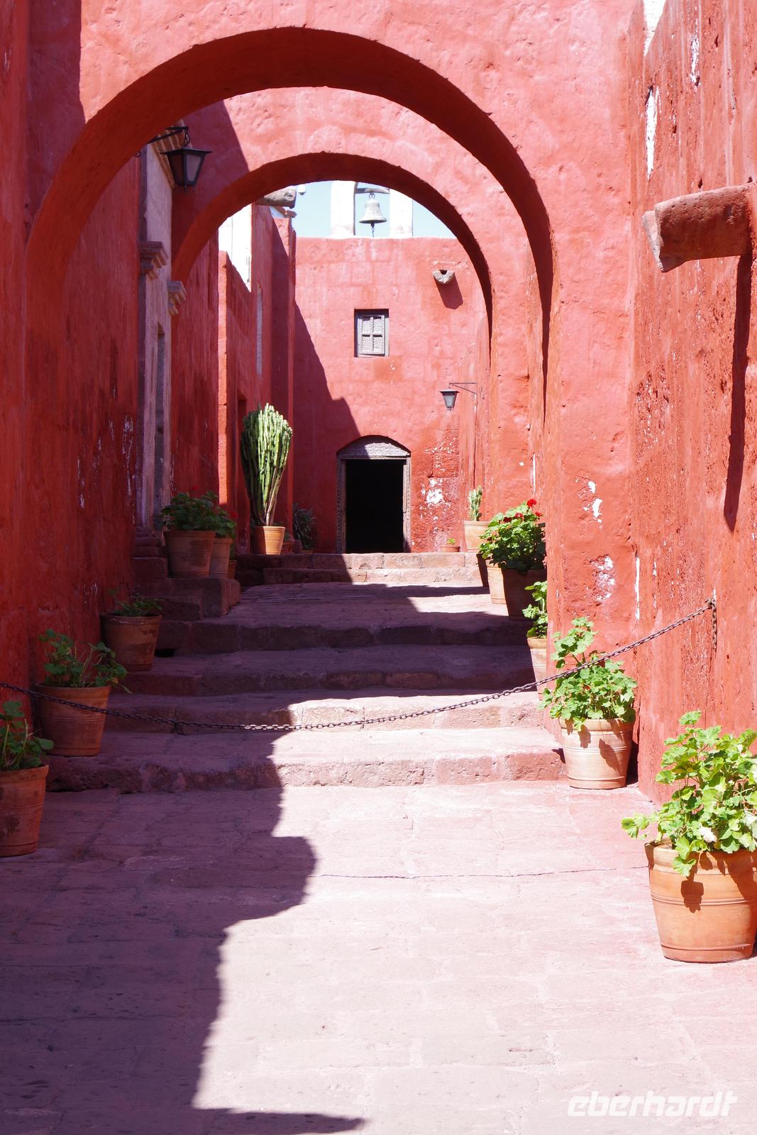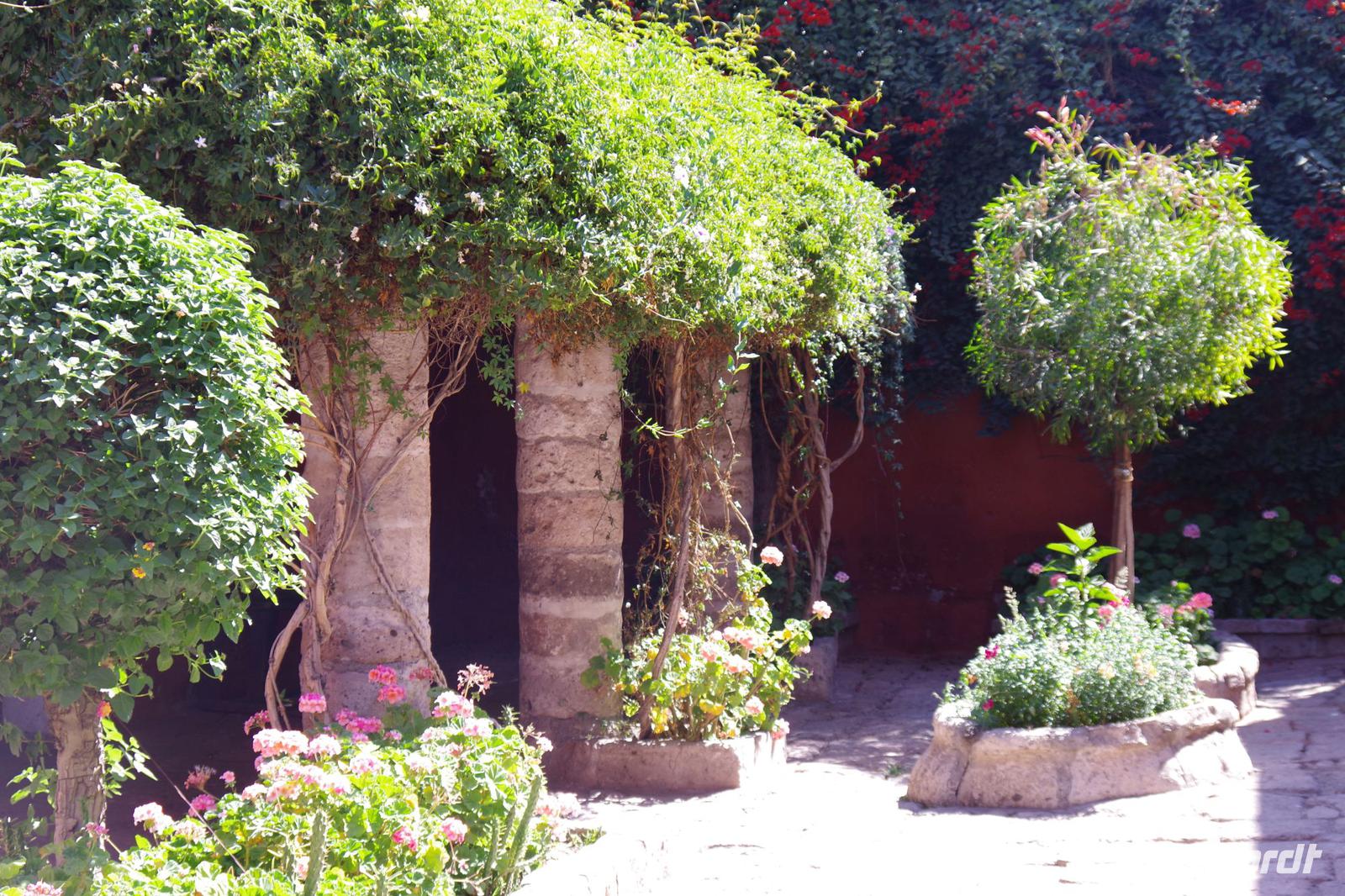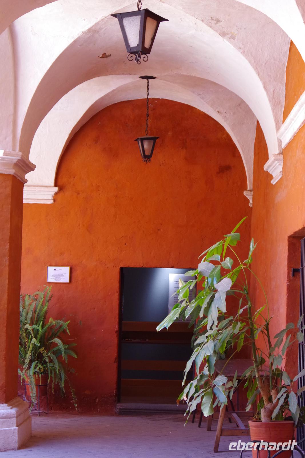 Im Anschluss verabschiedeten wir uns schon wieder von Paula und besuchten das Kloster Santa Catalina. Dort erhielten wir eine interessante Führung durch das wirklich große Kloster. Es hat eine sehr schöne Anlage, fast wie eine kleine Stadt, dennoch ist die Behandlung der Frauen dort schrecklich gewesen. Sie waren regelrecht eingesperrt, konnten mit ihrer Familie nur durch ein Gitter sprechen, wobei sie natürlich auch nicht unbeobachtet waren. Durch Dienerinnen konnten Informationen außerhalb des Klosters befördert werden, beziehungsweise erhielten die Nonnen auch so Nachrichten aus Arequipa. Das Kloster wurde nur von Spanierinnen genutzt und der Aufenthalt war mit einer Menge Geld verbunden. Somit war es nur den wohlhabenden Familien möglich, ihre Kinder in das Kloster zu schicken. Dementsprechend war es gut angesehen, wenn man sein Kind in diesem Kloster hatte.