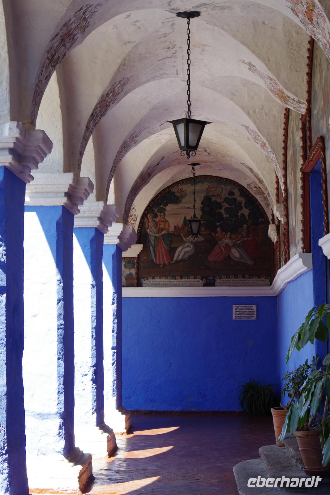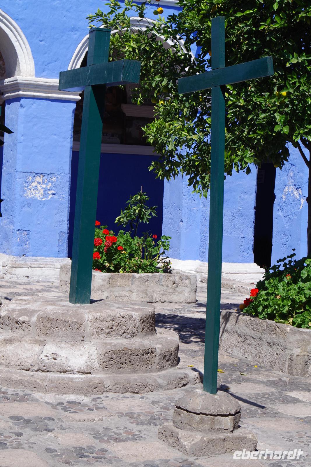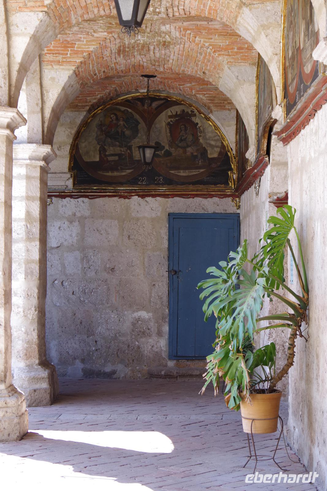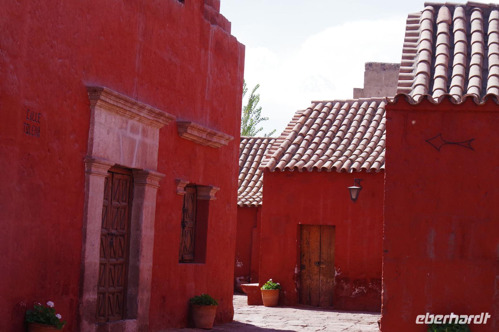 Im Anschluss verabschiedeten wir uns schon wieder von Paula und besuchten das Kloster Santa Catalina. Dort erhielten wir eine interessante Führung durch das wirklich große Kloster. Es hat eine sehr schöne Anlage, fast wie eine kleine Stadt, dennoch ist die Behandlung der Frauen dort schrecklich gewesen. Sie waren regelrecht eingesperrt, konnten mit ihrer Familie nur durch ein Gitter sprechen, wobei sie natürlich auch nicht unbeobachtet waren. Durch Dienerinnen konnten Informationen außerhalb des Klosters befördert werden, beziehungsweise erhielten die Nonnen auch so Nachrichten aus Arequipa. Das Kloster wurde nur von Spanierinnen genutzt und der Aufenthalt war mit einer Menge Geld verbunden. Somit war es nur den wohlhabenden Familien möglich, ihre Kinder in das Kloster zu schicken. Dementsprechend war es gut angesehen, wenn man sein Kind in diesem Kloster hatte.