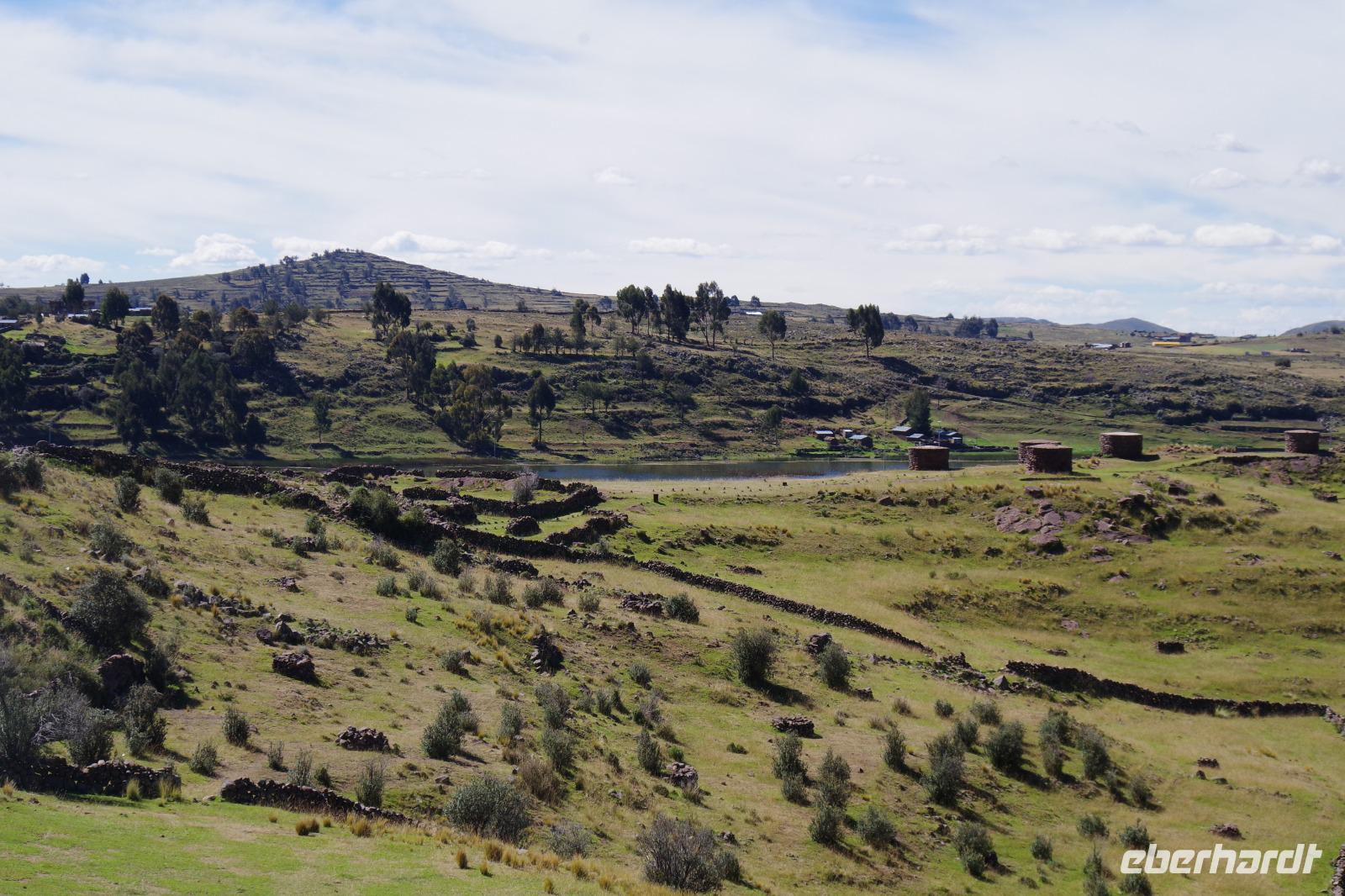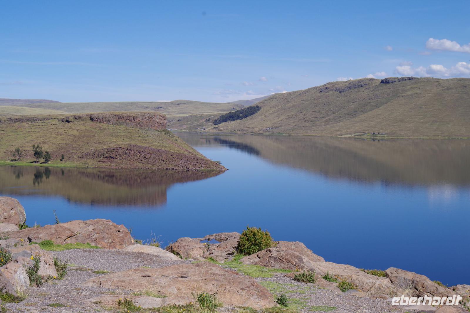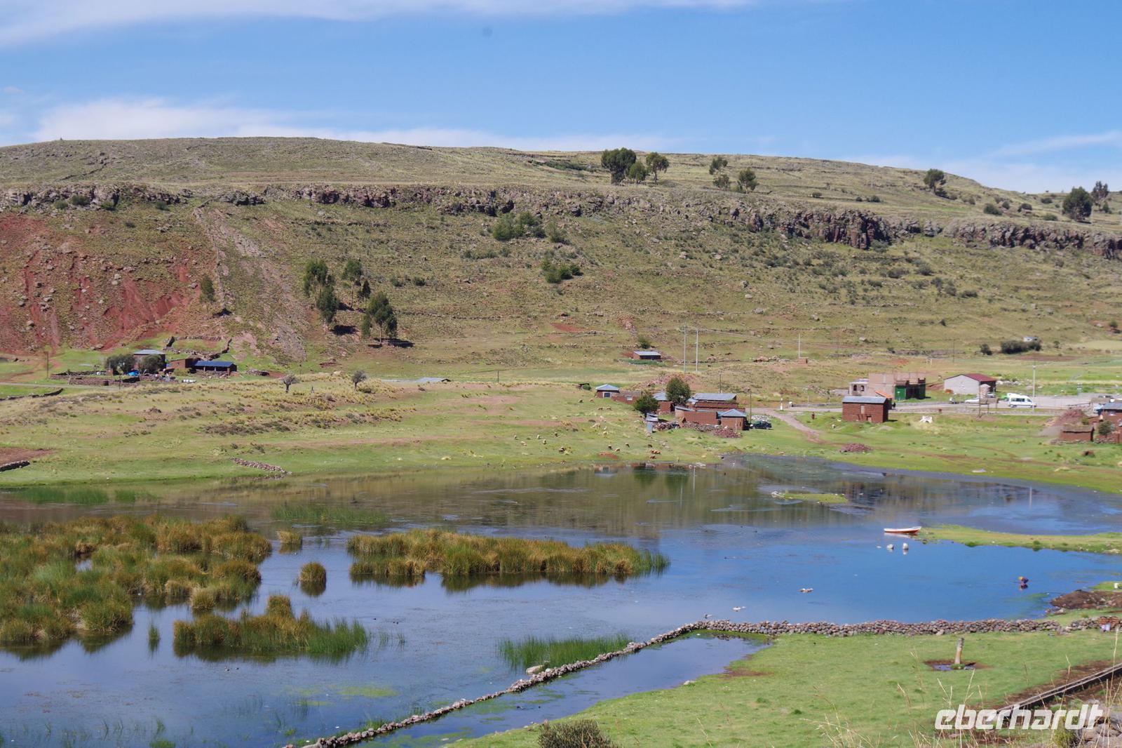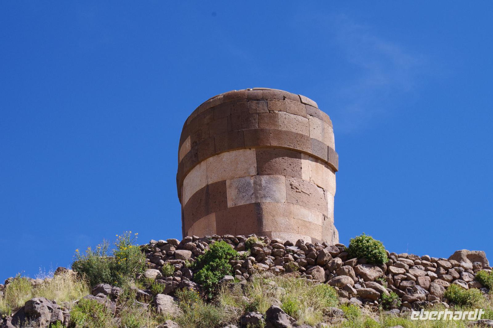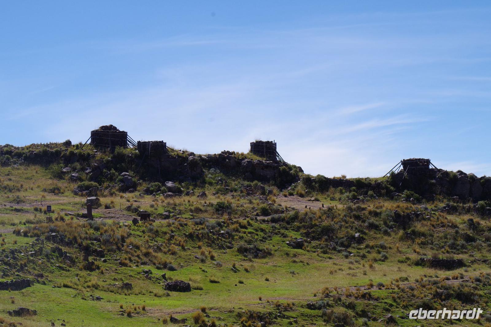 Heute verabschiedeten wir uns schon wieder von Arequipa. Inka, unsere neue Reiseleiterin, holte uns am Hotel ab und wir machten uns auf den Weg nach Puno. Während der Fahrt konnten wir beobachten, wie die Vegetation immer mehr abnahm. Inmitten der beindruckenden Landschaft sahen wir viele Lamas, Alpakas und Vicuñas. Um uns an die Höhe zu gewöhnen machten, wir mehrere Stopps und tranken auch einen Inka Tee zur Unterstützung. Es wurden an der Straße jede Menge sehr hübsche Produkte aus Alpakawolle von den Einheimischen verkauft. Bald erreichten wir auch schon den höchsten Punkt unserer gesamten Reise. Wir fuhren über den Crucero Alto, welcher eine Höhe von 4.528 Metern hat. Unsere Fahrt führte uns weiter durch Juliaca. Die Stadt ist unglaublich schnell gewachsen, sie existiert erst 92 Jahre und mittlerweile leben schon 320.000 Menschen dort. Gegen Mittag erreichten wir die Grabtürme von Sillustani. Inka führte uns über die Anlage. Wir waren ganz allein und konnten die Schönheit des Umayo-Sees in absoluter Ruhe genießen. Das war ein besonders schönes Erlebnis. Die Grabtürme dort stammen von den Collas. Deren Toten wurden mit verschiedenen Opfergaben in Position eines Embryos in einen solchen Turm geschoben, um so in Frieden zu ruhen. Leider wurden viele Opfergaben bereits vor langer Zeit von Grabplünderern mitgenommen. Entstanden sind die Türme bereits etwa im Jahr 1.000 nach Christus. Es ist unglaublich, wie zur damaligen Zeit Steine in solch einer Größe durch primitivste Mittel transportiert werden konnten.