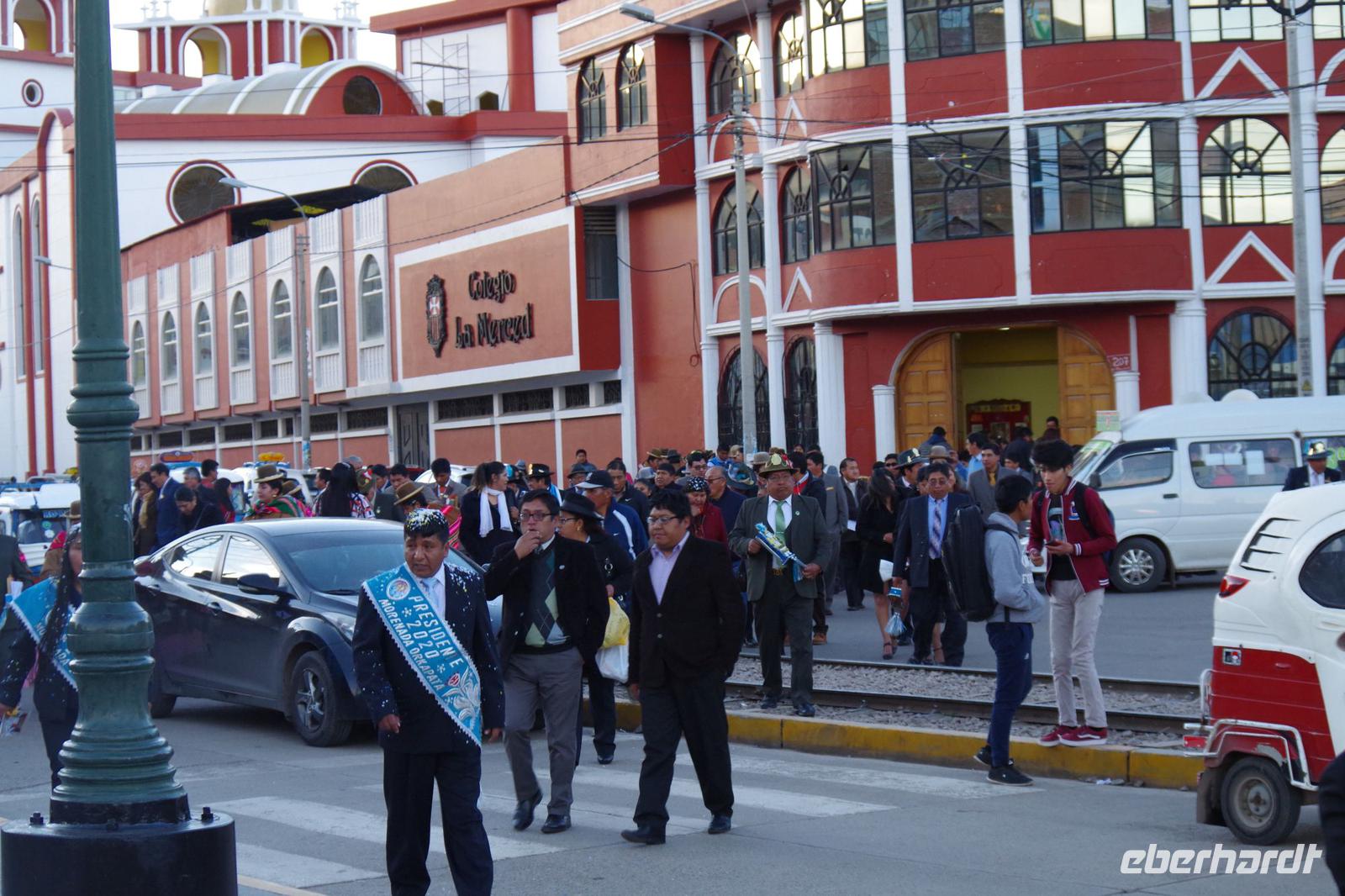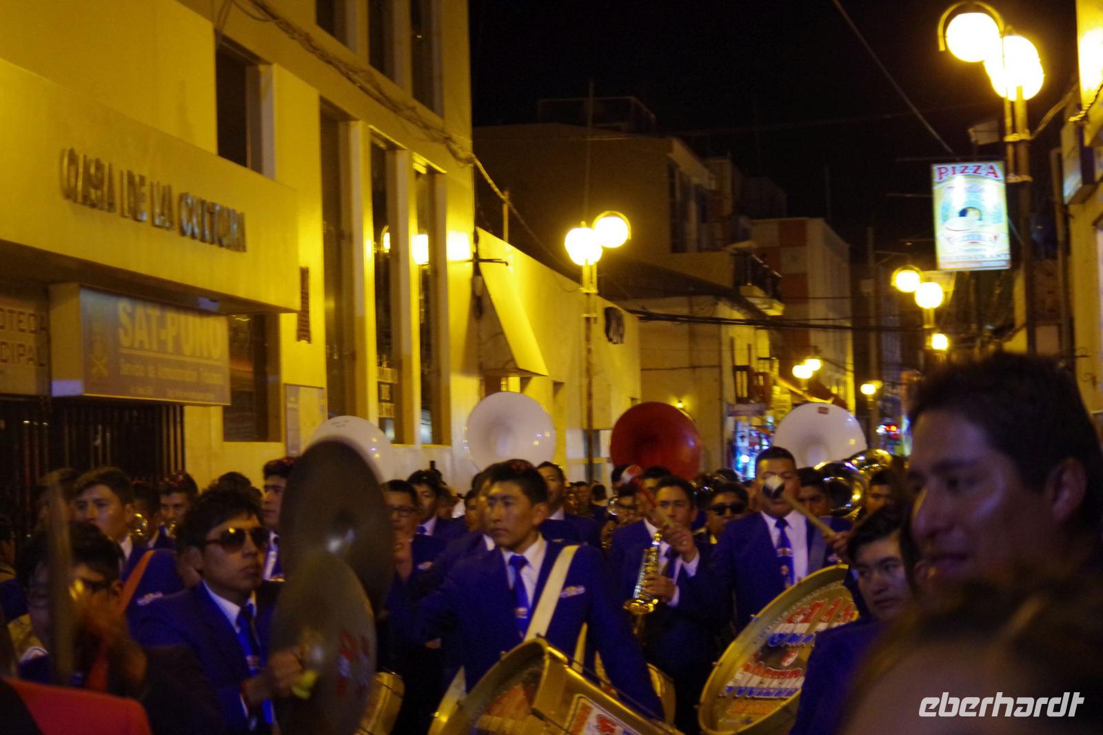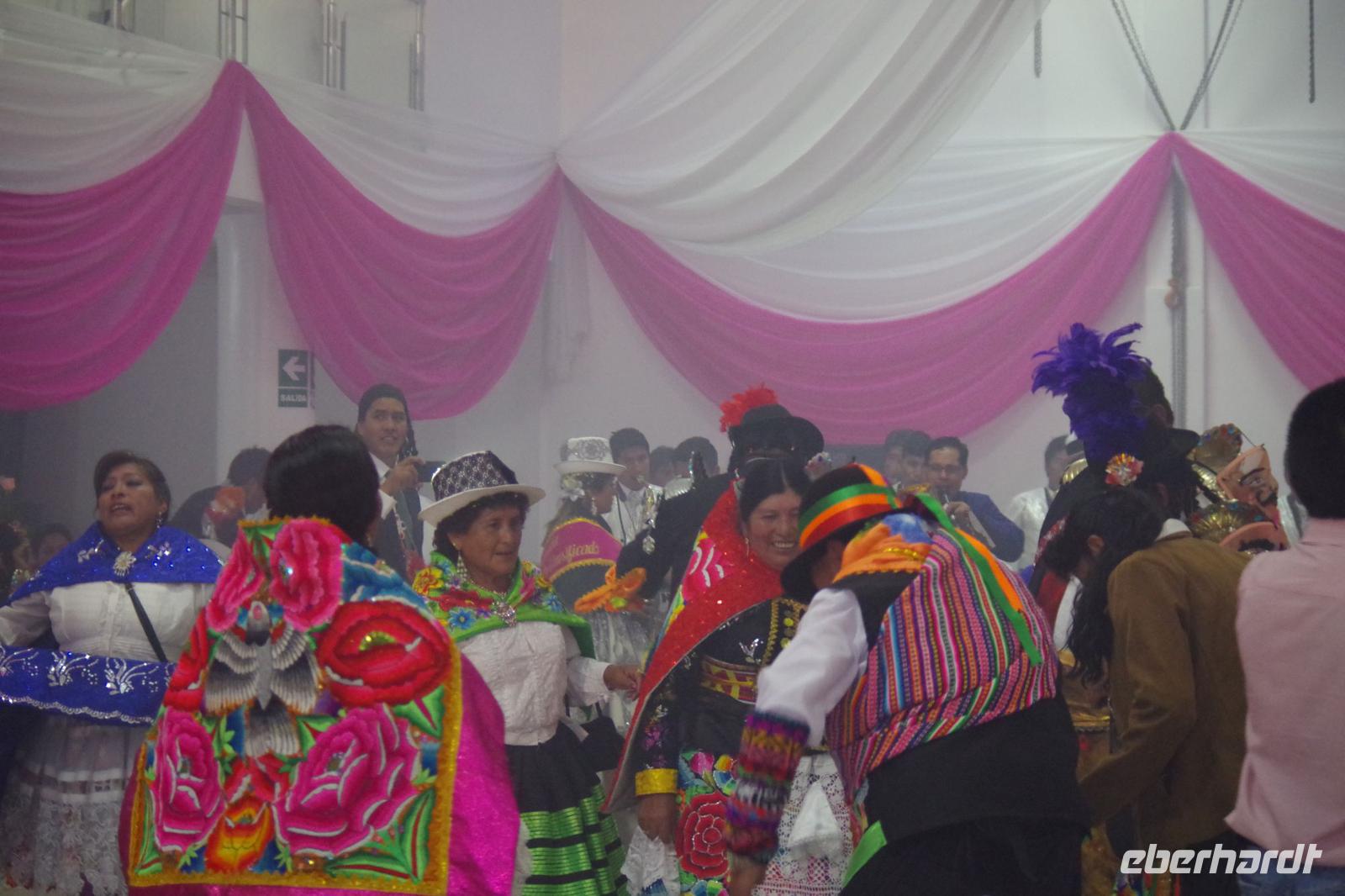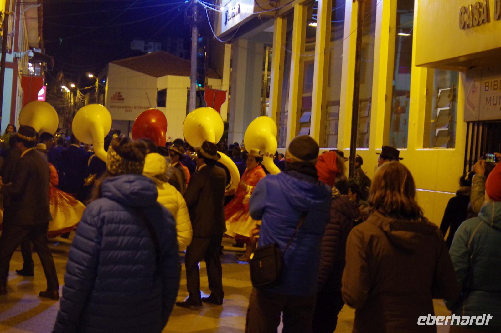 Im Anschluss machten wir uns auf den Weg nach Puno, wo wir am Nachmittag unser Hotel erreichten. Nach dem Zimmerbezug ruhte man sich erst einmal etwas aus, ging noch etwas essen oder zum Markt. Samstags ist immer Wochenmarkt in Puno, der sich über fünf Kilometer erstreckt. Dort wurden sämtliche Produkte von den Einheimischen angeboten. Von vielen Obst-und Gemüsesorten über Eheringe hinzu Kinderspielzeug war alles dabei. Auf dem Weg zum Markt trafen wir auf eine Hochzeitsgesellschaft, die uns direkt in ihre Feier integrierte. Wir tanzten fröhlich zu peruanischer Musik mit. Mit Einbruch der Dämmerung startete ein großer Straßenumzug, namens „Festividad de la Virgen de la Candelaria". Wir konnten die lebhaften Tänze, bunte Kostüme und die typische, aber sehr laute, Musik direkt miterleben. Gemeinsam aßen wir in einem Restaurant unweit des Hotels.