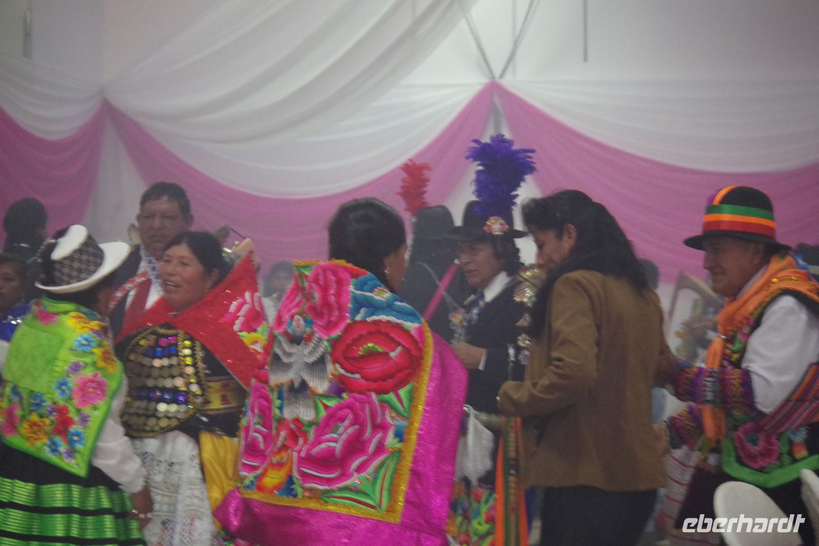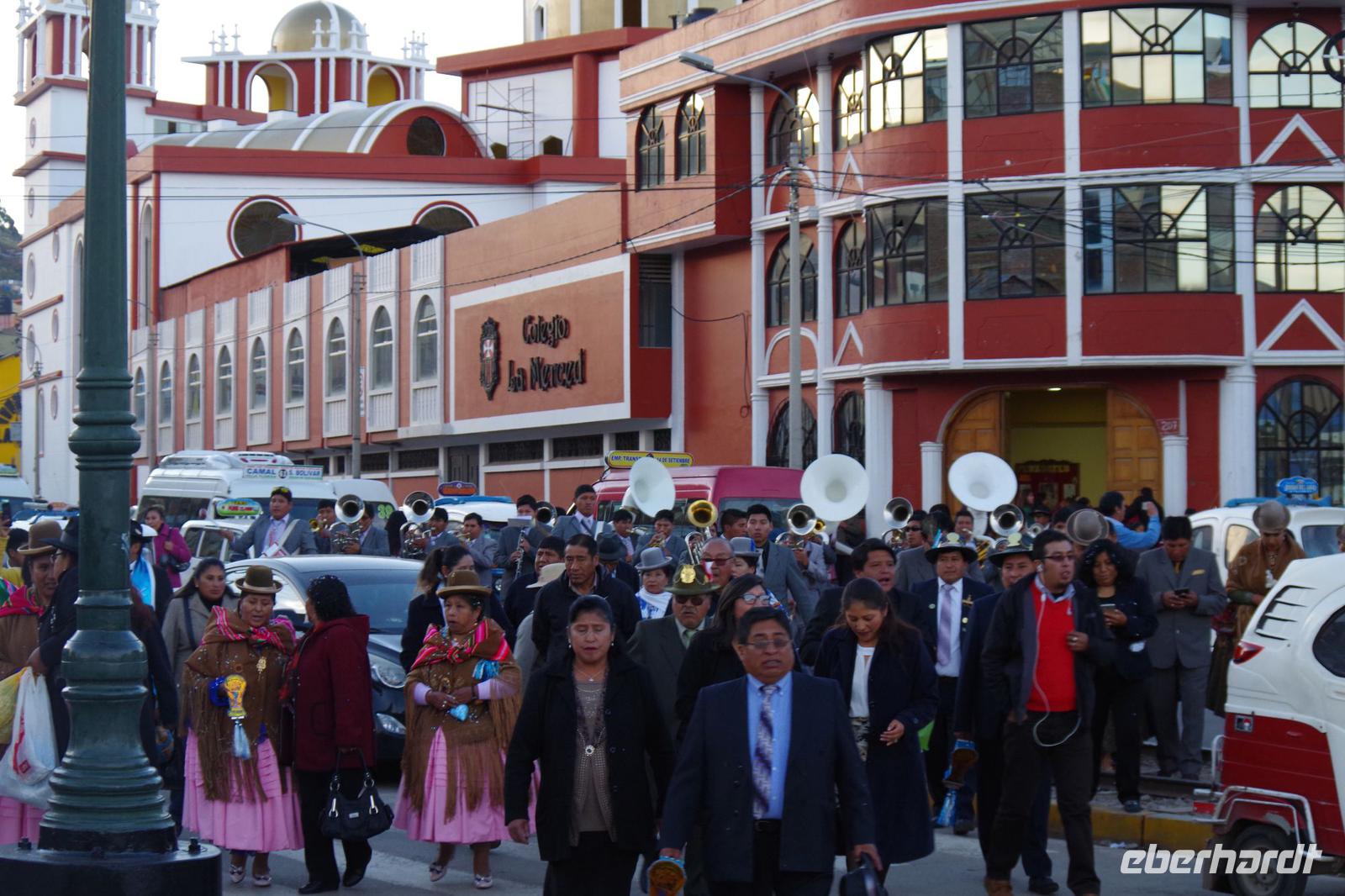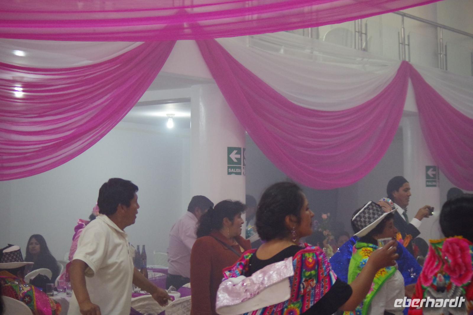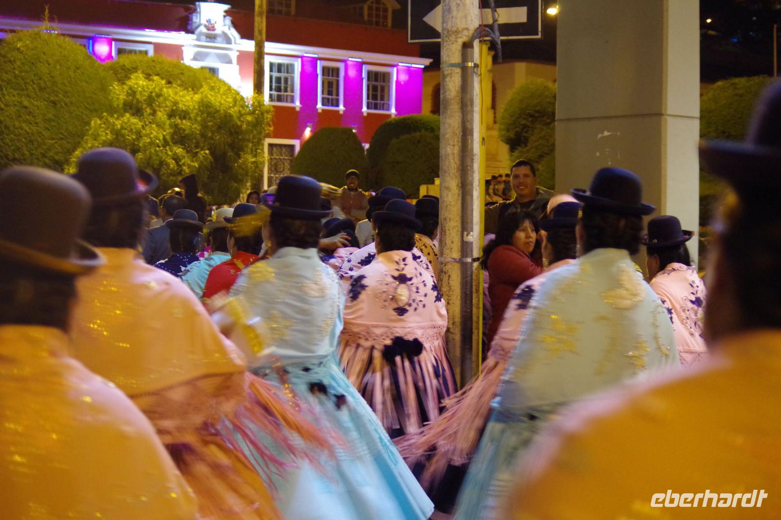 Im Anschluss machten wir uns auf den Weg nach Puno, wo wir am Nachmittag unser Hotel erreichten. Nach dem Zimmerbezug ruhte man sich erst einmal etwas aus, ging noch etwas essen oder zum Markt. Samstags ist immer Wochenmarkt in Puno, der sich über fünf Kilometer erstreckt. Dort wurden sämtliche Produkte von den Einheimischen angeboten. Von vielen Obst-und Gemüsesorten über Eheringe hinzu Kinderspielzeug war alles dabei. Auf dem Weg zum Markt trafen wir auf eine Hochzeitsgesellschaft, die uns direkt in ihre Feier integrierte. Wir tanzten fröhlich zu peruanischer Musik mit. Mit Einbruch der Dämmerung startete ein großer Straßenumzug, namens „Festividad de la Virgen de la Candelaria". Wir konnten die lebhaften Tänze, bunte Kostüme und die typische, aber sehr laute, Musik direkt miterleben. Gemeinsam aßen wir in einem Restaurant unweit des Hotels.