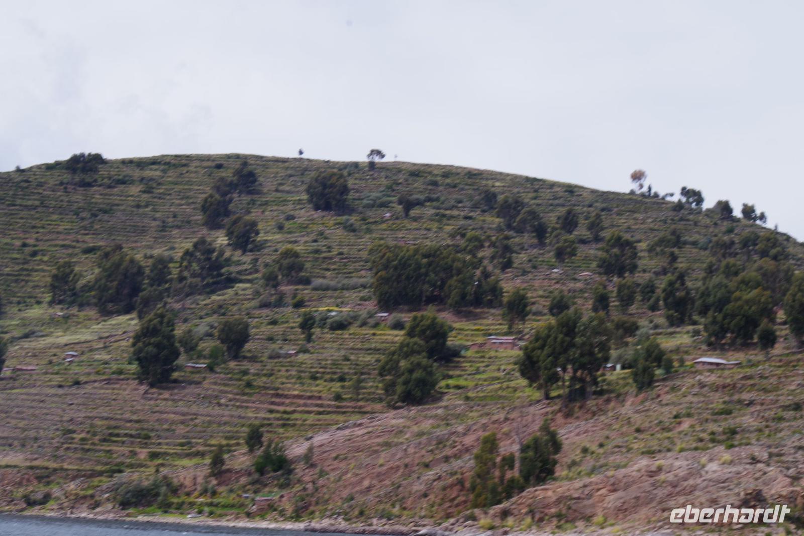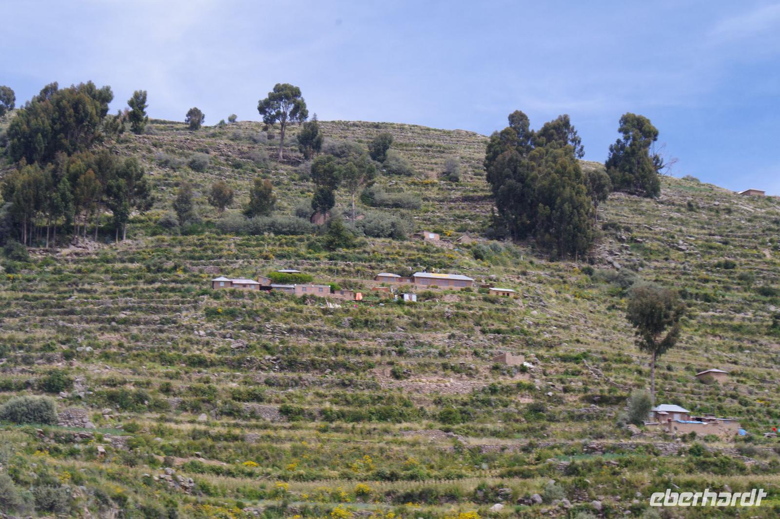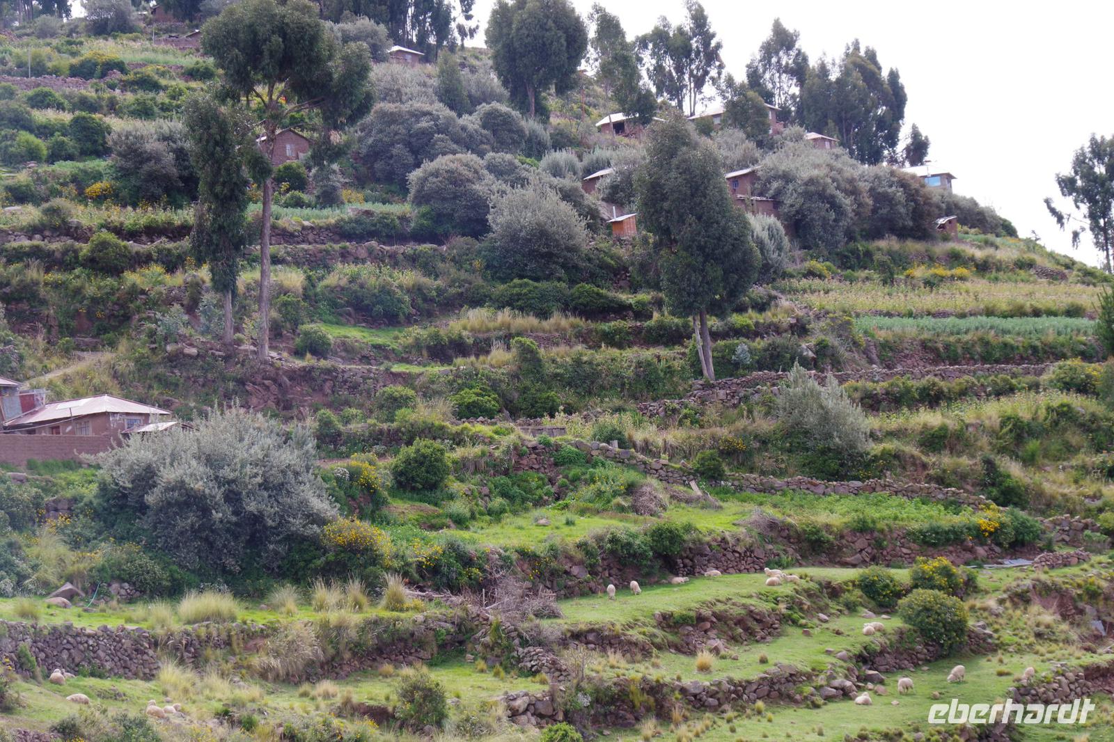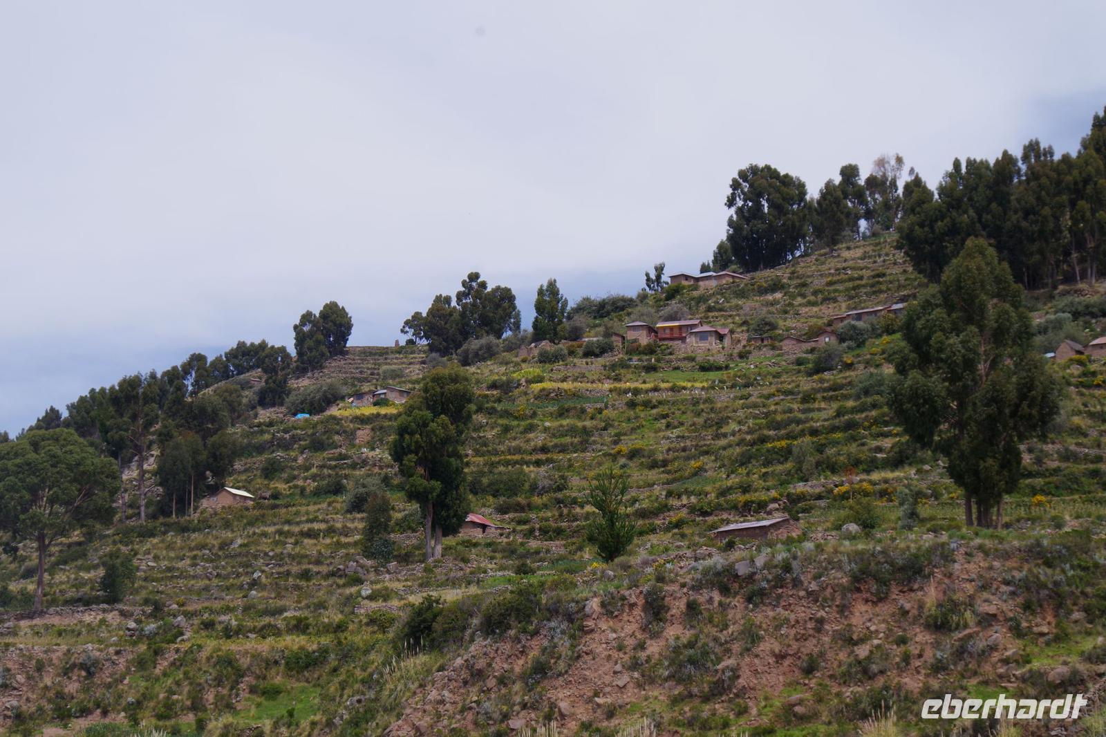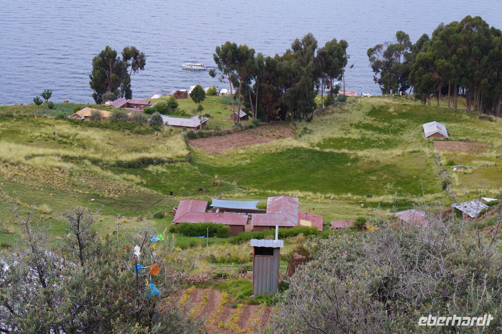 Wir fuhren dann etwas über zwei Stunden zur Taquile Insel. Dort lebt ein indigenes Volk in einer Kommune. Alles gehört allen und alle Bewohner haben etwa gleichviel Besitz. Jeder Bewohner ist auch verpflichtet, eine Arbeit auszuüben, dazu zählt hauptsächlich die Feldarbeit, aber auch die Web- oder Strickarbeit. In allen Restaurants werden die gleichen Speisen zu gleichen Preisen angeboten. Die quechuasprachigen Bewohner leben hauptsächlich vegetarisch. Sie bauen Quinoa, Mais, Kartoffeln und vieles mehr an. Es wirkt etwas, als wäre die Zeit stehen geblieben, denn auf der Insel gibt es keine Fahrzeuge, keine Lasttiere und auch keinen Strom.