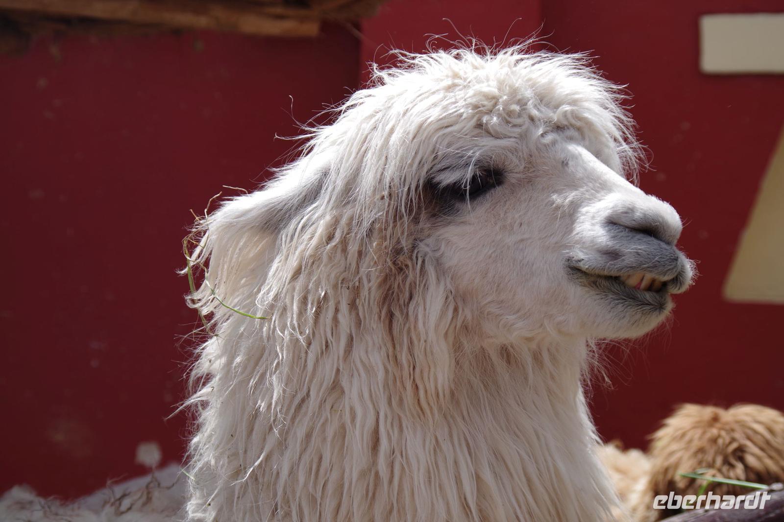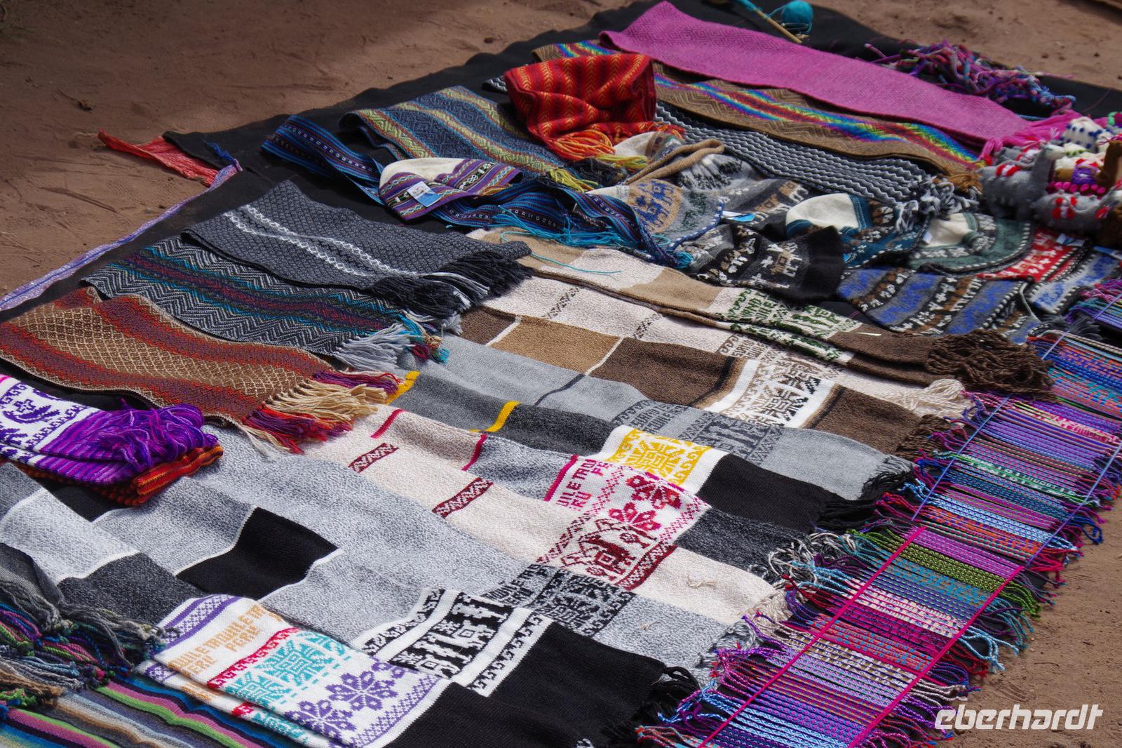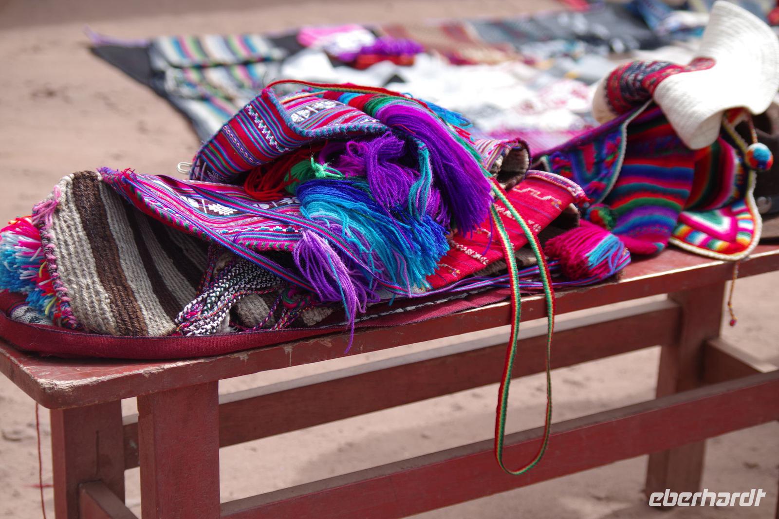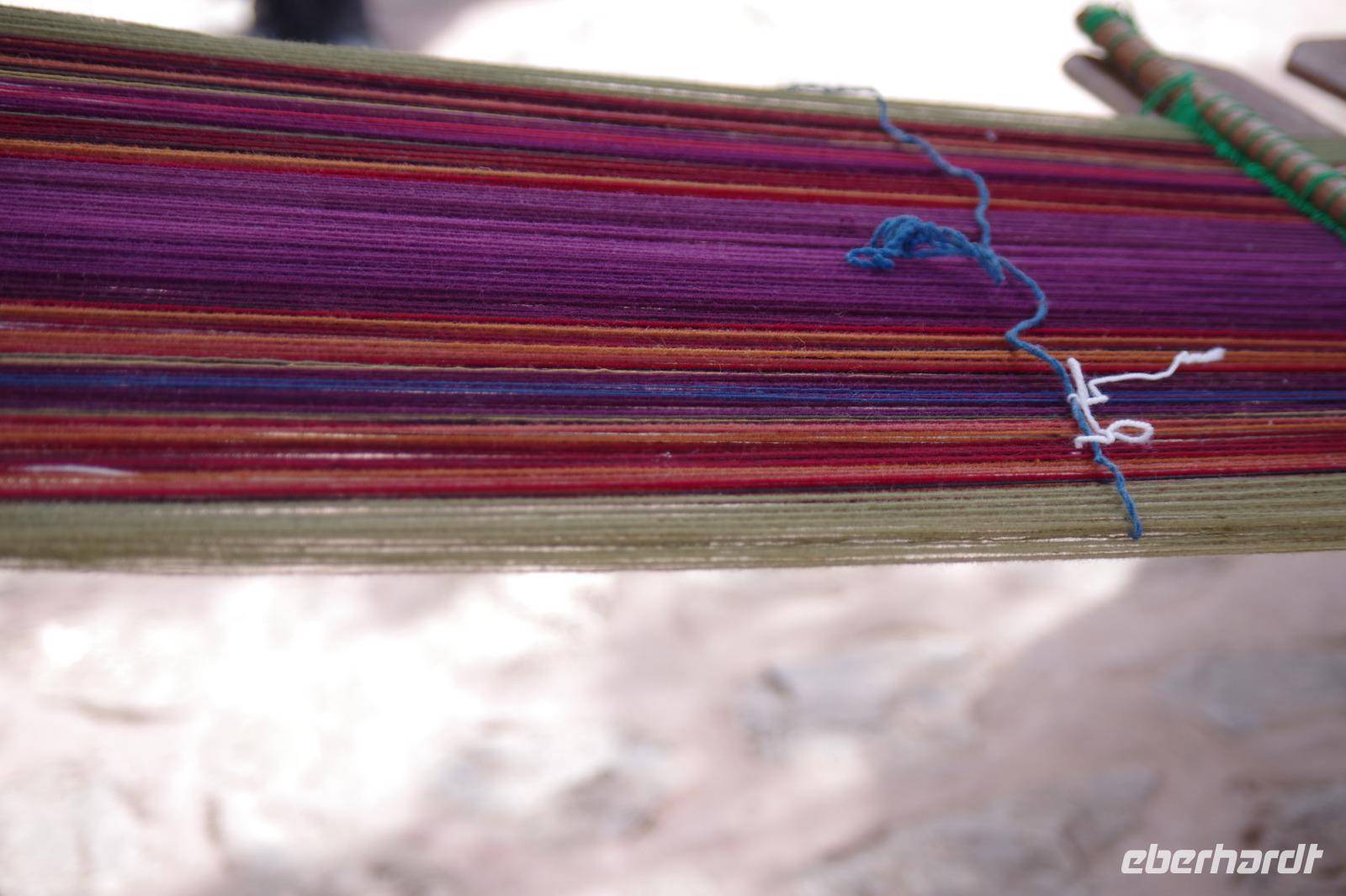 Nach etwas Zeit für den individuellen Bummel über den Markt setzten wir unsere Fahrt nach Chinchero fort. Dort besuchten wir eine Weberfamilie, die uns in ihrem Innenhof das Handwerk erklärte. Die Wolle wird nur mit natürlichen Stoffen gefärbt und behält dennoch die Farbe. Anschließend wurde uns gezeigt, wie aus der bunten Wolle gewebt wird. Für eine Decke werden 3.000 - 4.000 solcher Wollfäden benötigt. Hier bestand natürlich auch wieder die Möglichkeit, verschiedene Produkte zu erwerben.