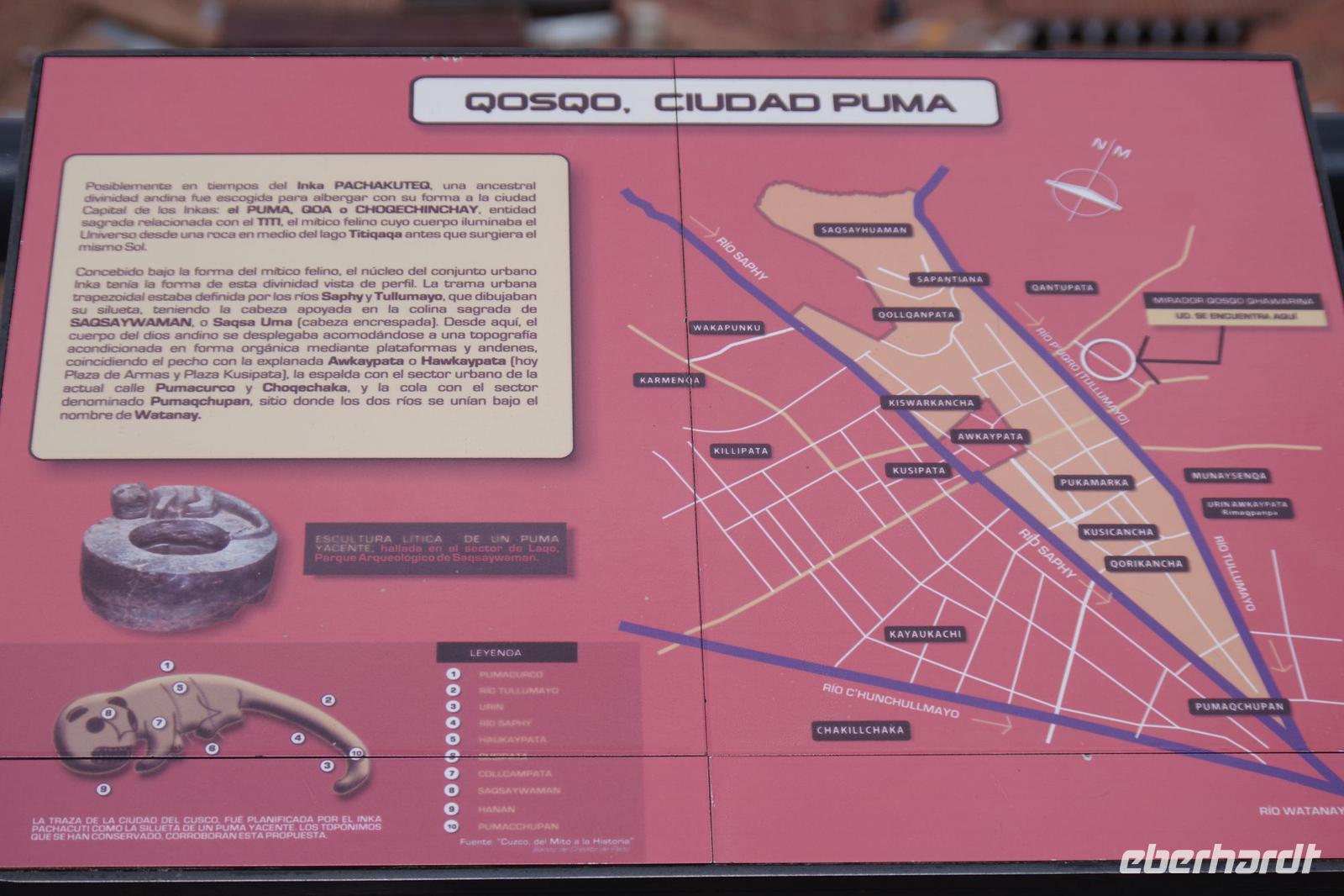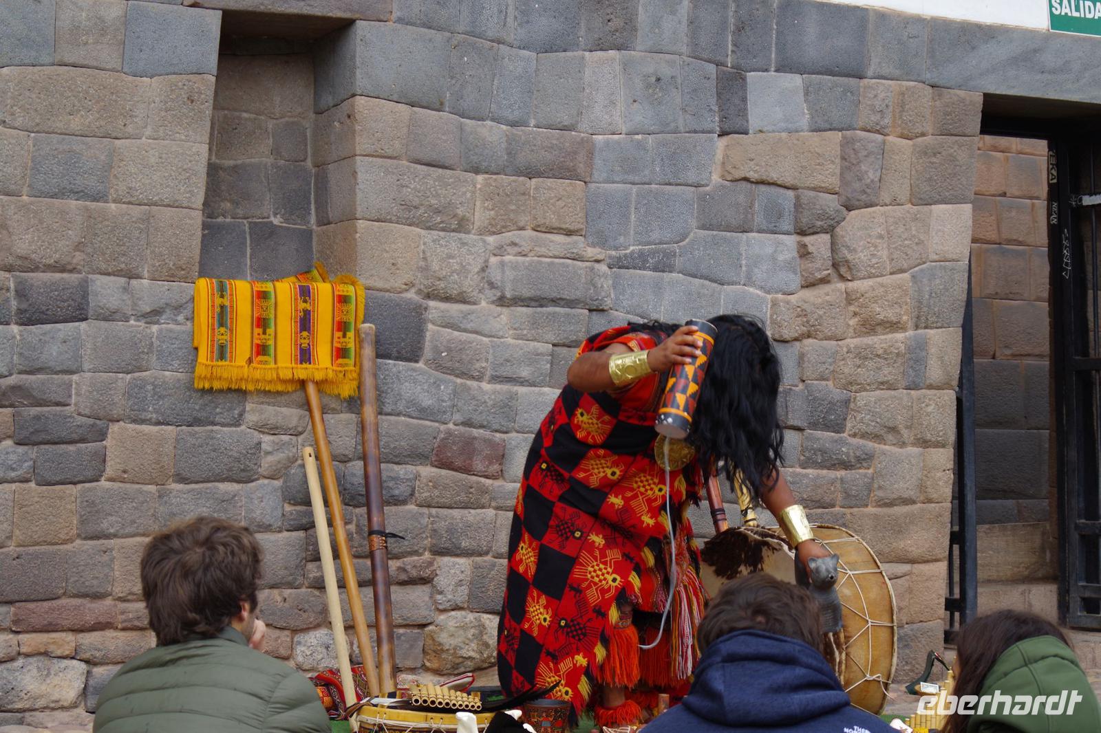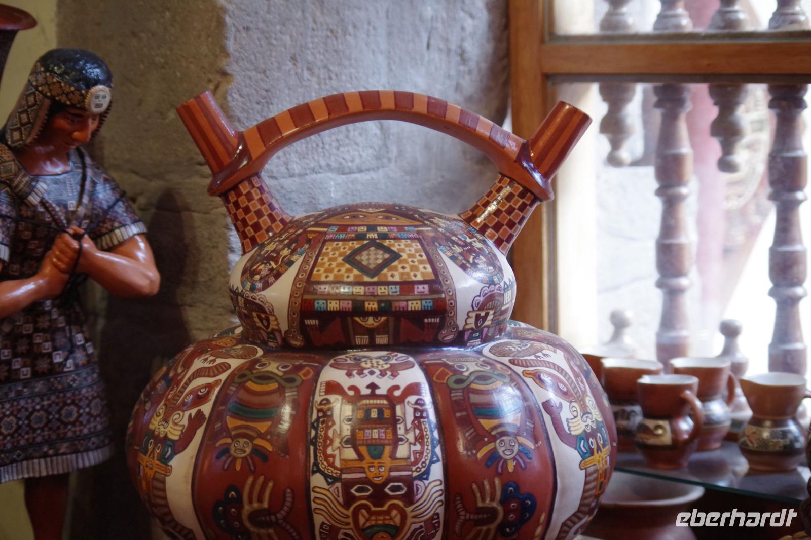 Nach dem Frühstück machten wir uns heute zu Fuß auf den Weg, Cusco zu erkunden. Wir spazierten zunächst durch viele kleine Gassen im Handwerkerviertel San Blas, in dem sich auch unser Hotel befindet. Wir schauten in einige Werkstätten und Galerien. In einem Geschäft wurden zum Beispiel viele Töpfereien mit Mustern, die typisch für die Inka waren, verkauft. In dem Geschäft sahen wir ein Plakat, das zeigte, wie groß einige Inka waren. Weitaus größer als die heutigen Peruaner.