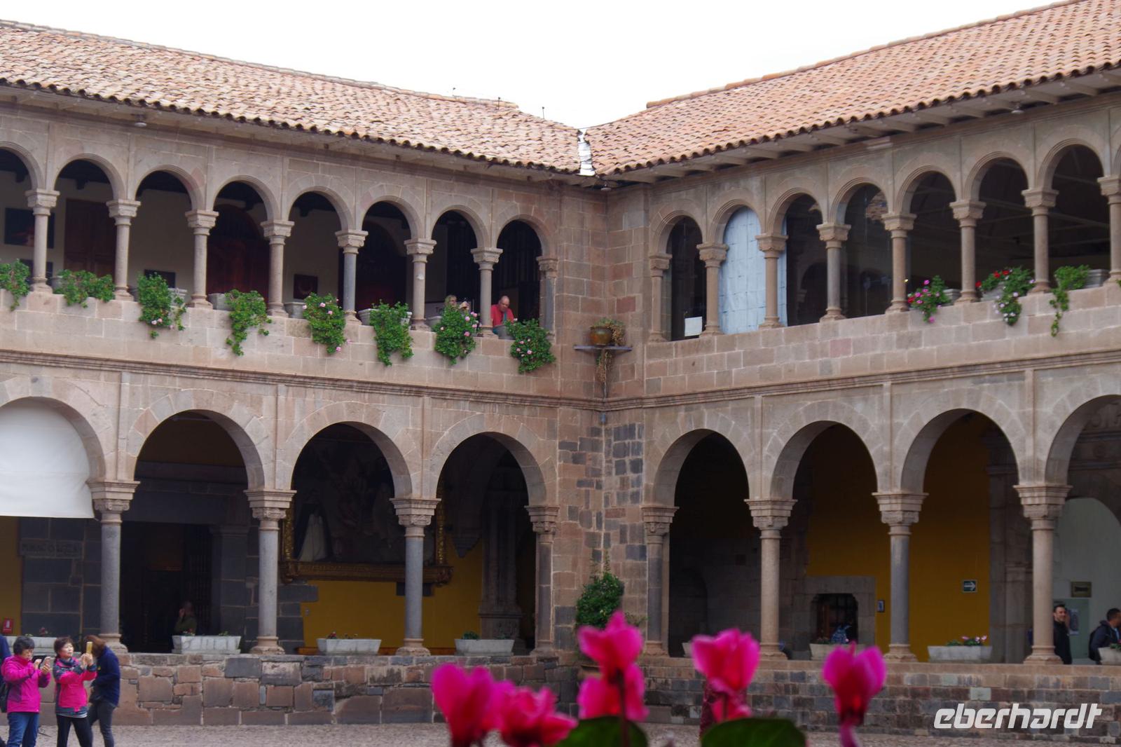 Im Anschluss besuchten wir noch den Sonnentempel Qorikancha, welcher die heiligste Stätte der Inka war. Wir konnten dort Inka Mauern im Original bestaunen, ein architektonisches Meisterwerk für die damalige Zeit. Errichtet wurde Qorikancha im Jahr 1438. Es sollen sich etwa 700 Platten Gold im Tempel befunden haben. Leider wurden alle Schätze durch die Spanier zerstört und das Gold eingeschmolzen. Die Anlage ist auch sehr schön gestaltet, mit einer Menge bunten Blumen.