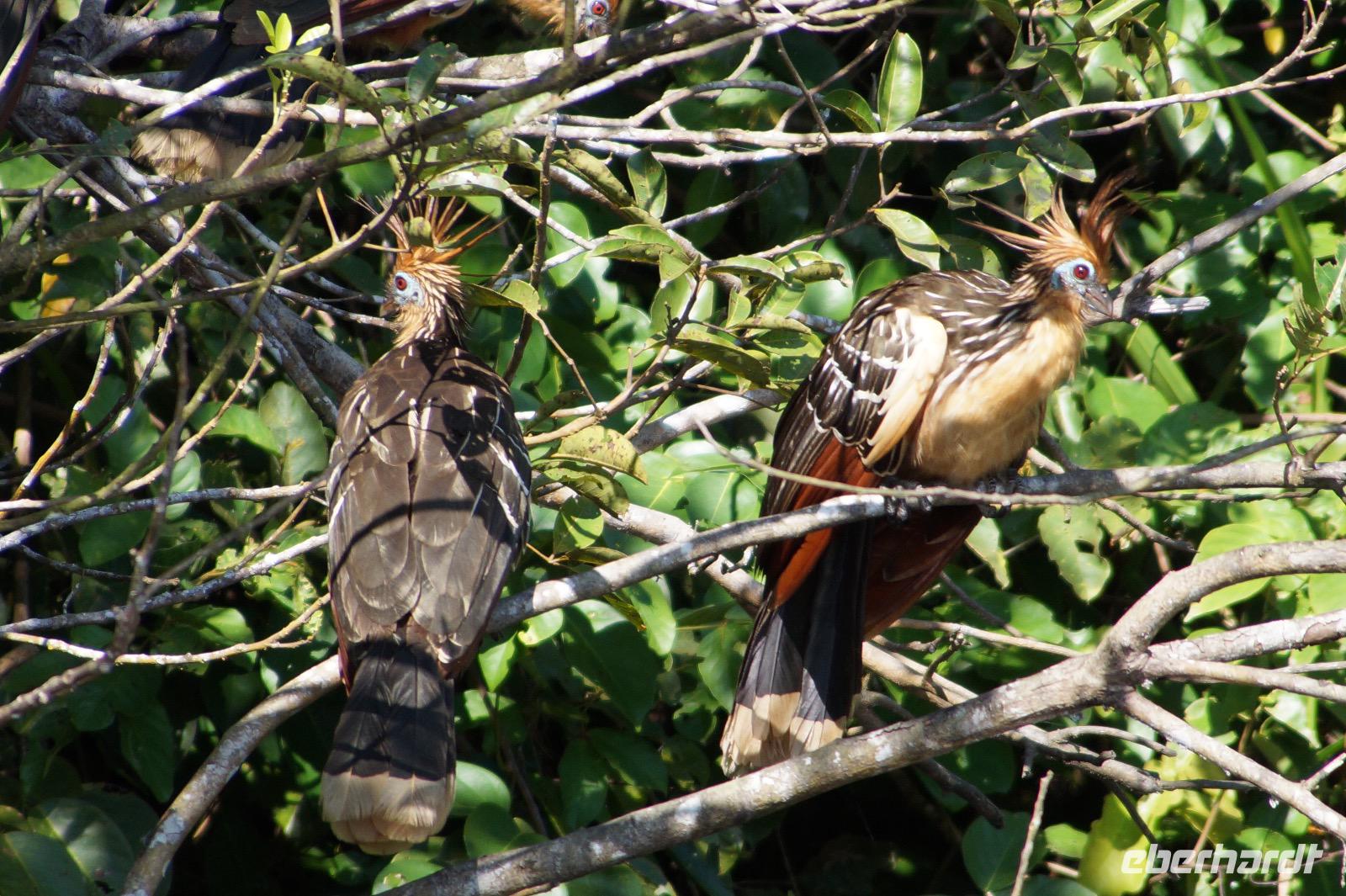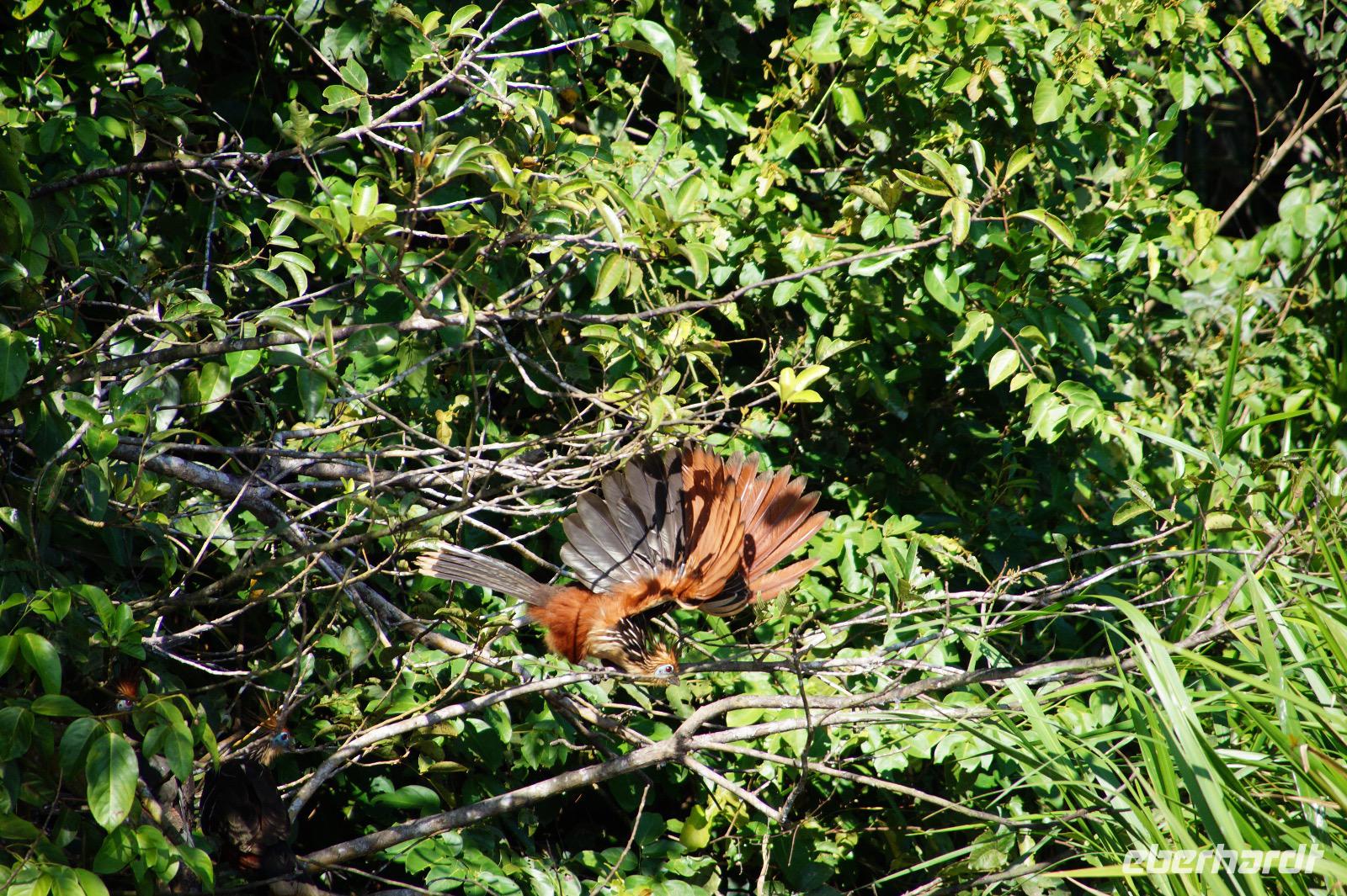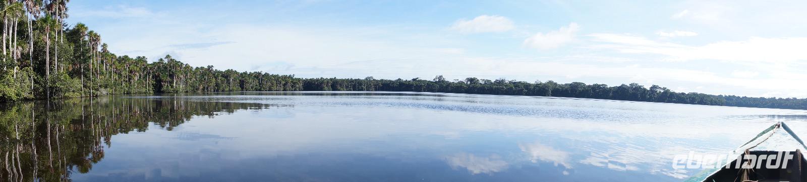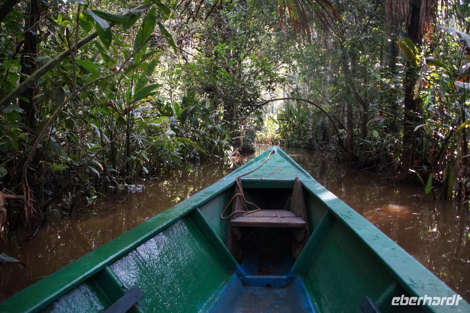 Am Nachmittag ist der Weg nicht so weit, auf der hauseigenen Lagune, bis zu einem Hochwasser 1970, dem schlimmsten Hochwasser, dass die Region je erlebt hat, noch ein Nebenarm des (Río) Madre de Dios, des Muttergottesflusses, ist seitdem von diesem abgetrennt. Wir sehen einige Vögel, u.a. den schönen Fliegenfänger und einige Hoatzins. Ein Schwarm Fledermäuse fliegt durch uns aufgeschreckt davon: Interessanterweise hintereinander her, wie eine Kindergartengruppe auf Ausflug. Mirko erklärt, dass sie immer zusammen bleiben. Bei Gefahr könnten sie sich so formieren, dass sie größer wirkten und so ihre Feinde abschrecken.