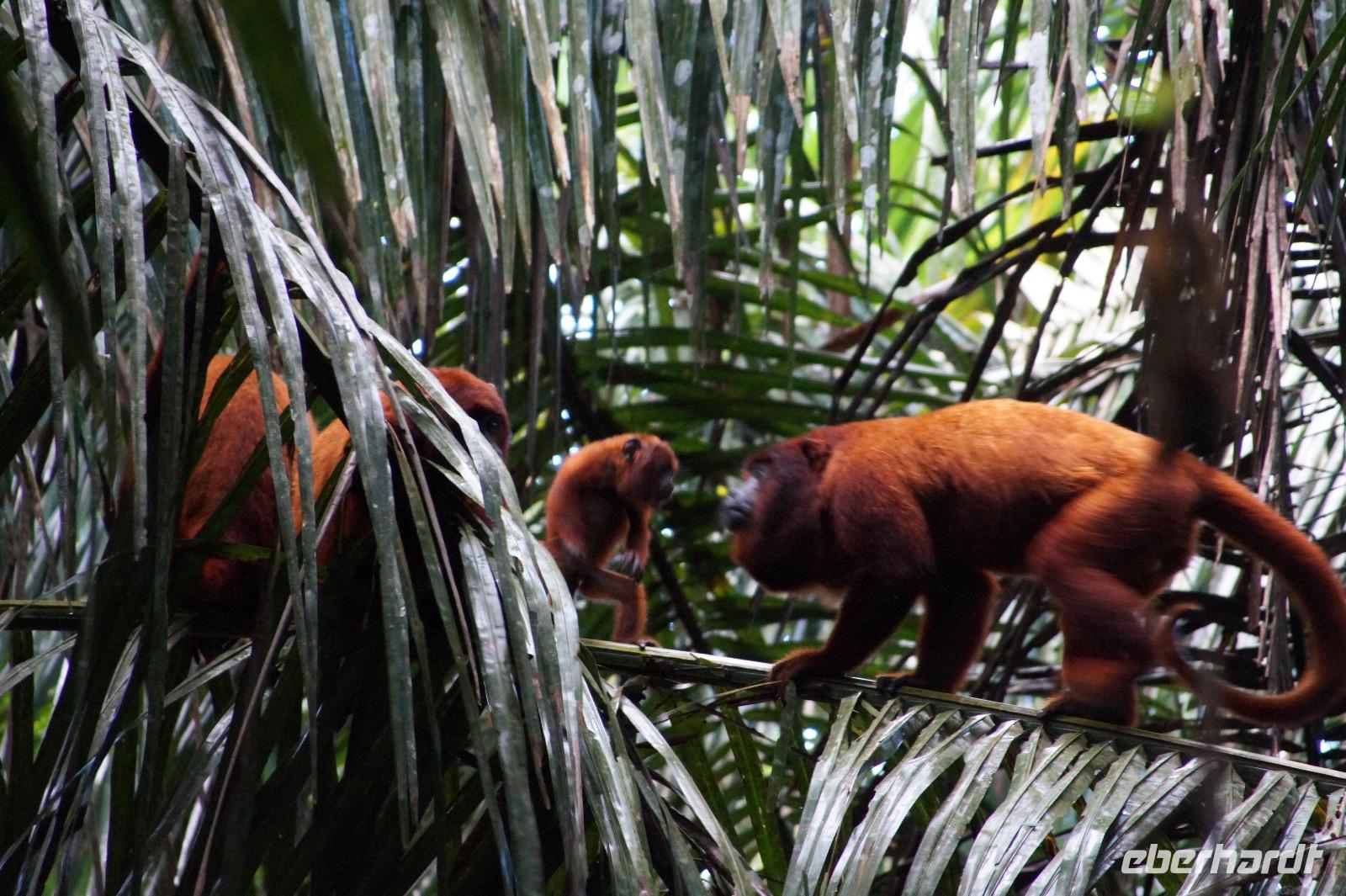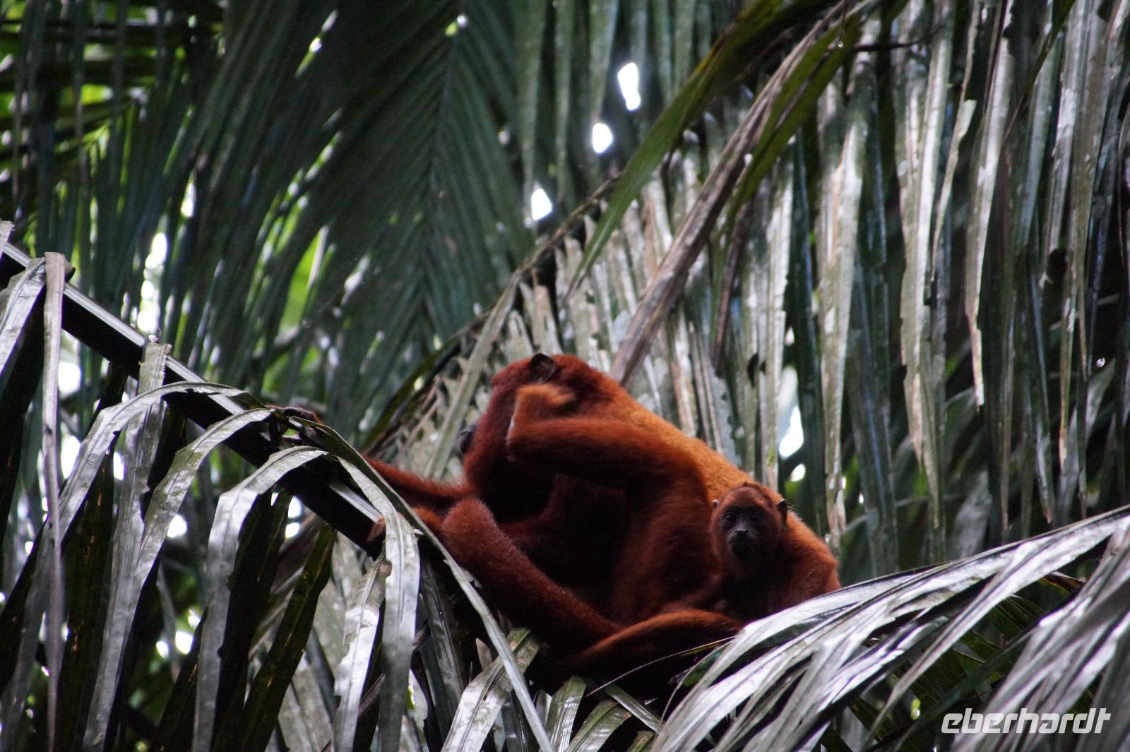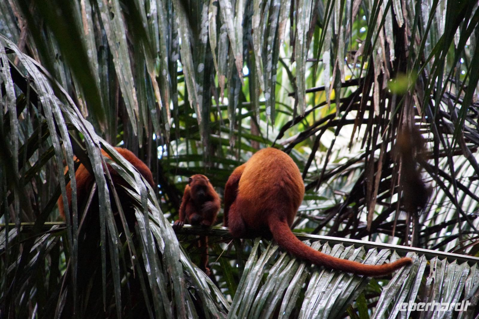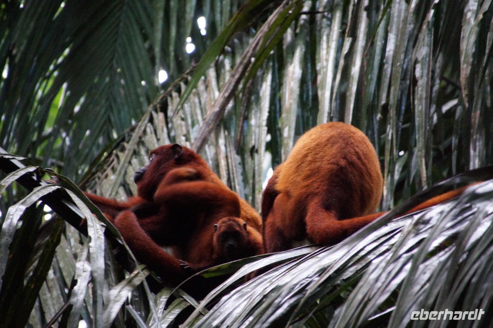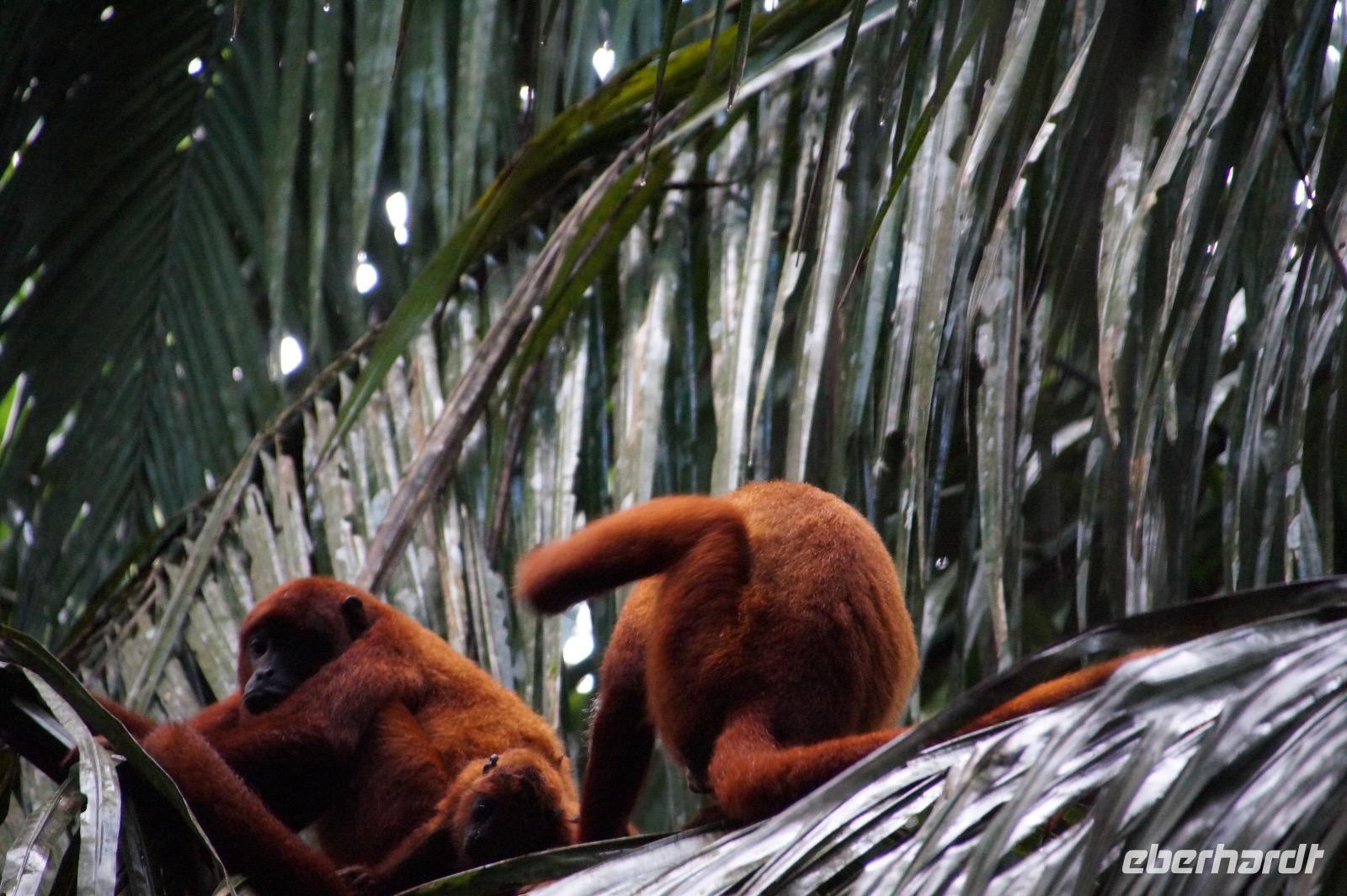 Wir bewegen uns erst einmal nur auf dem hacienda-eigenen Gelände, da gibt es bereits genug zu sehen. So ziemlich als erstes begegnet uns eine Horde roter Brüllaffen, da sind wir noch nicht einmal vom Hauptweg runter in einen der Trampelpfade abgebogen, die man nur begleitet gehen darf. Die Affen sind aber ganz friedlich und brüllen nicht. Das machen sie nur morgens, wenn man sich am liebsten die Decke über den Kopf ziehen will.