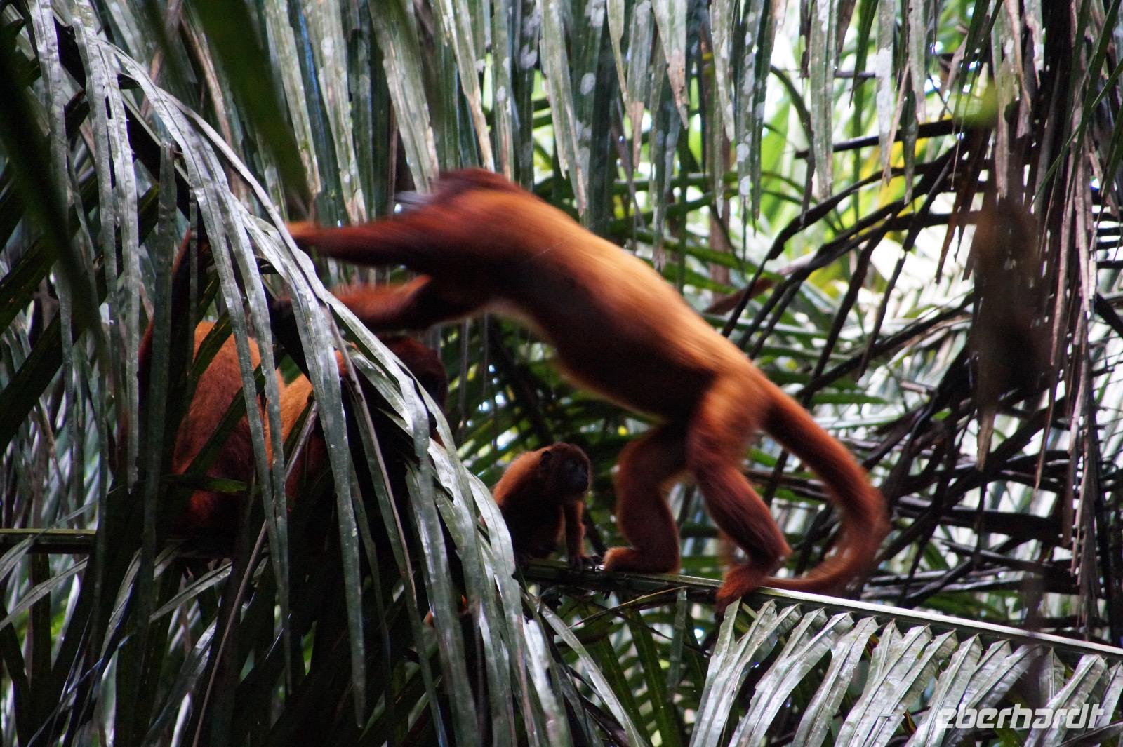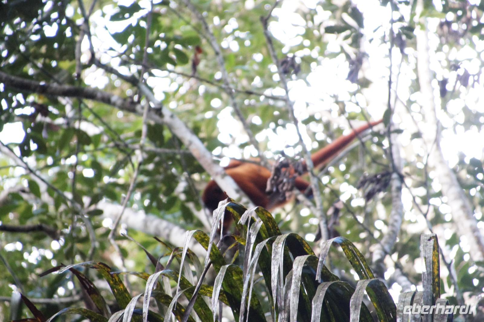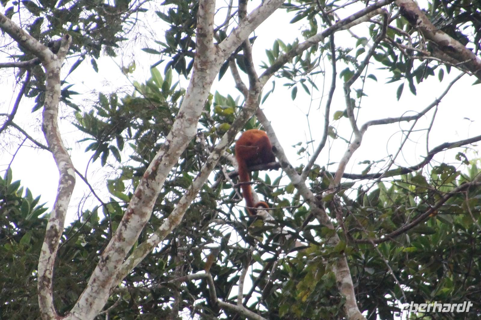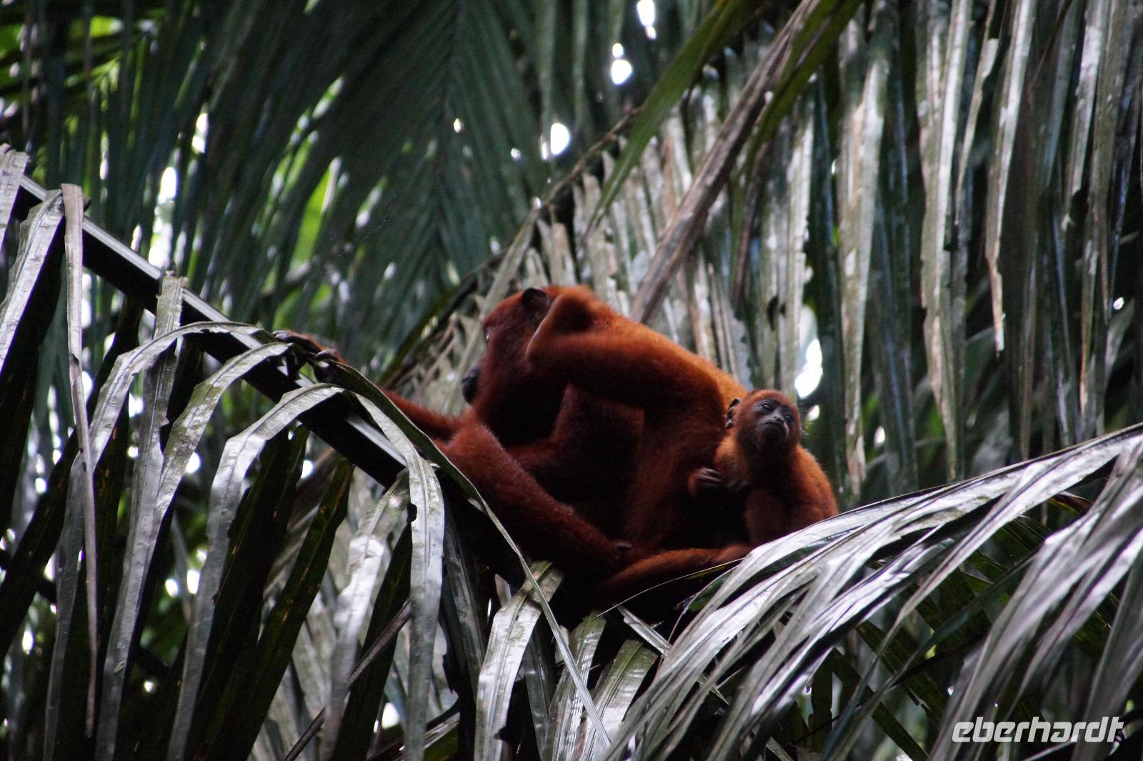 Wir bewegen uns erst einmal nur auf dem hacienda-eigenen Gelände, da gibt es bereits genug zu sehen. So ziemlich als erstes begegnet uns eine Horde roter Brüllaffen, da sind wir noch nicht einmal vom Hauptweg runter in einen der Trampelpfade abgebogen, die man nur begleitet gehen darf. Die Affen sind aber ganz friedlich und brüllen nicht. Das machen sie nur morgens, wenn man sich am liebsten die Decke über den Kopf ziehen will.