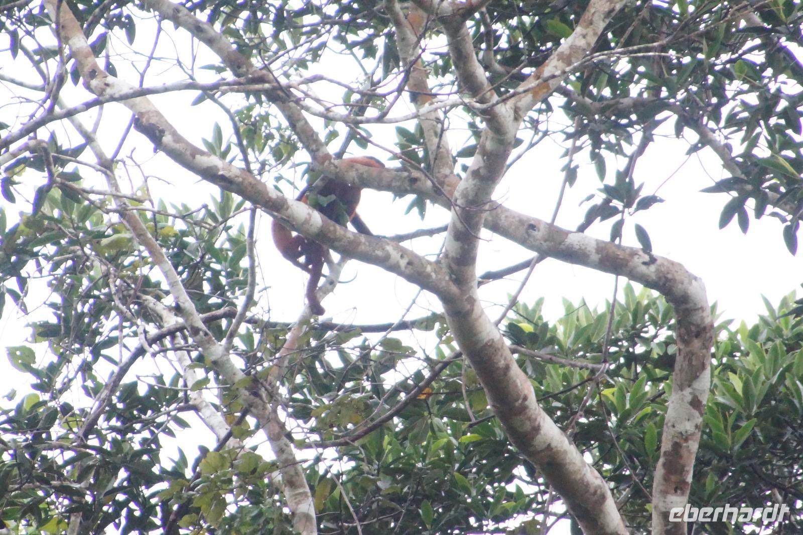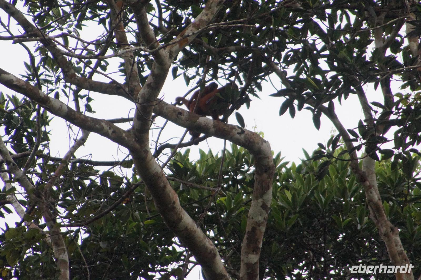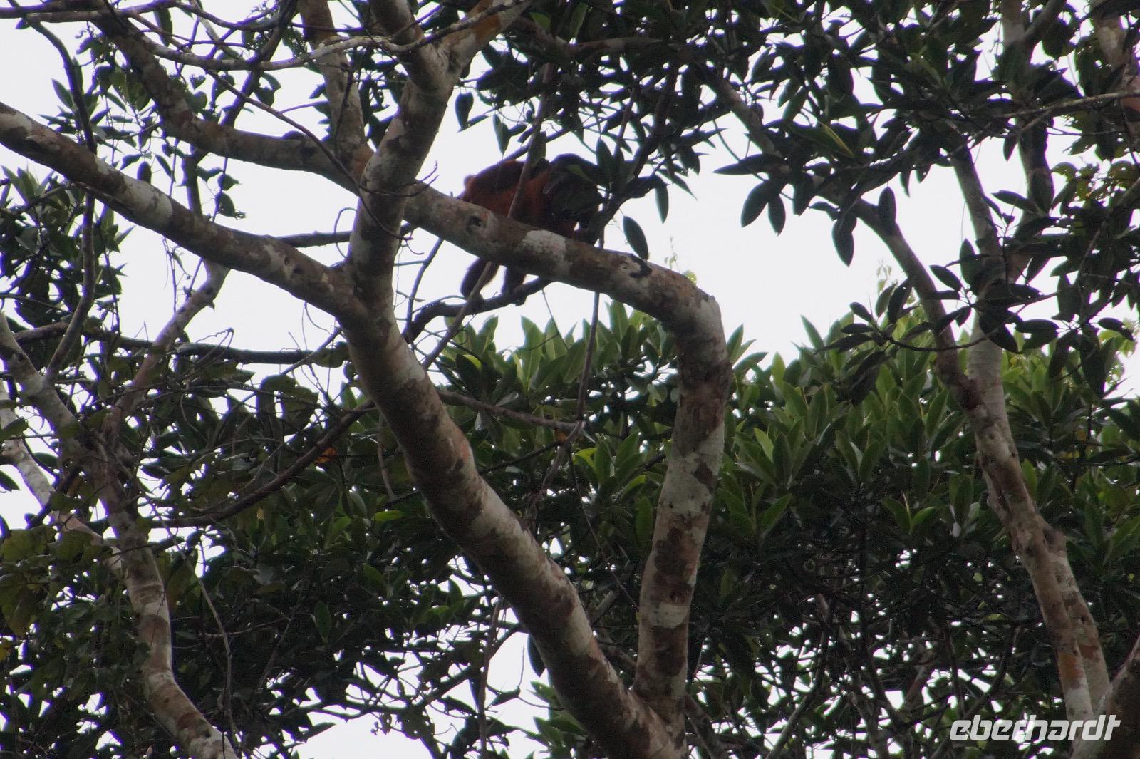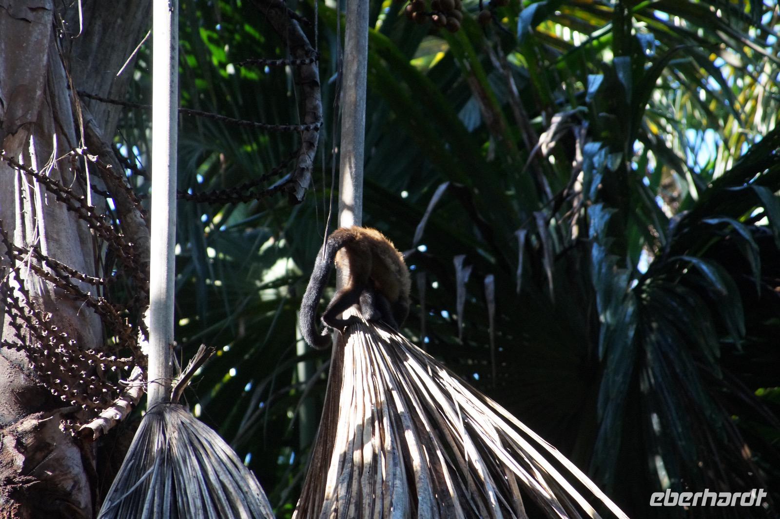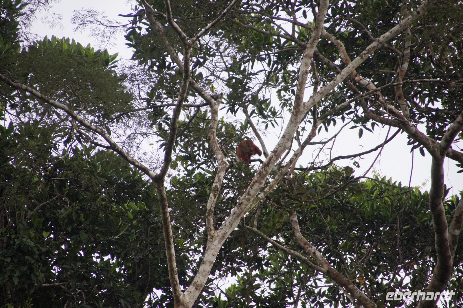 Wir bewegen uns erst einmal nur auf dem hacienda-eigenen Gelände, da gibt es bereits genug zu sehen. So ziemlich als erstes begegnet uns eine Horde roter Brüllaffen, da sind wir noch nicht einmal vom Hauptweg runter in einen der Trampelpfade abgebogen, die man nur begleitet gehen darf. Die Affen sind aber ganz friedlich und brüllen nicht. Das machen sie nur morgens, wenn man sich am liebsten die Decke über den Kopf ziehen will.