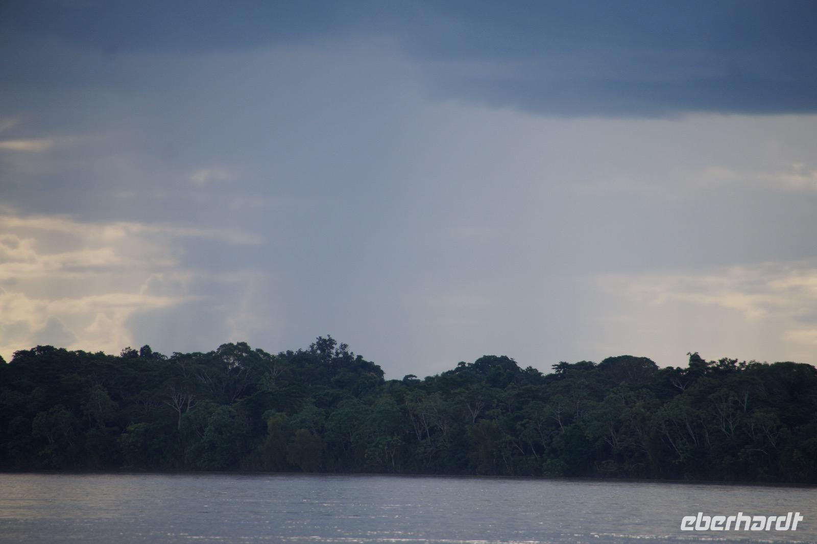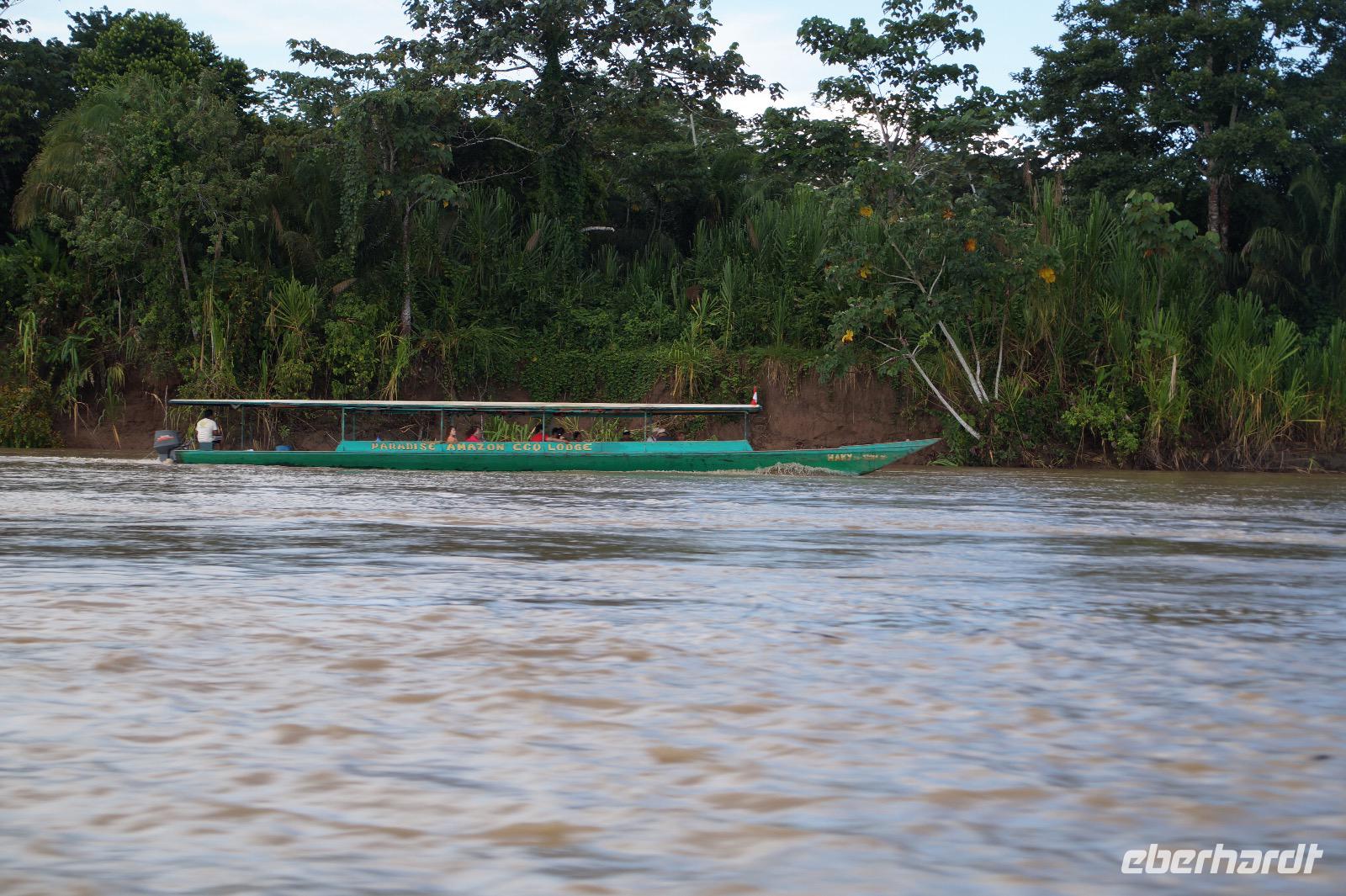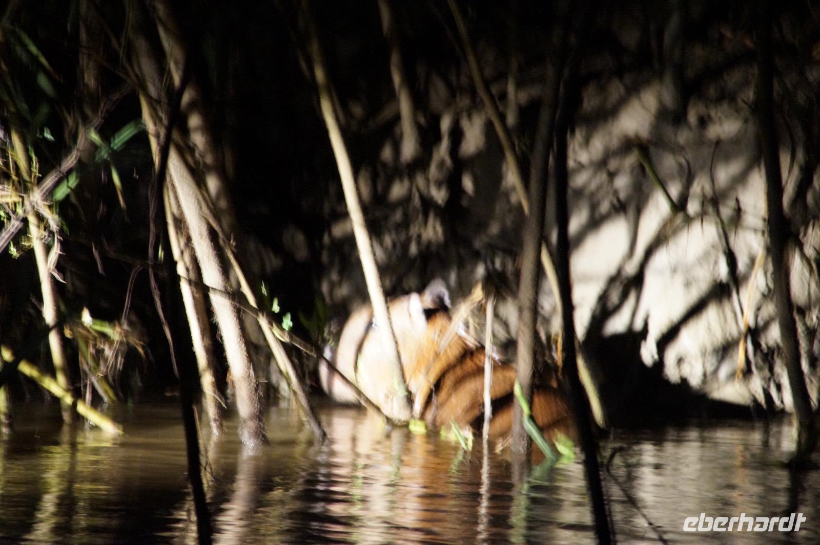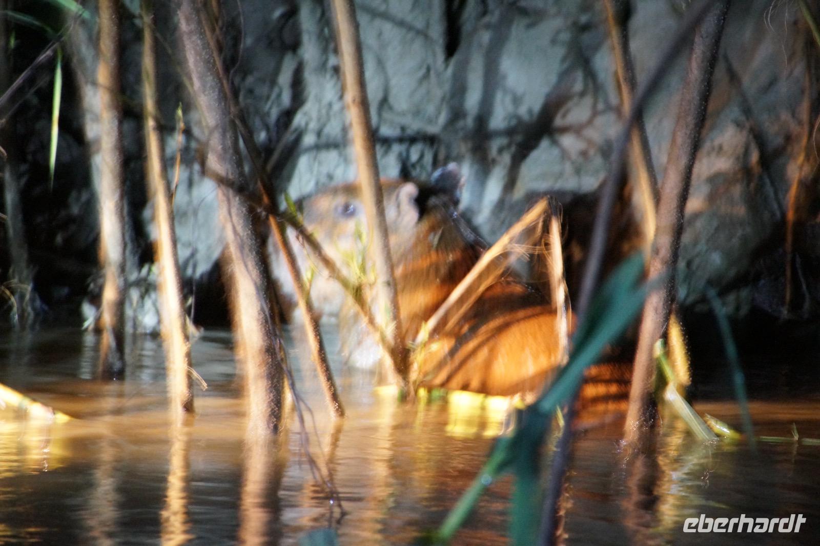 Nach Sonnenuntergang treffen wir uns wieder, um auf dem Madre de Dios nach Tieren Ausschau zu halten. Viel Glück haben wir nicht, wir sehen lediglich ein Wasserschwein und ein Flughund fliegt kurz durch den Schein von Mirkos Taschenlampe. Als dann auch noch der Motor Probleme macht - der Madre de Dios führt viel Treibholz mit sich, davon ist etwas in den Motor geraten - müssen wir am Ufer festmachen und uns abholen lassen.