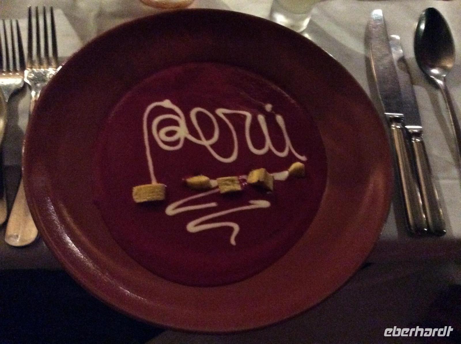 Nach einer kurzen Begrüßung werden wir mit einem Dreigängemenü verwöhnt. Zunächst mit einer vegetarischen Ceviche.