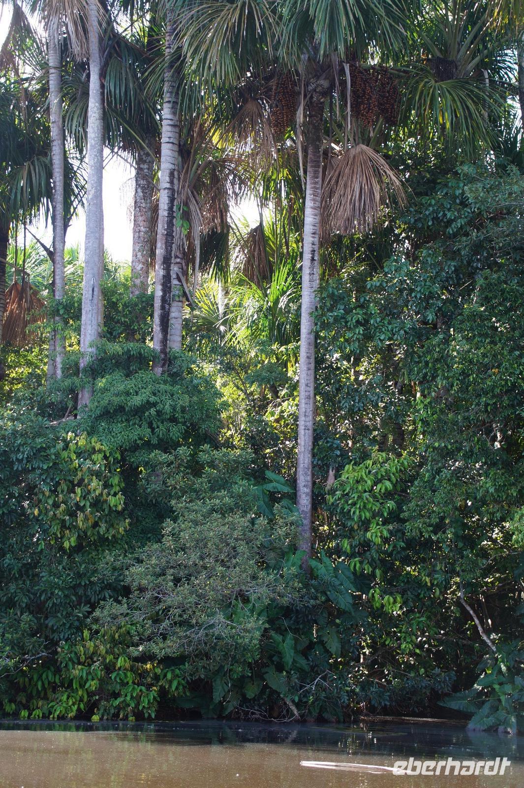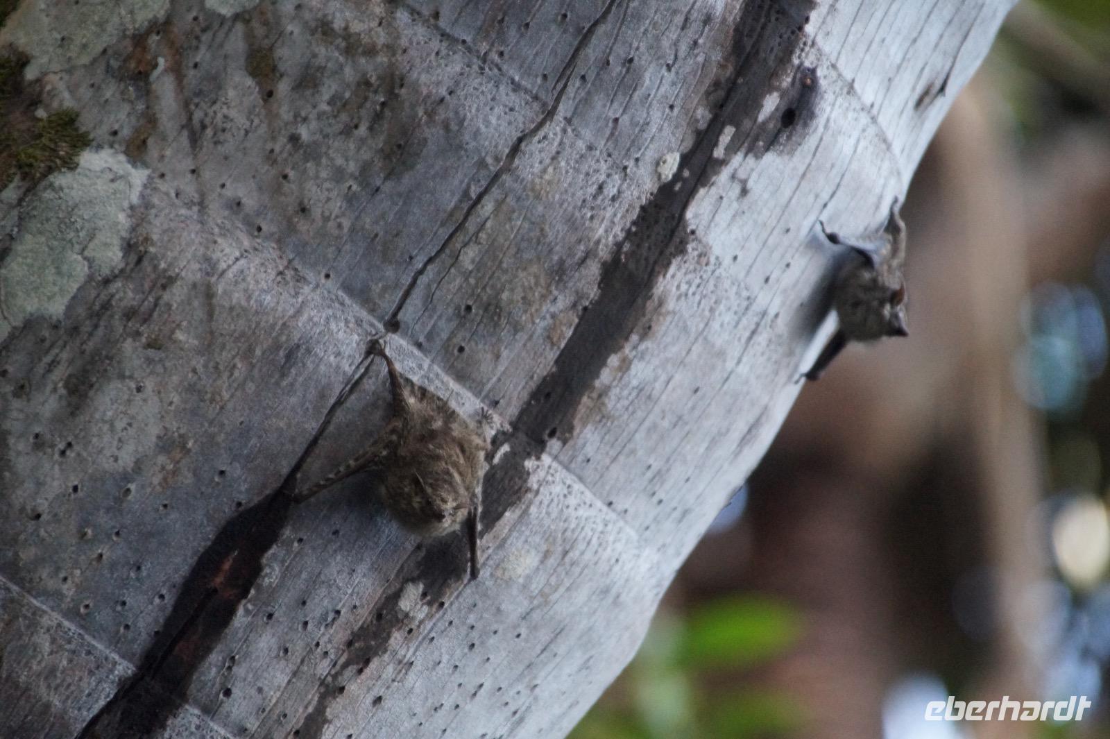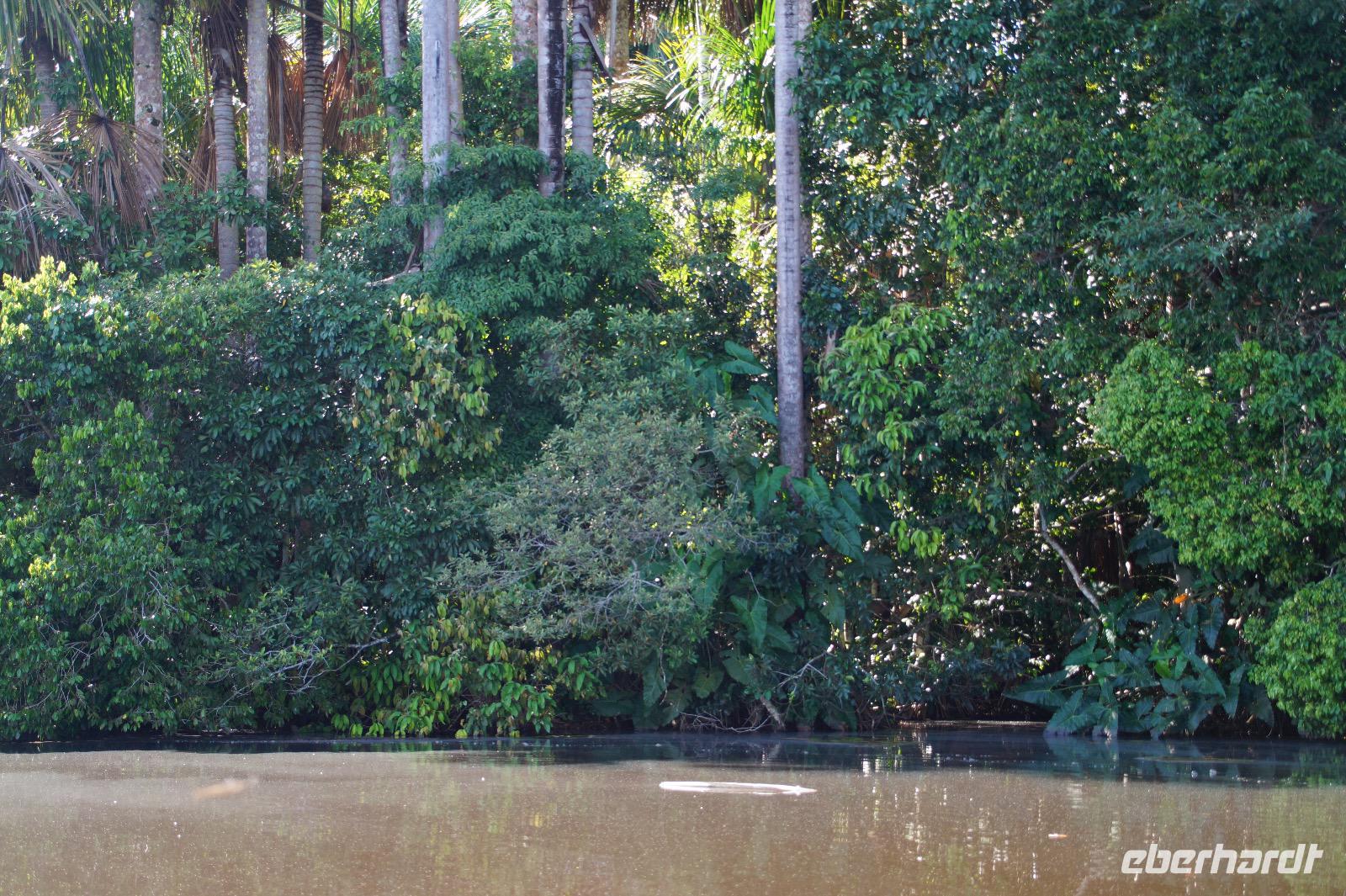 Wir machen Pause unter einem Baum, an dem sich eine Gruppe kleiner Fledermäuse festklammert. Immer dann, wenn sie beginnen zu wackeln, fällt etwas herab, mal flüssig, mal fest.Da drei Boote auf dem See unterwegs waren und es doch ziemlich laut war, hatten wir leider nicht das Glück der Vorgängergruppe und sahen leider keinen der Riesenseeotter. Von dieser vom Aussterben bedrohten Spezies - sie wurden früher wegen ihres Fells bejagt - gibt es nämlich einige am Lago Sandoval, ihretwegen ist er zur besonderen Schutzzone erklärt worden.