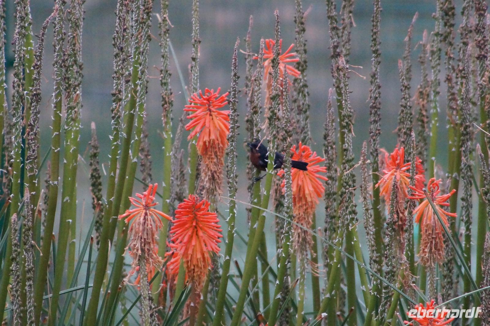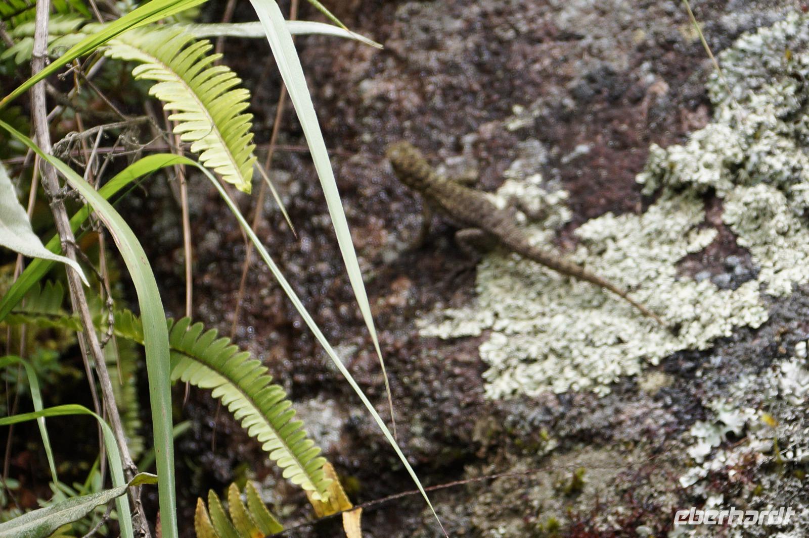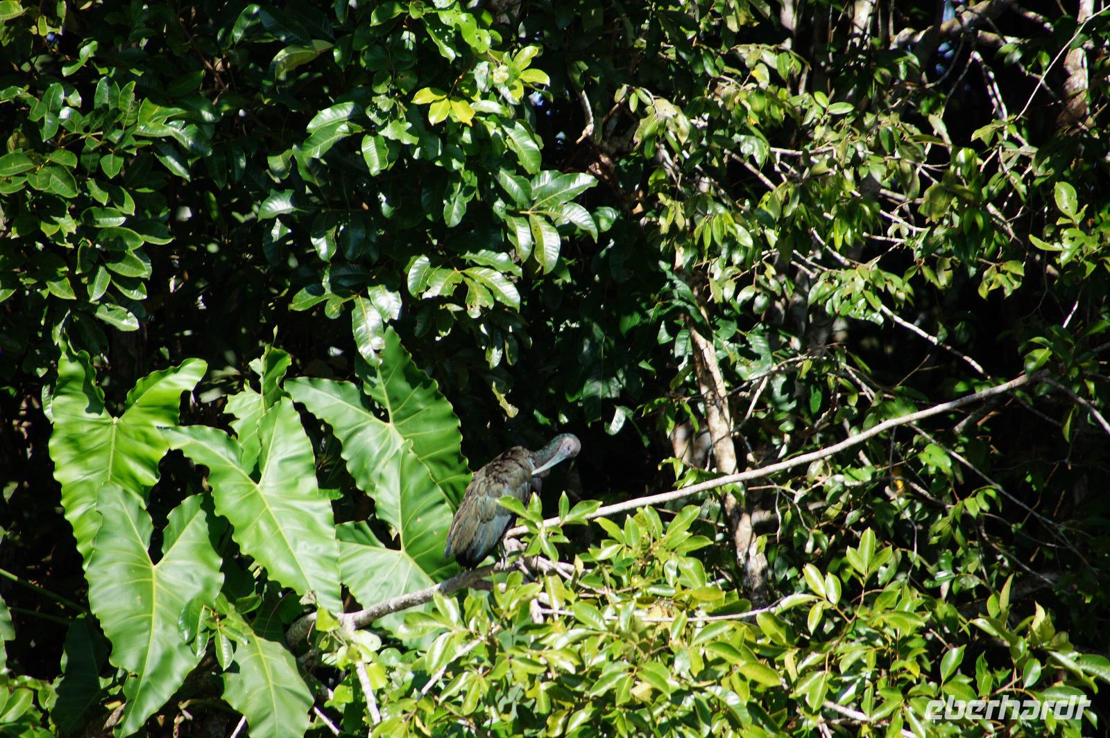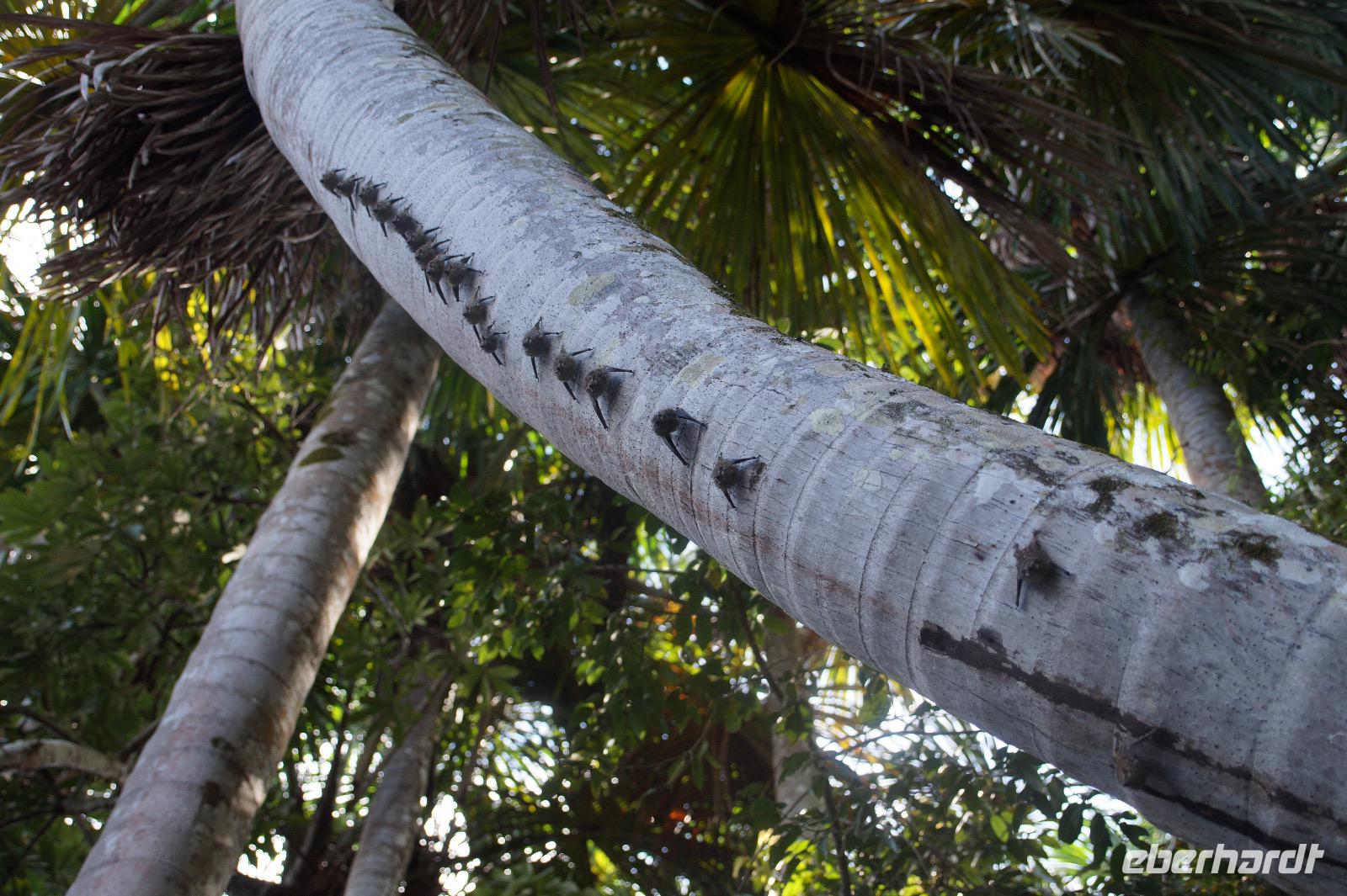 Wir machen Pause unter einem Baum, an dem sich eine Gruppe kleiner Fledermäuse festklammert. Immer dann, wenn sie beginnen zu wackeln, fällt etwas herab, mal flüssig, mal fest.Da drei Boote auf dem See unterwegs waren und es doch ziemlich laut war, hatten wir leider nicht das Glück der Vorgängergruppe und sahen leider keinen der Riesenseeotter. Von dieser vom Aussterben bedrohten Spezies - sie wurden früher wegen ihres Fells bejagt - gibt es nämlich einige am Lago Sandoval, ihretwegen ist er zur besonderen Schutzzone erklärt worden.