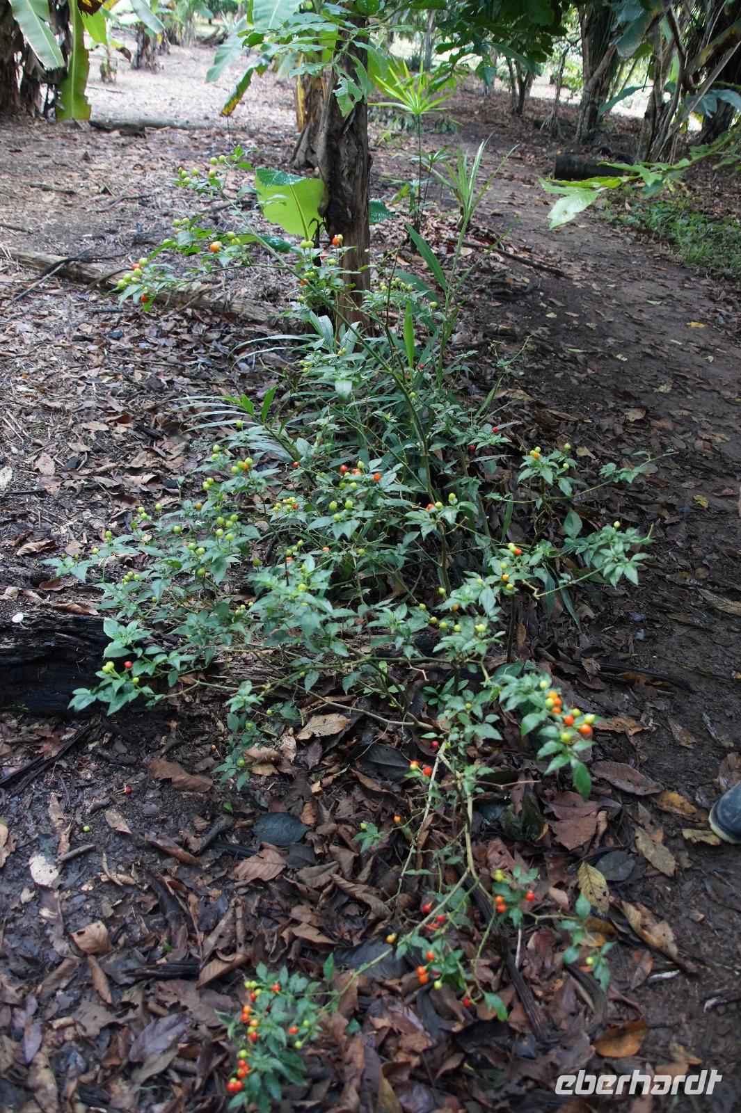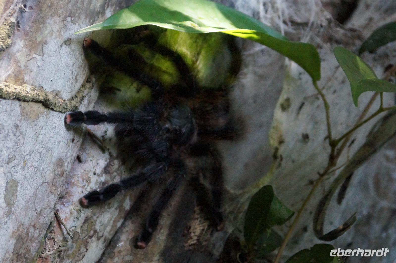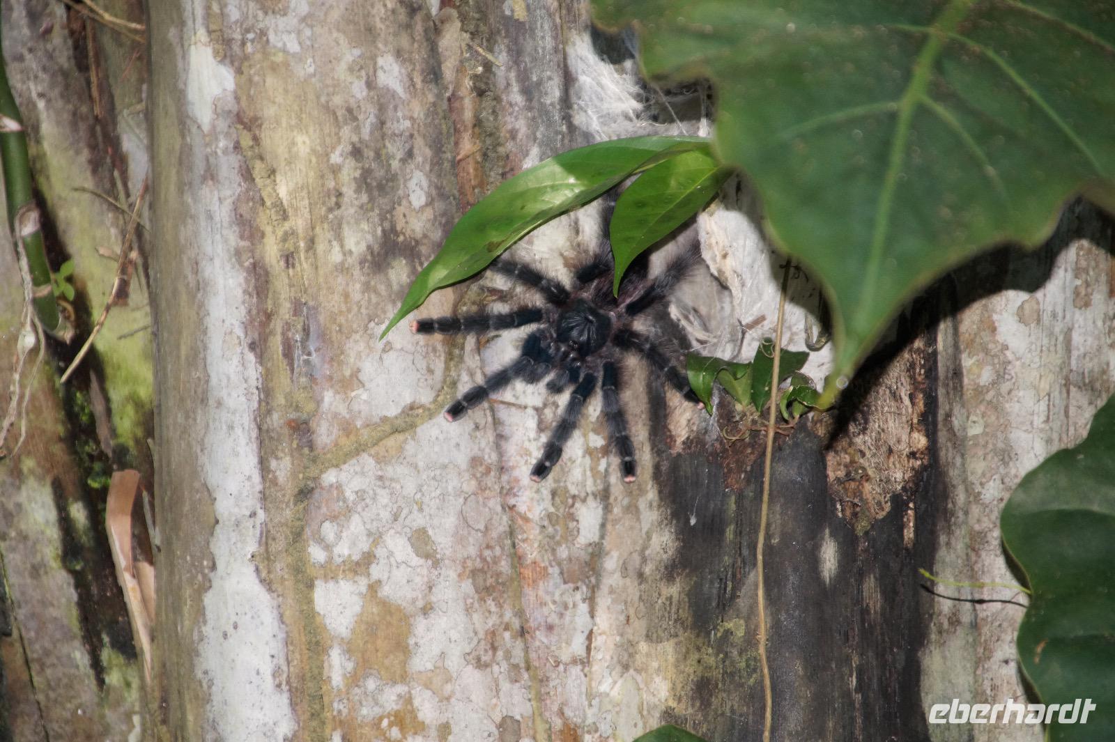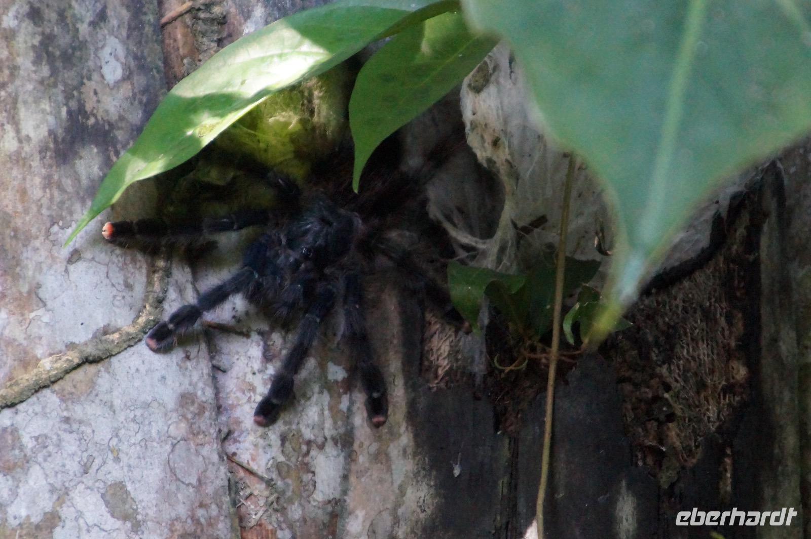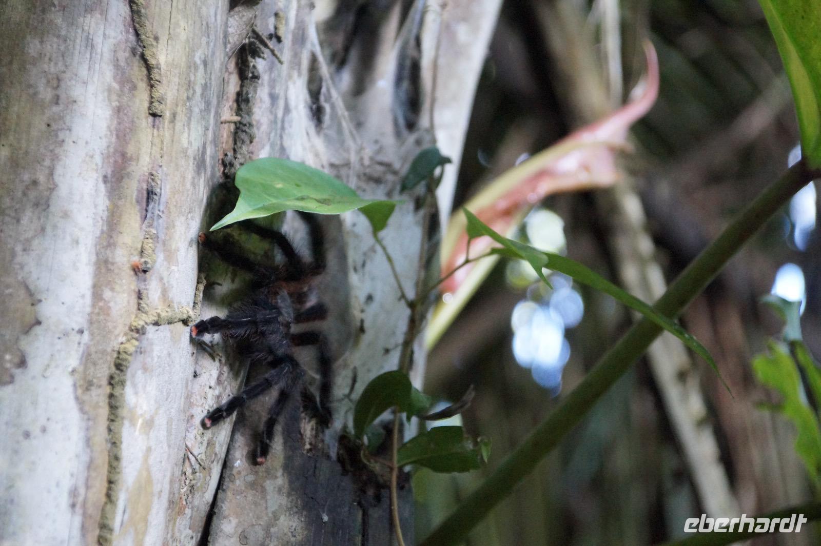 Unser heutiges Ziel ist eine Chacra, so heißen im peruanischen Regenwald die Pflanzungen. Die Chacra, die wir heute aufsuchen, widmet sich dem Anbau der Banane. Aber die Familie baut nicht nur für den Verkauf, sondern auch für den Eigenbedarf an. So finden wir die Sternfrucht, verschiedene Zitrusbäume, Ananas, Kakao etc., und eine Pflanze, welche die Peruaner als castaña (Kastanie) bezeichnen, wohingegen sie anderswo als Brazil Nut (Brasilnuss) bekannt ist. Uns Deutschen ist sie als Paranuss geläufig. Unterwegs begegnet uns noch eine rosafüßige Tarantel. Um sich zu verteidigen, werfe sie ihre Haare ab, die sehr jucken würden. Die Tarantelhaare in der Kleidung würde man auch durch Waschen nicht mehr los.