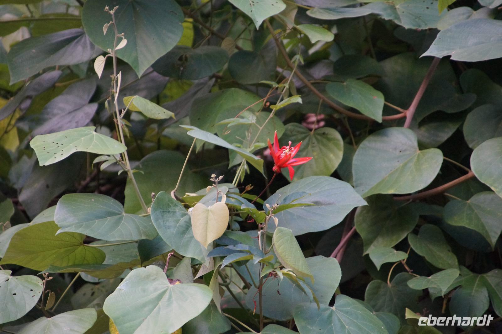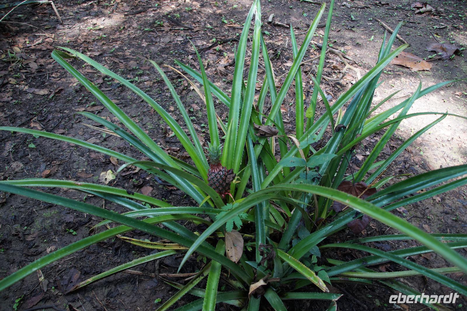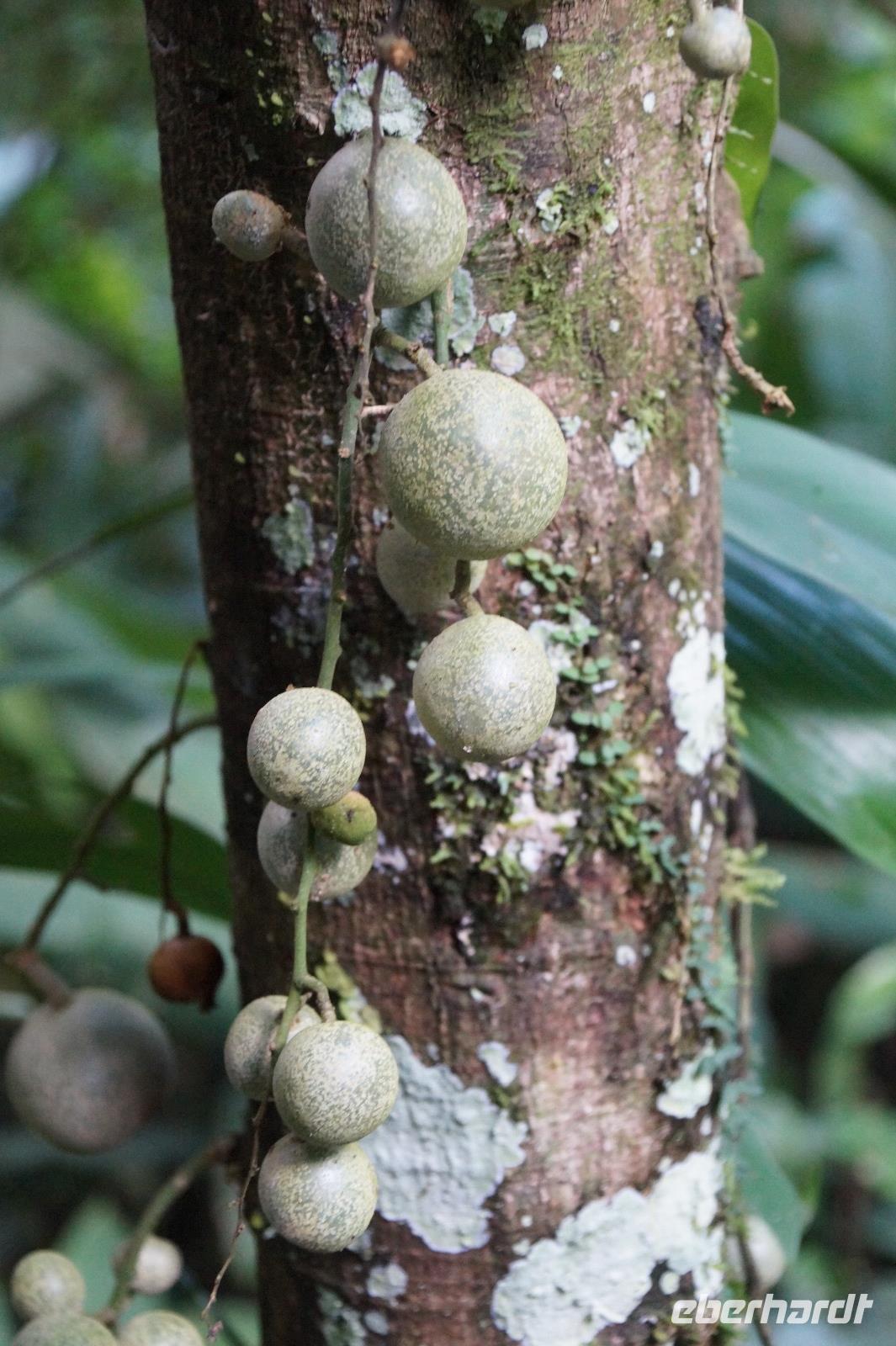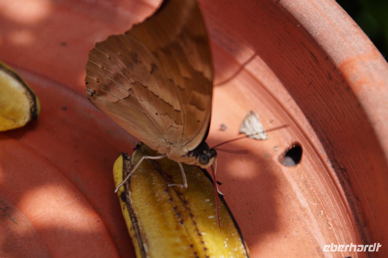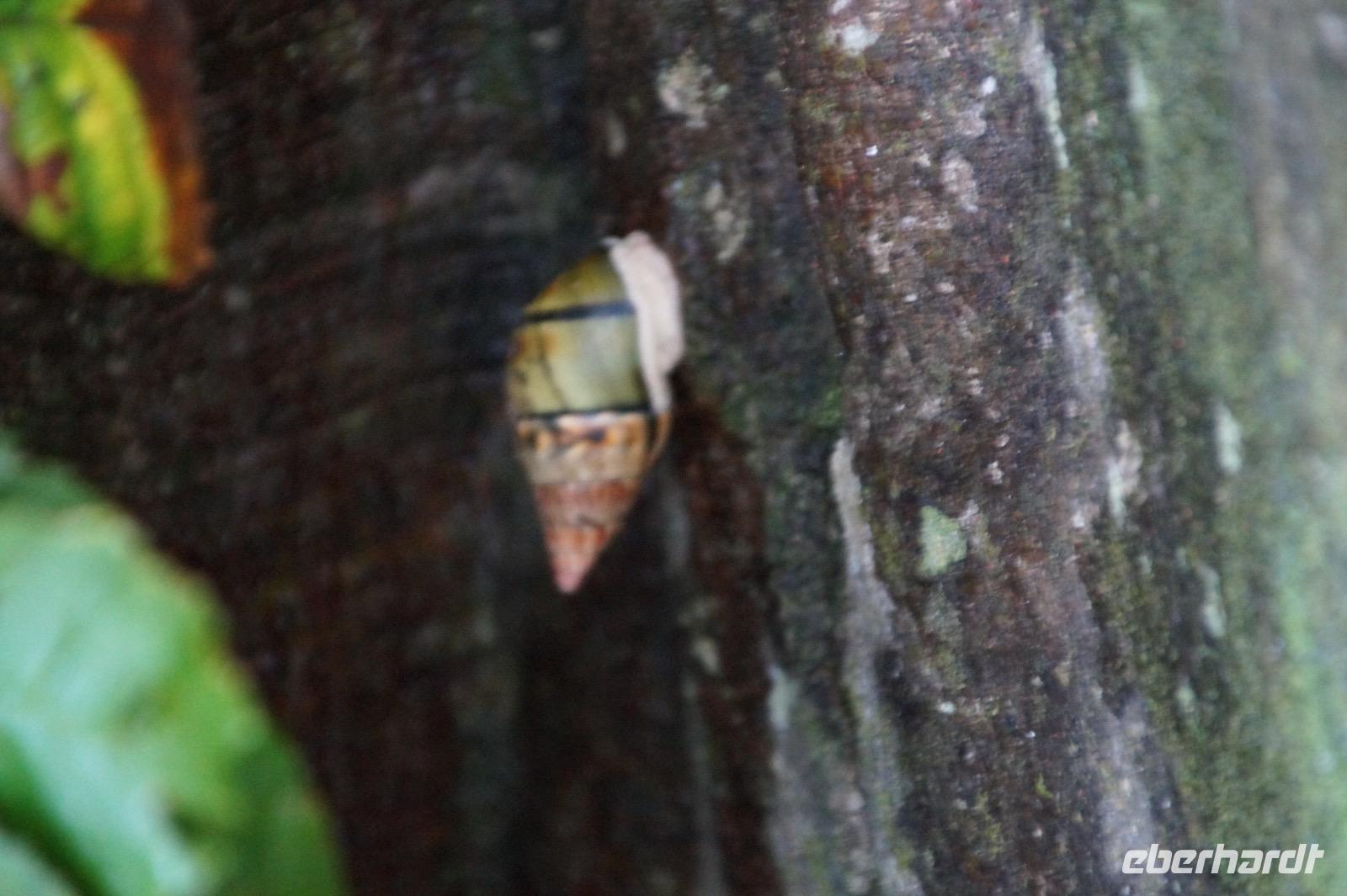 Unser heutiges Ziel ist eine Chacra, so heißen im peruanischen Regenwald die Pflanzungen. Die Chacra, die wir heute aufsuchen, widmet sich dem Anbau der Banane. Aber die Familie baut nicht nur für den Verkauf, sondern auch für den Eigenbedarf an. So finden wir die Sternfrucht, verschiedene Zitrusbäume, Ananas, Kakao etc., und eine Pflanze, welche die Peruaner als castaña (Kastanie) bezeichnen, wohingegen sie anderswo als Brazil Nut (Brasilnuss) bekannt ist. Uns Deutschen ist sie als Paranuss geläufig. Unterwegs begegnet uns noch eine rosafüßige Tarantel. Um sich zu verteidigen, werfe sie ihre Haare ab, die sehr jucken würden. Die Tarantelhaare in der Kleidung würde man auch durch Waschen nicht mehr los.