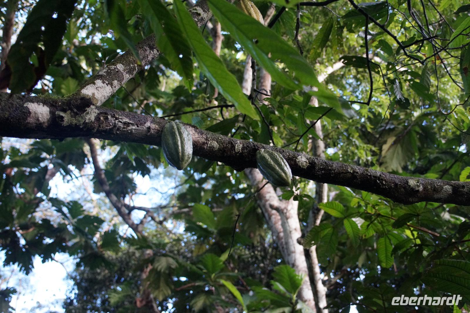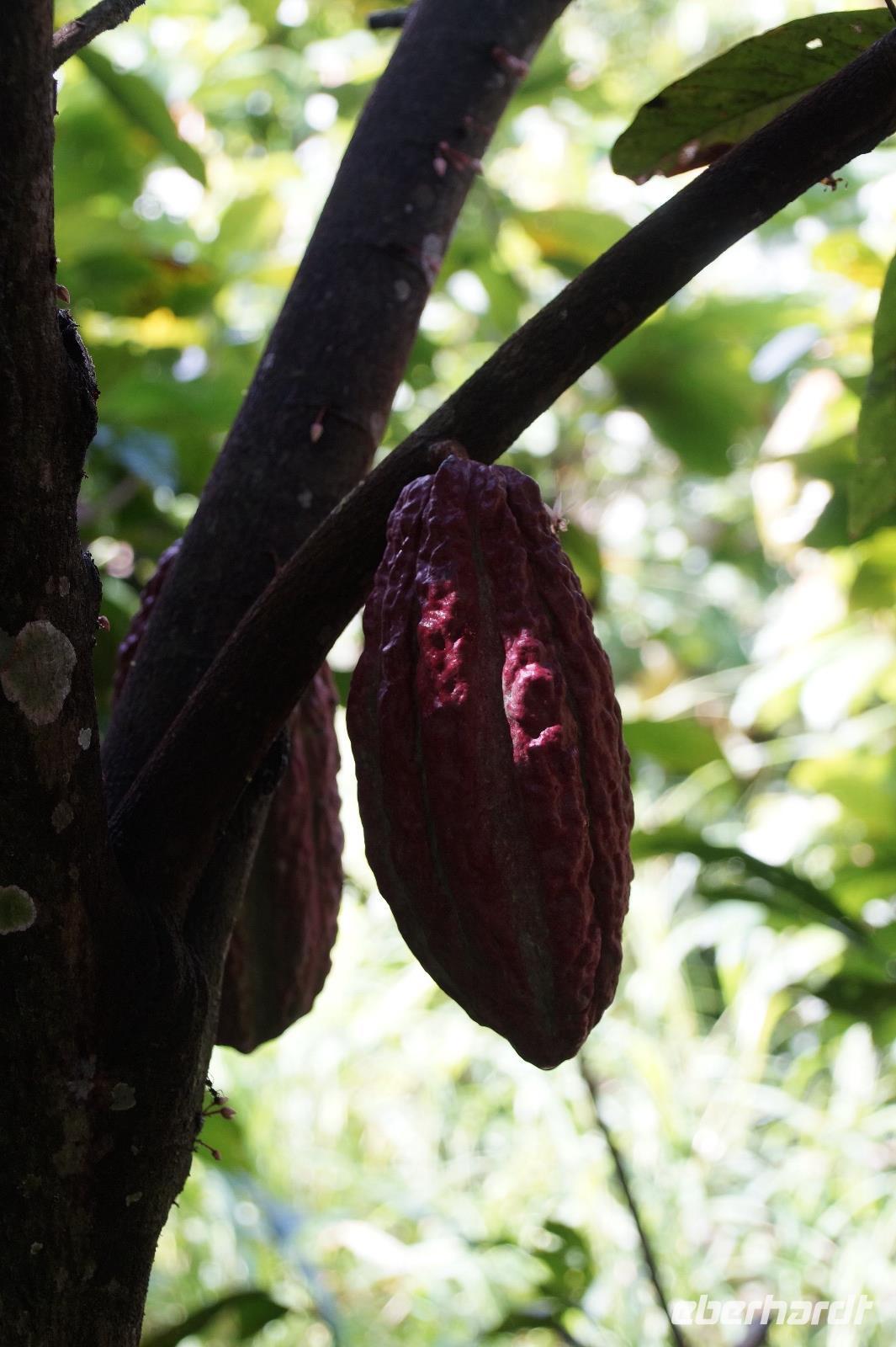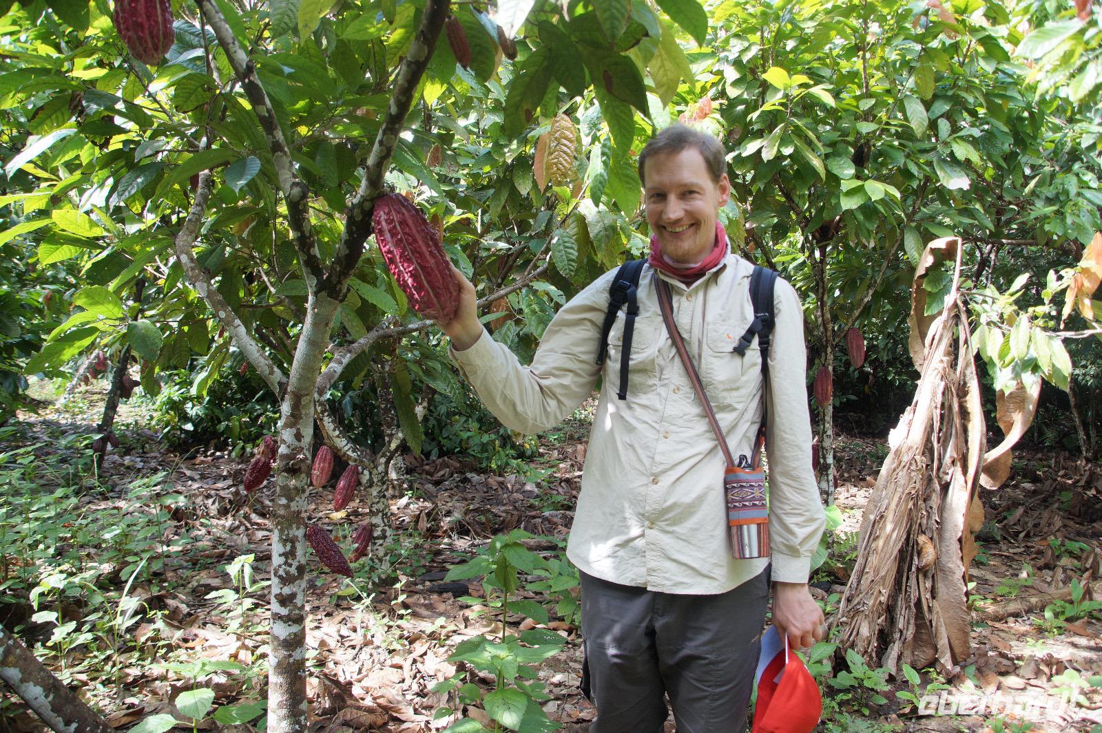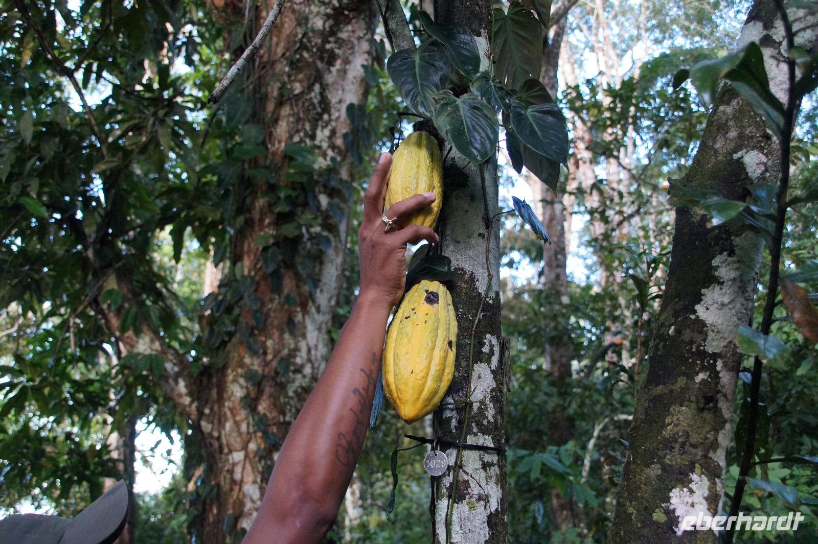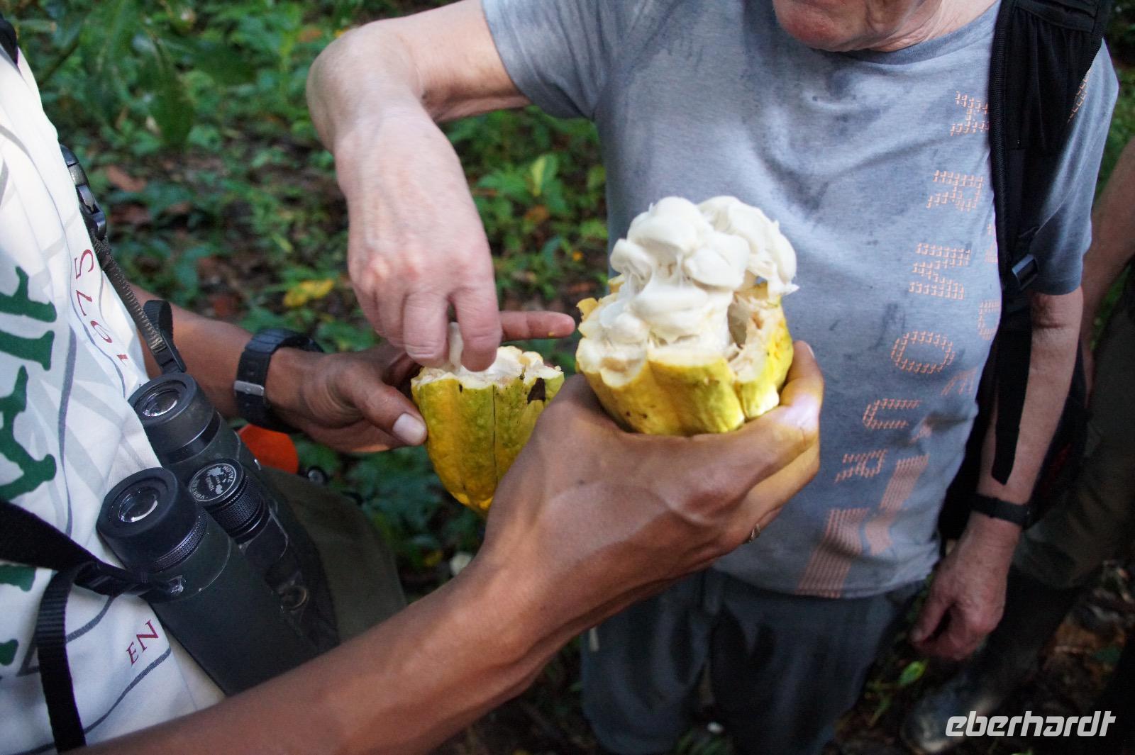 Mirko schlägt uns auch eine Kakaobohne auf, die sich aber als wurmverseucht herausstellt. Eine zweite Kakaobohne ist besser. Wir lutschen die helle Masse von den Kernen, die ein wenig wie Mango oder Zitrone schmeckt. Mirko sagt uns ausdrücklich, dass wir die Kerne nicht zerbeißen sollen, denn bevor der Kakao seinen schokoladigen Geschmack bekommt, muss er einem Fermentationsprozess unterworfen werden.