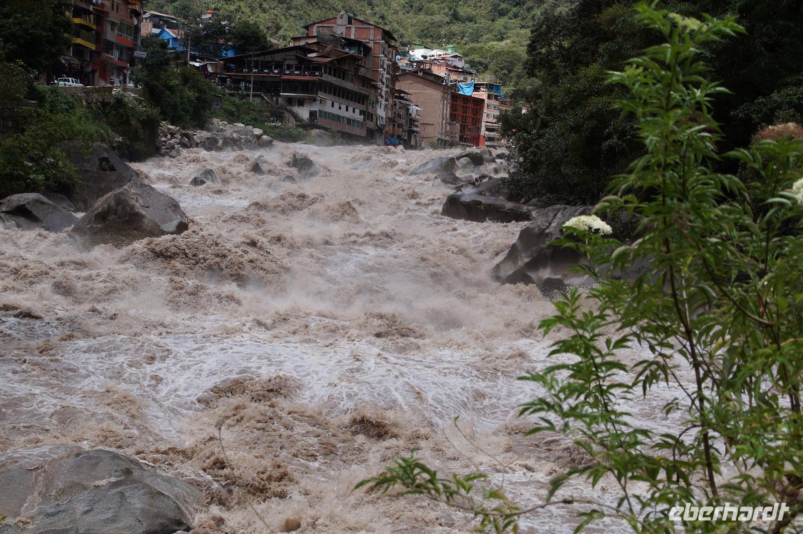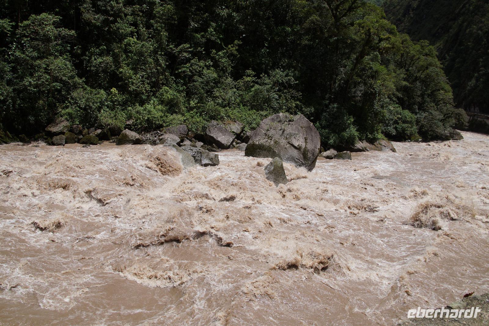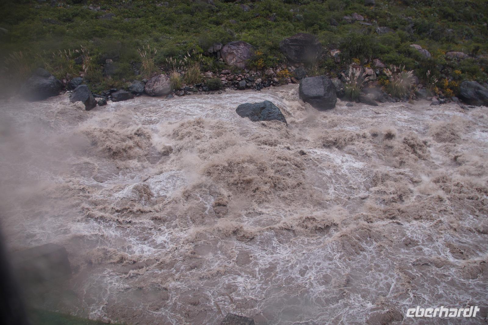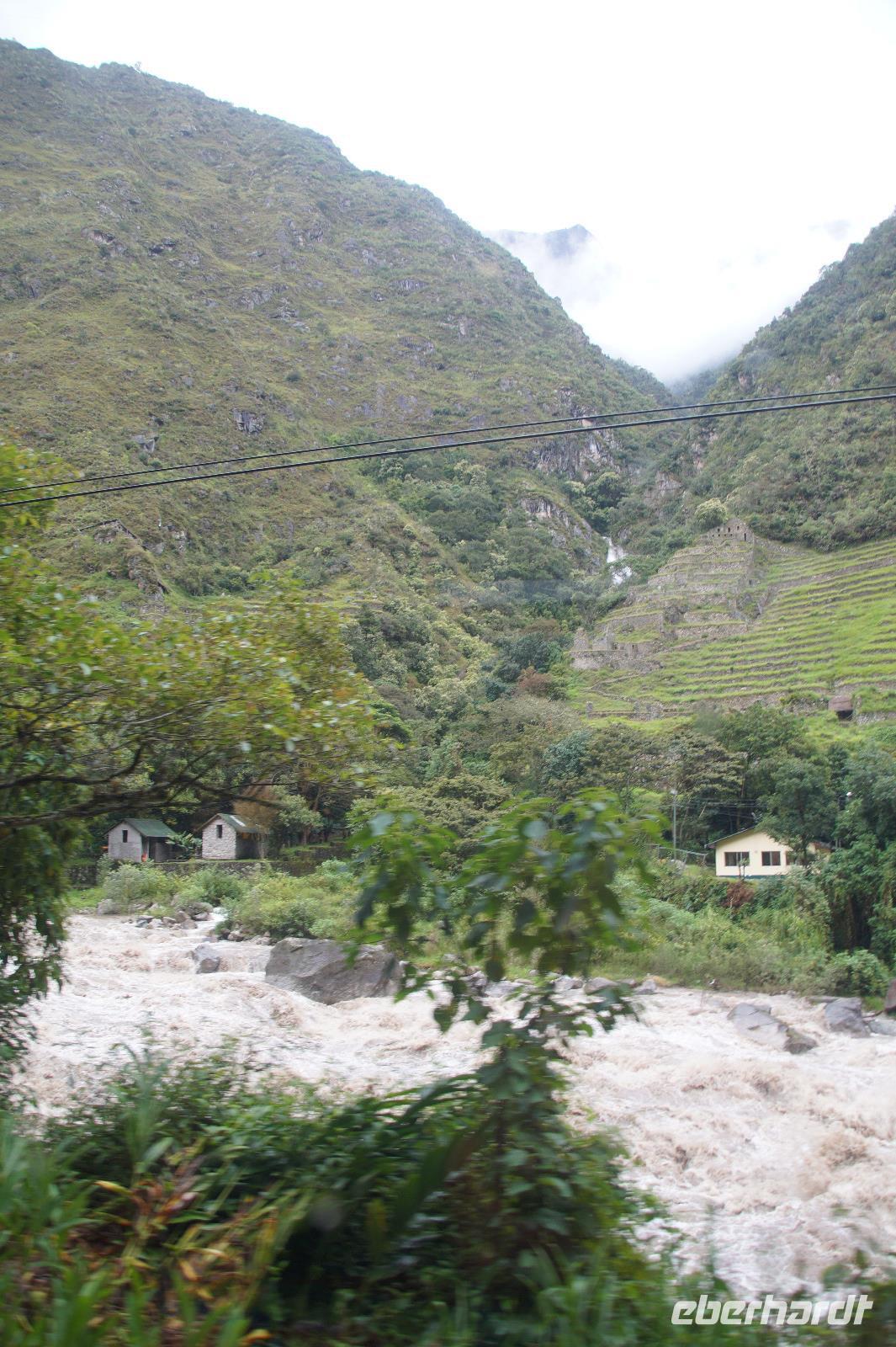 Im Anschluss sehen wir das Handwerkerviertel, dann gehen wir durch die "Kühlschränke", Lagerhäuser, die am Berghang gebaut sind und in denen es kühler als außen ist, Richtung Ausgang. Mijaíl bringt uns noch in unser Hotel unten am rauschenden Urubamba-Fluss der hier wirklich mit Macht durch das enge Tal drängt, er kocht geradezu, bevor sie mit dem Zug zurück nach Ollantaytambo fährt.