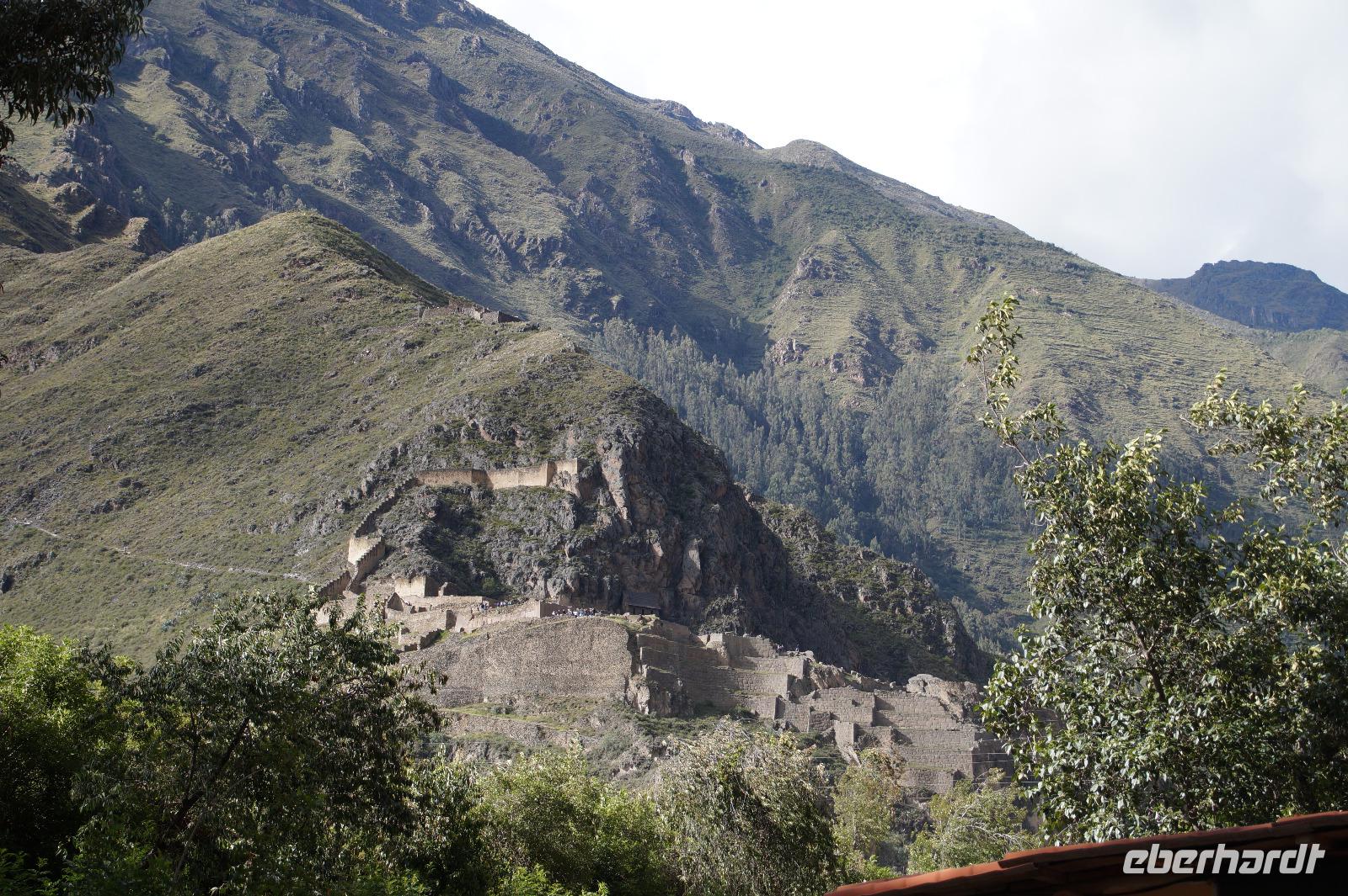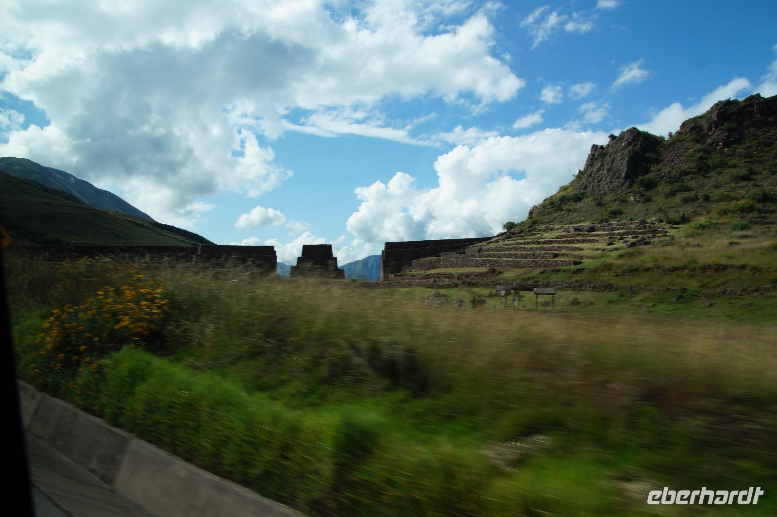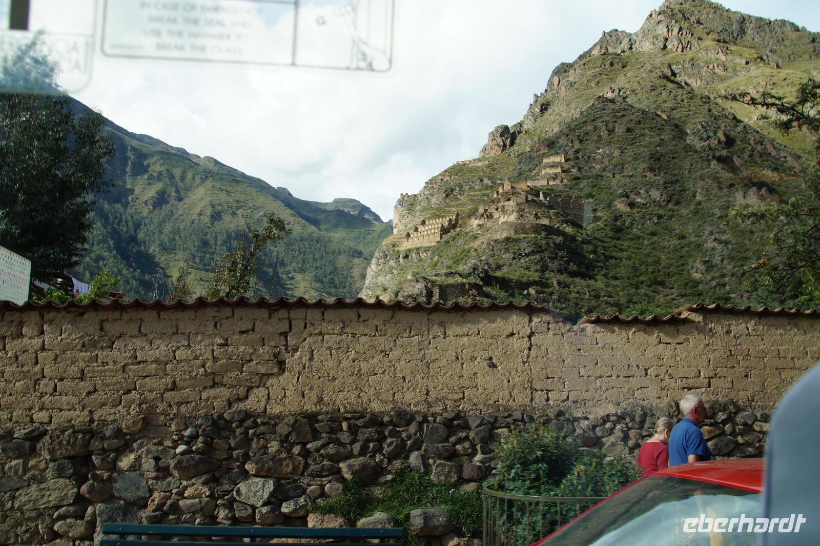 Corinna und ich haben noch nicht genug von Steinen und wandern dem Bus voraus die Sraße hoch (etwa 700 m), um wenigstens von außen die Inkafestung Ollantaytambo zu fotografieren. Wir müssen sogar noch ein Minütchen auf den Bus warten.