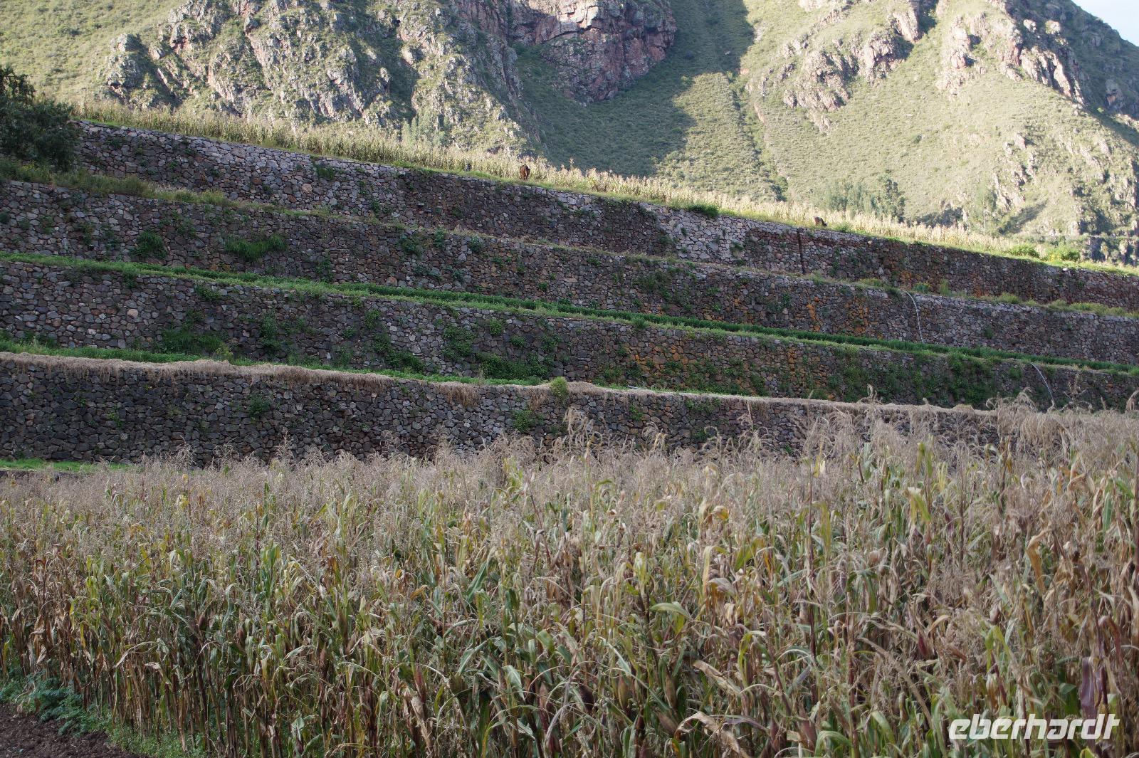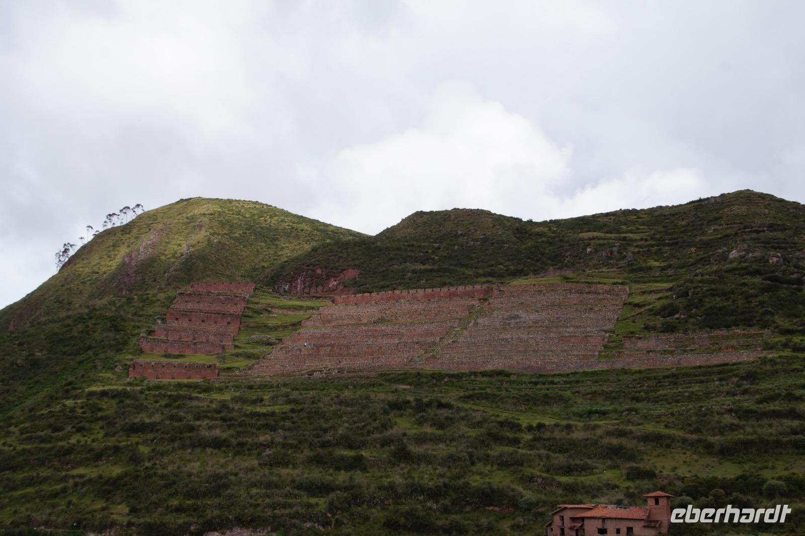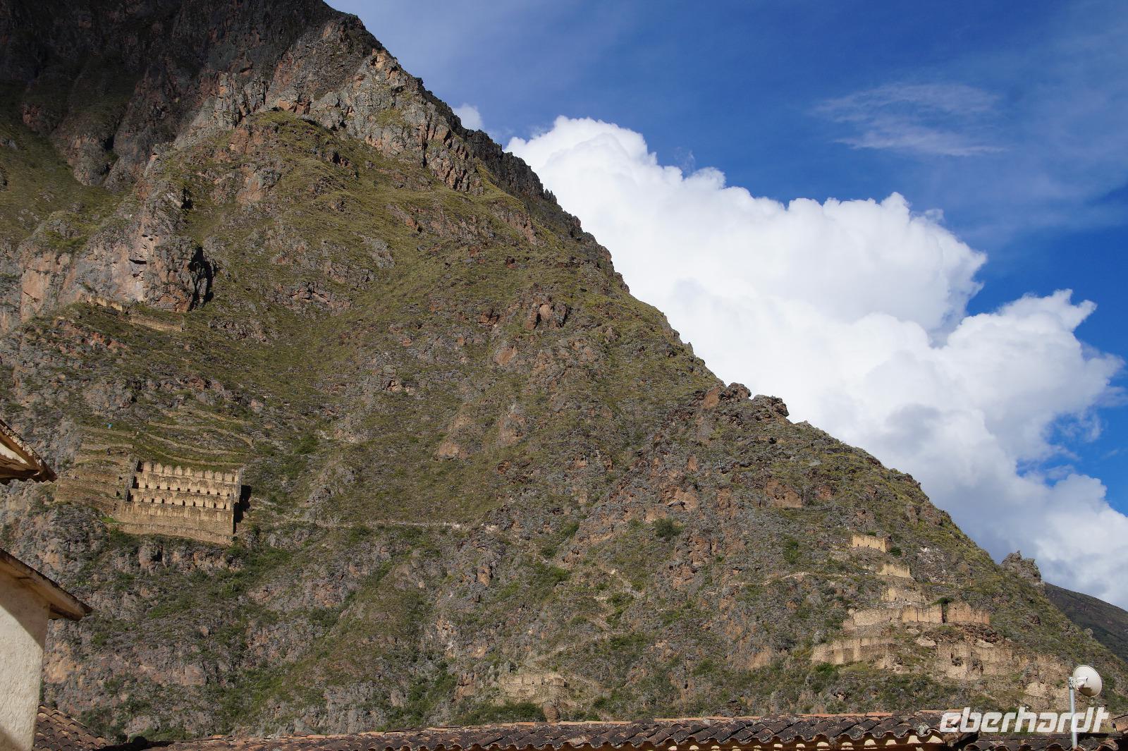 Corinna und ich haben noch nicht genug von Steinen und wandern dem Bus voraus die Sraße hoch (etwa 700 m), um wenigstens von außen die Inkafestung Ollantaytambo zu fotografieren. Wir müssen sogar noch ein Minütchen auf den Bus warten.