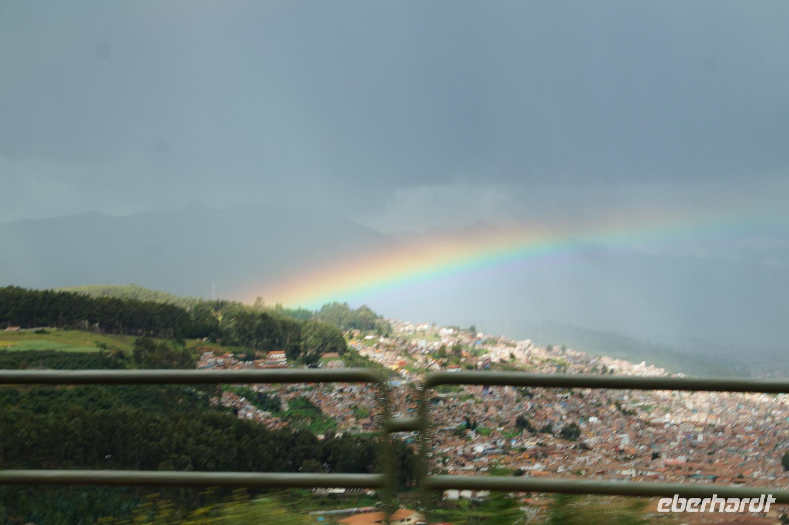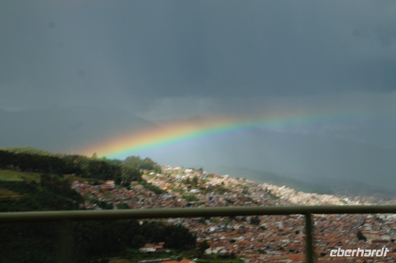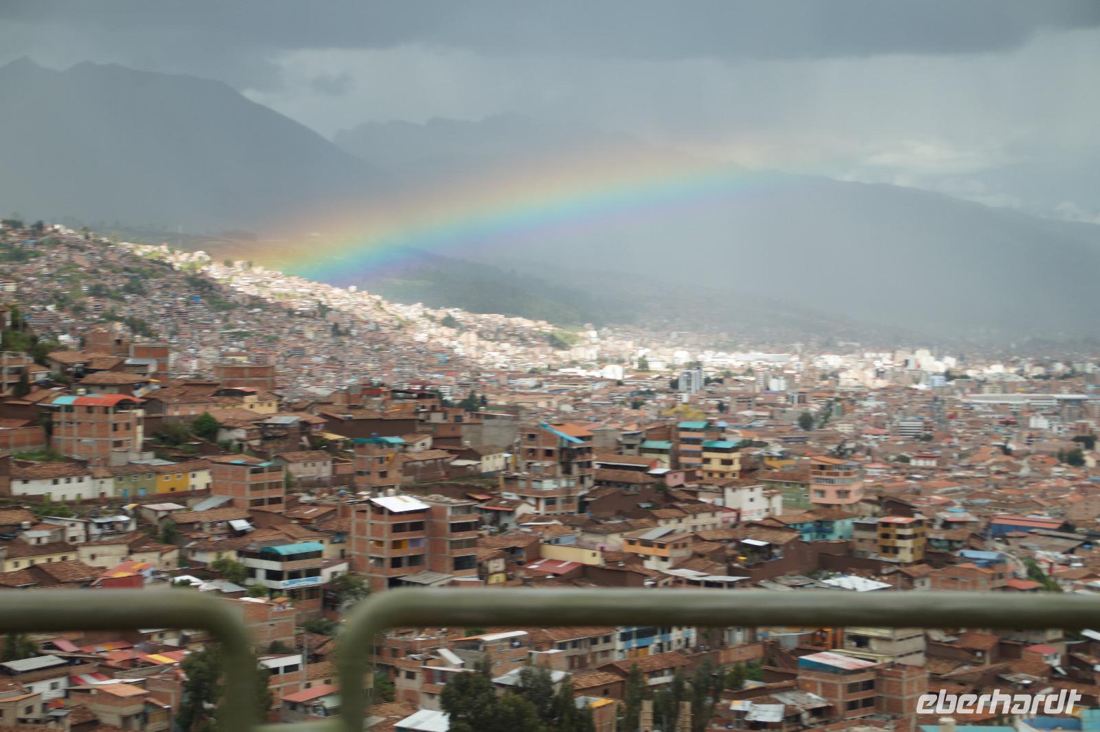 Nach dem Frühstück holt Mijaíl uns zur Stadtführung ab. Erste Station ist die Plaza de San Francisco, die von der Franzikuskirche beherrscht wird. Wir erfahren, dass im inkaischen Qosko (Nabel [der Welt]) dies ein Teil des Hauptplatzes war, gemeinsam mit der Plaza de Armas (oder Plaza Mayor], einige Straßen weiter. Im Prinzip sind das heute drei Plätze (Plaza Mayor, Plaza El Regocijo, Plaza de San Francisco), dazwischen feste Bebauung, z.T. aus der Kolonialzeit. In einem Hofeingang sehen wir ca. 500 Jahre altre Fresken. Obwohl Cuzco uns mit Regen begrüßt hat, ist die Stadt doch eigentlich recht trocken.